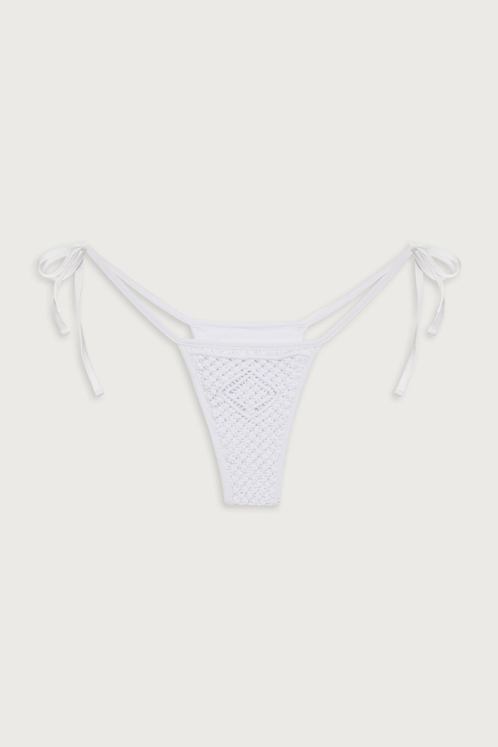 Designed with a low-rise fit and skimpy coverage, the Naia bikini bottom is an ultra-flattering beachside silhouette. Naia is crafted with an adjustable tie side design and soft-knotted macrame fabric. Pair this bikini bottom with the matching Naia bikini top as your go-to travel set. Fabric 80% Nylon + 20% Spandex Flat Swim Skimpy Coverage Adjustable Side Ties Model Size & Fit This style runs true to size Jasmine is wearing a size Small Height 5’9” (175cm) Bust 34" (86cm), Waist 23.5" (60cm), Hips 34” (86cm)