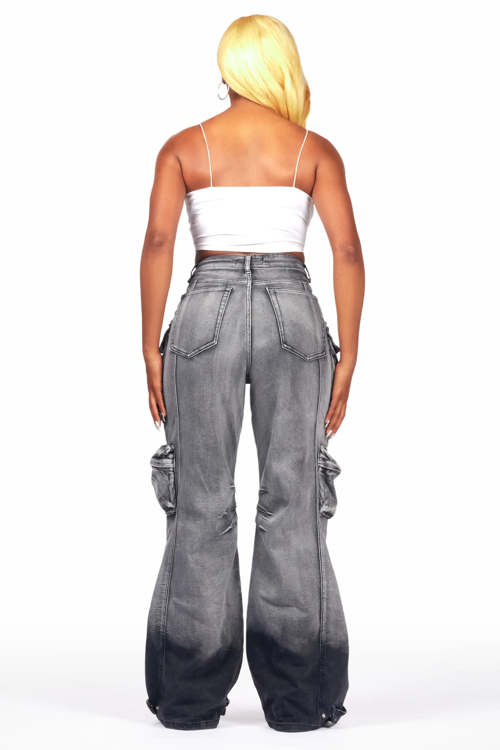 An urban wide-leg cargo jean for women in grey wash. Designed with organic cotton and a baggy silhouette for a must-have streetwear style. Zip fly with button closure 11-pocket build Distressed detailing Ombre designing Wide-leg fit Baggy denim construction
