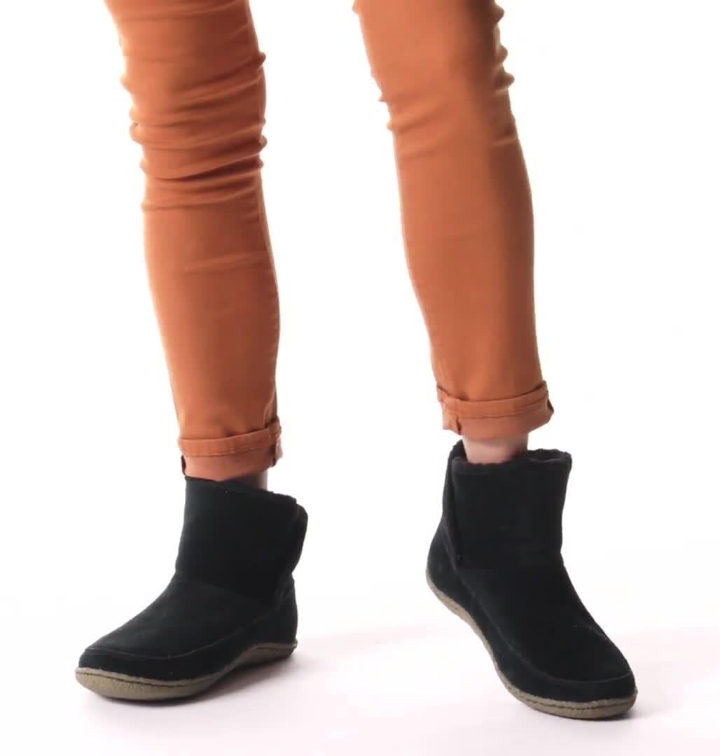 Slipper bootie with sturdy rubber sole for traction. Faux shearling liner and suede upper provide premium warmth and style.