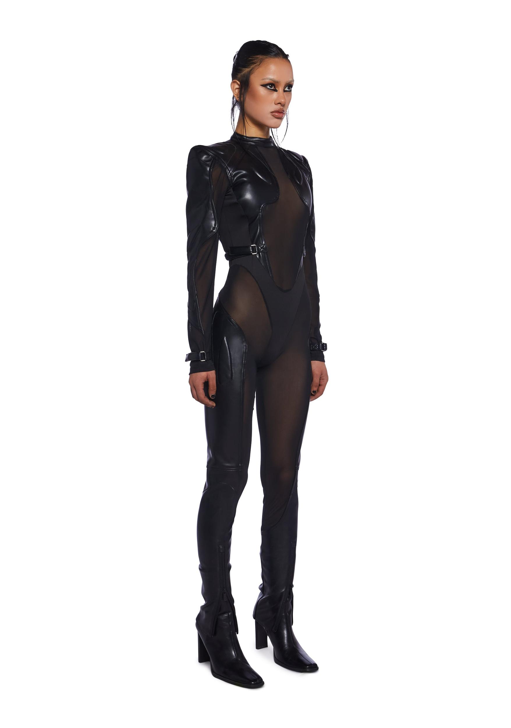 Namilia Vegan Leather Sheer Mesh Moto Full Bodysuit - Black
