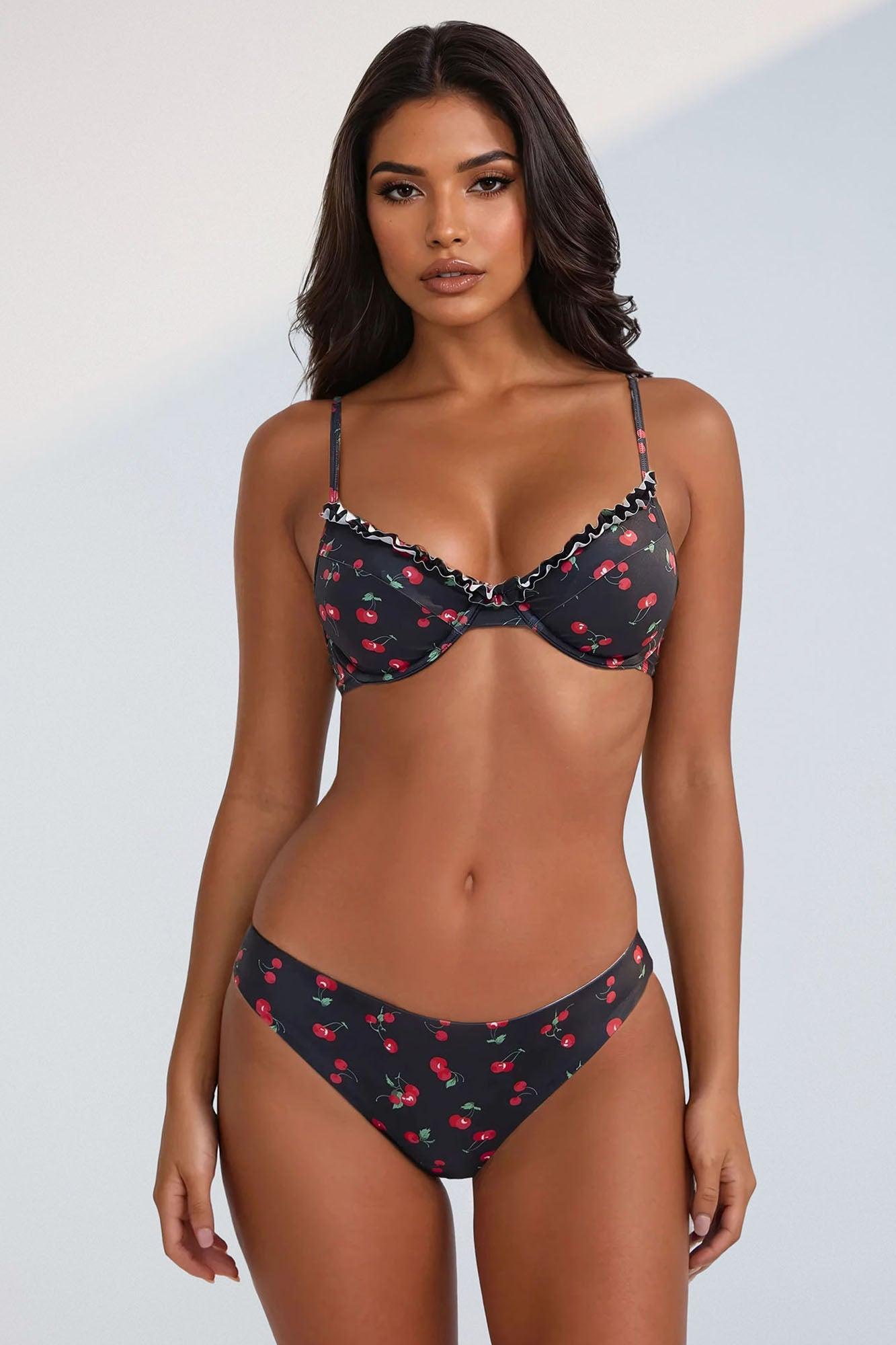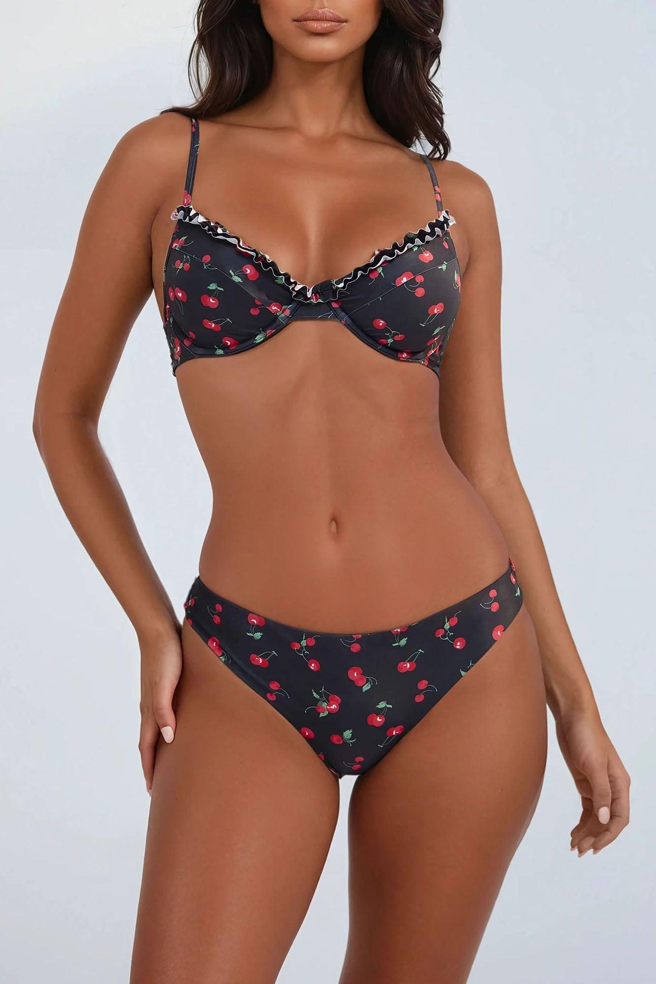 Available In Black/combo. 2 Piece Bikini Cherry Print Underwire Bikini Top Removable Cups Adjustable Straps Ruffle Trim Bikini Bottom Cheeky Disclaimer: Print Placement May Vary Full Stretch Final Sale Shell: 82% Nylon 18% Spandex Lining: 92% Polyester 8% Spandex Imported