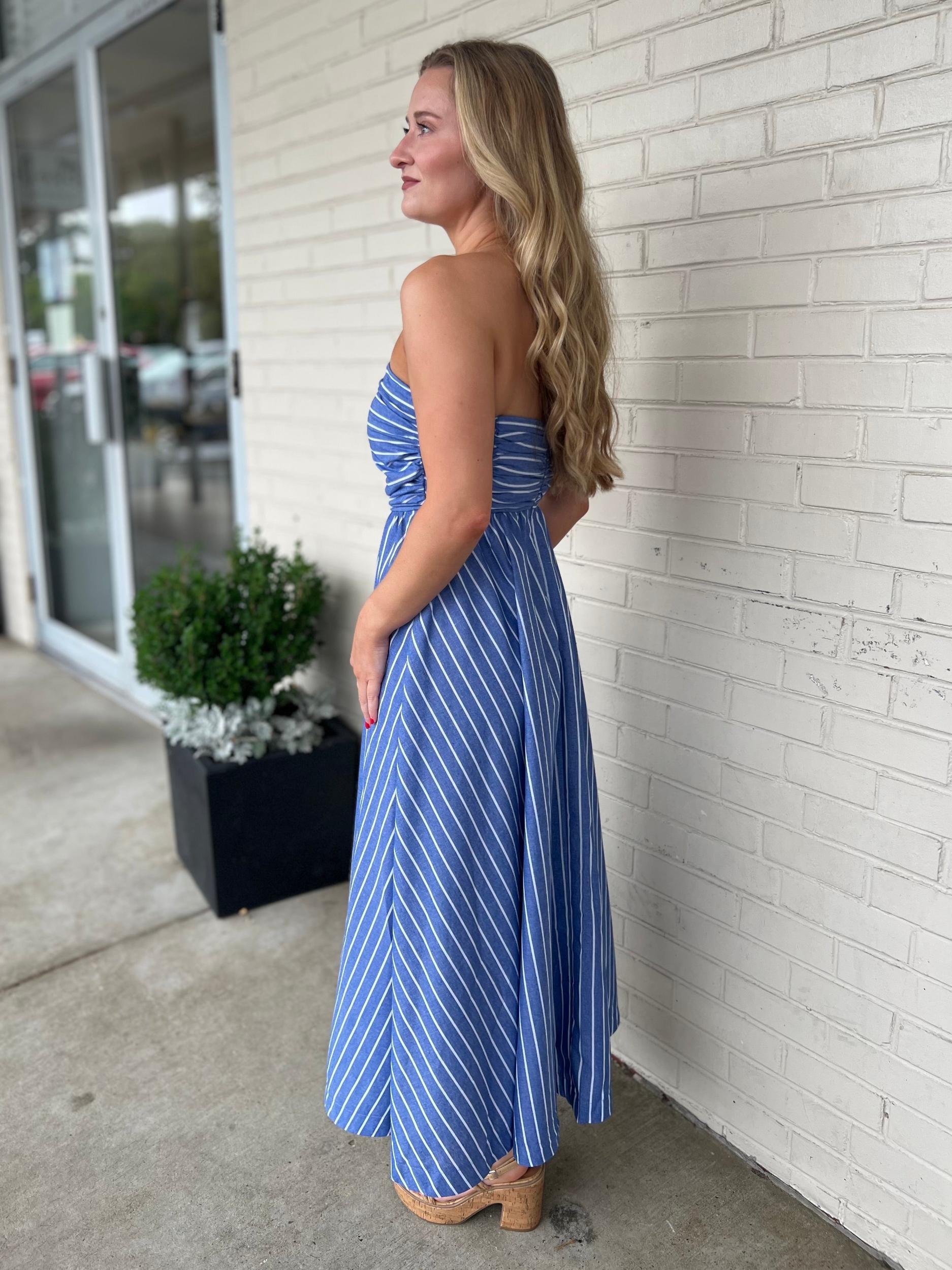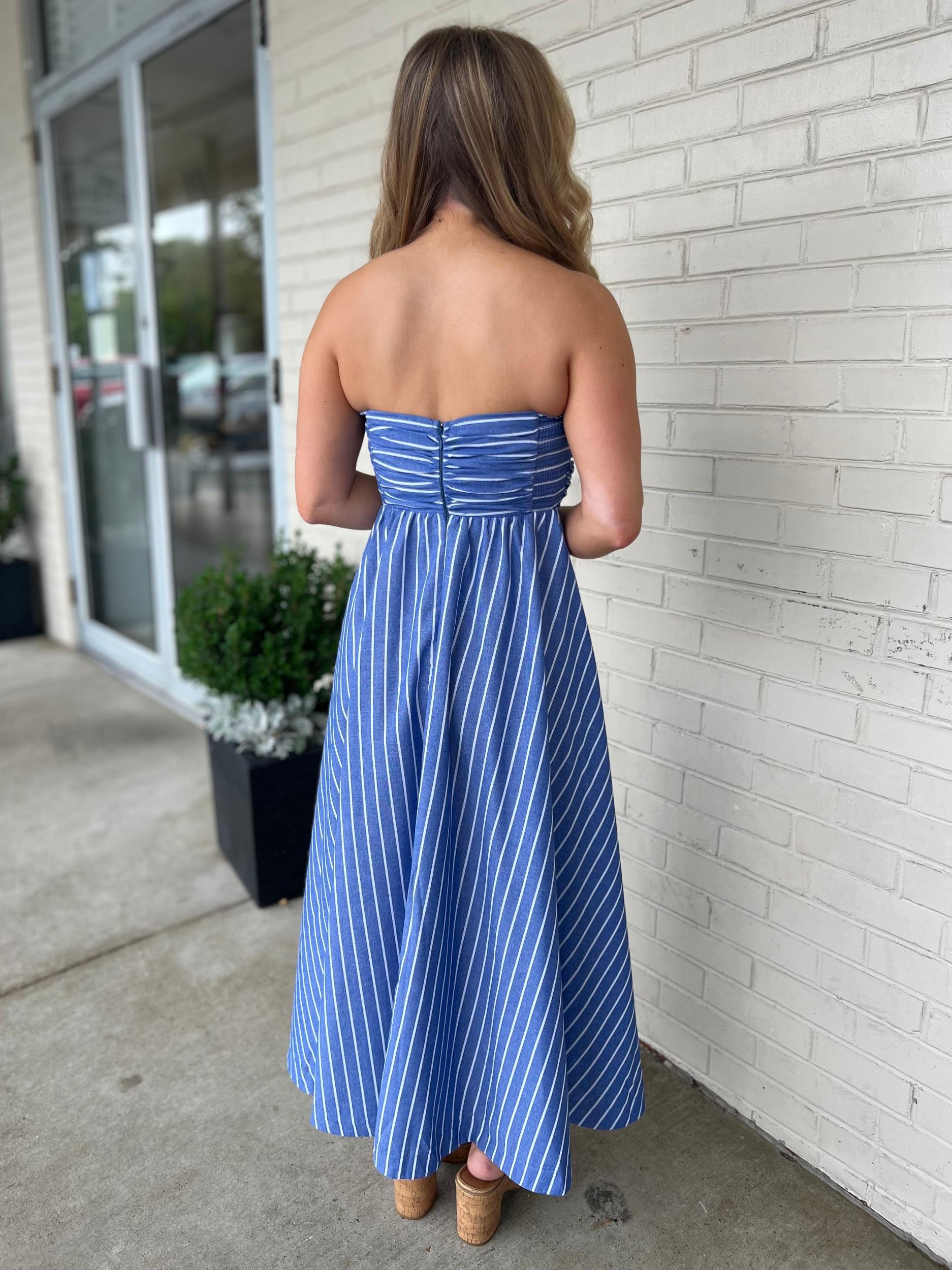 This playful Nancy Dress features a strapless design in a chic dark blue with crisp white stripes, perfect for sunny days and evening fun. The back zipper closure ensures a snug fit while keeping things easy and breezy. Its midi length adds a flirty touch, making it a go-to for casual outings or lively gatherings. Embrace effortless style with this charming dress that’s as fun as you are!