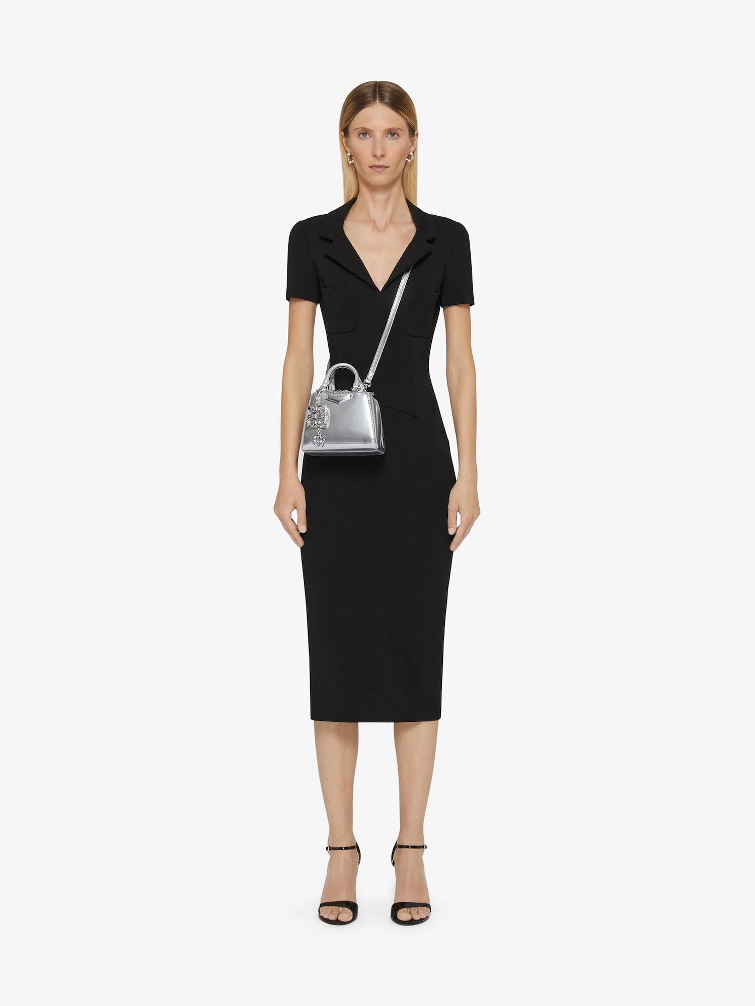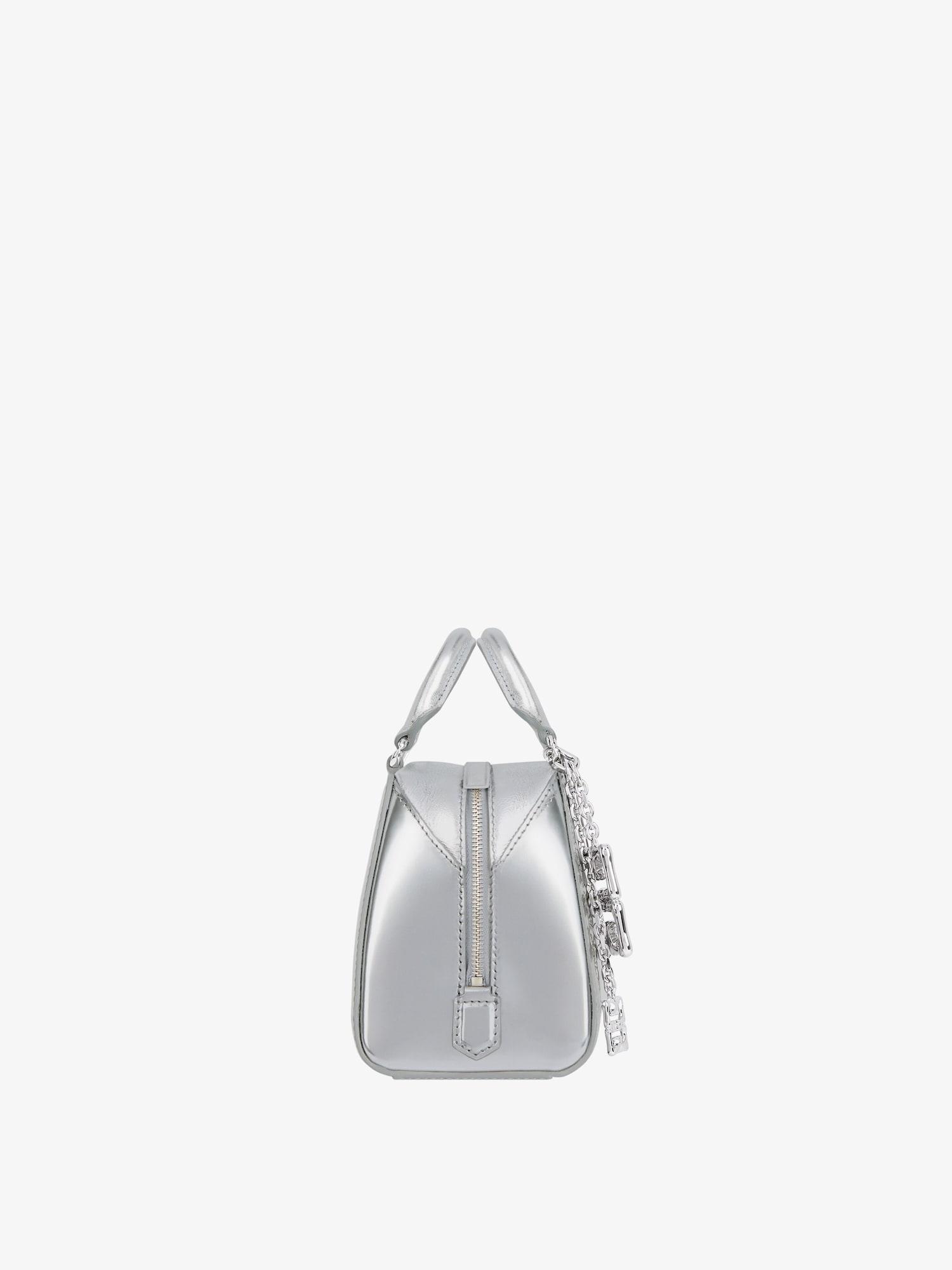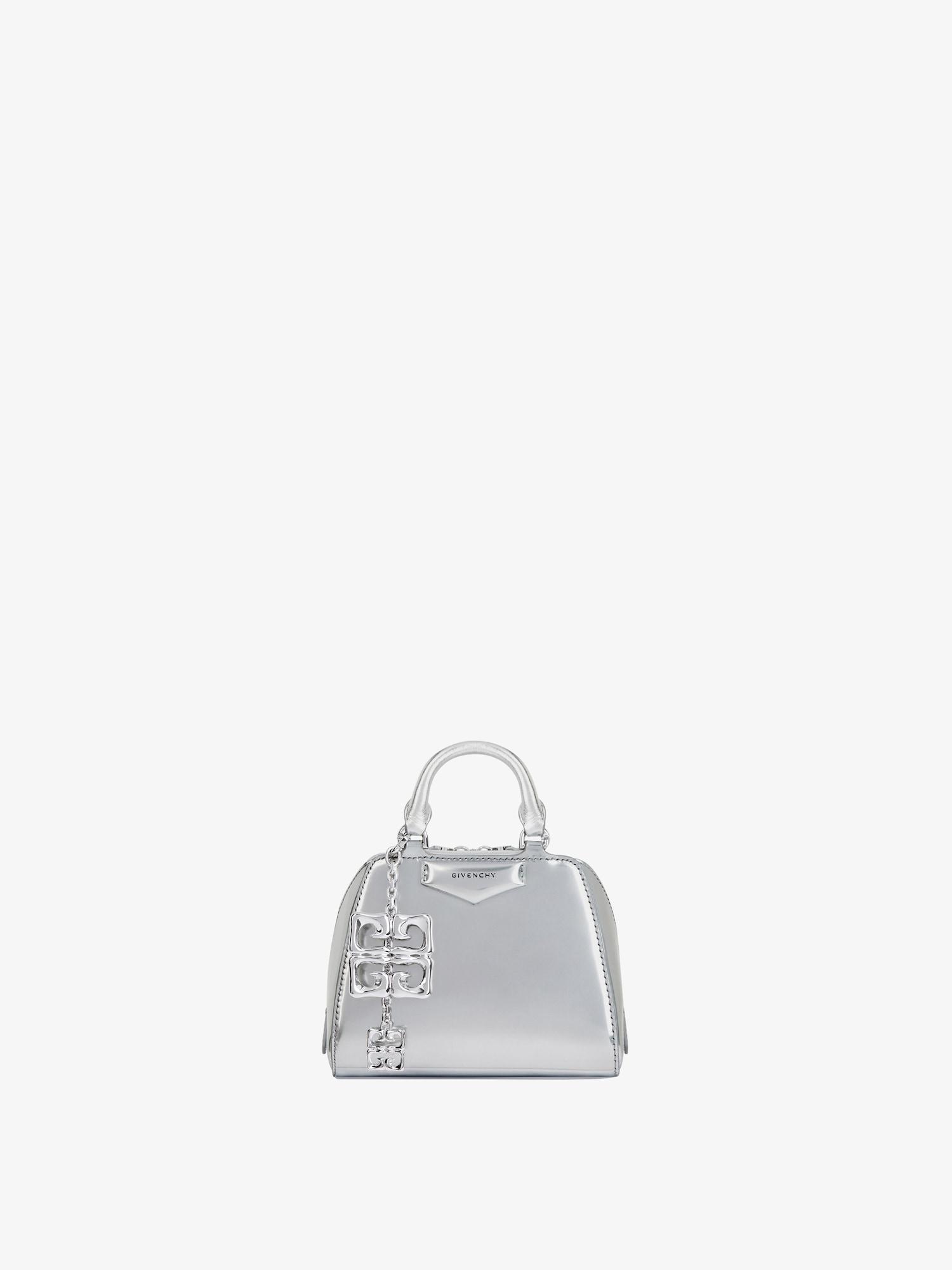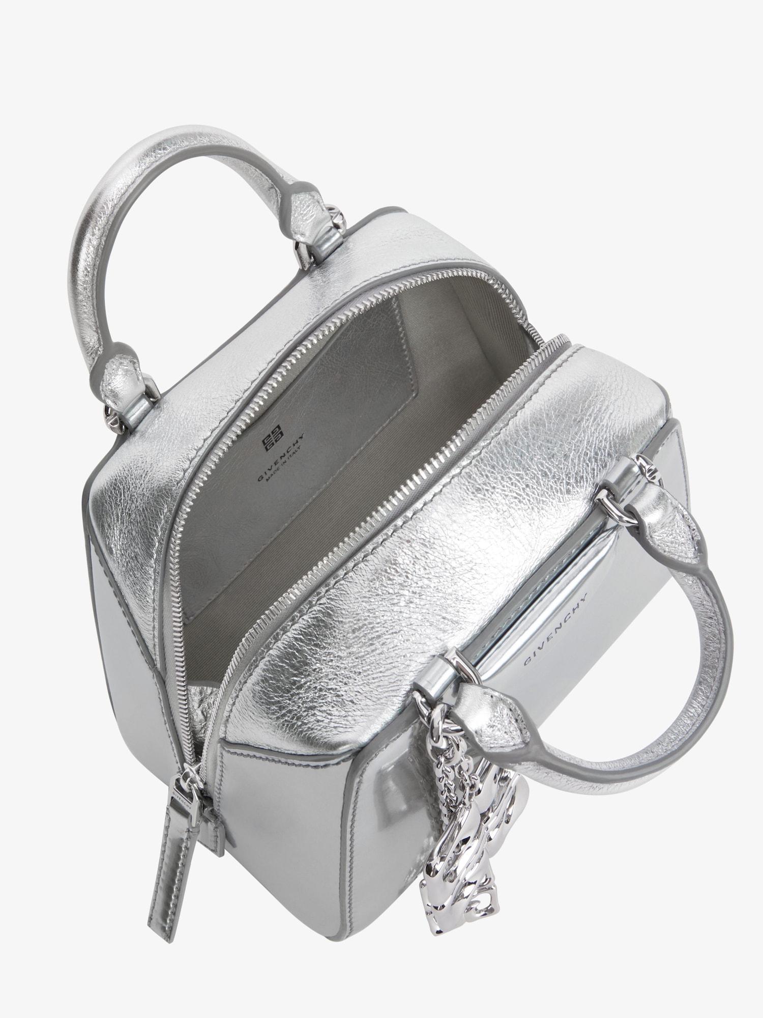 Nano handbag or crossbody bag in laminated calfskin leather. Antigona Cube line. Modular cubic shape thanks to origami-style gusset construction. Zipper closure with GIVENCHY 4G zipper pull. Articulated leather handles with four D-Rings for the shoulder strap and 4G Liquid charm. Adjustable and removable leather shoulder strap. Pentagonal patch with silvery embossed GIVENCHY signature on the front and 4G emblem on the back. Silvery-finish metal details. One main compartment with one card slot inside.