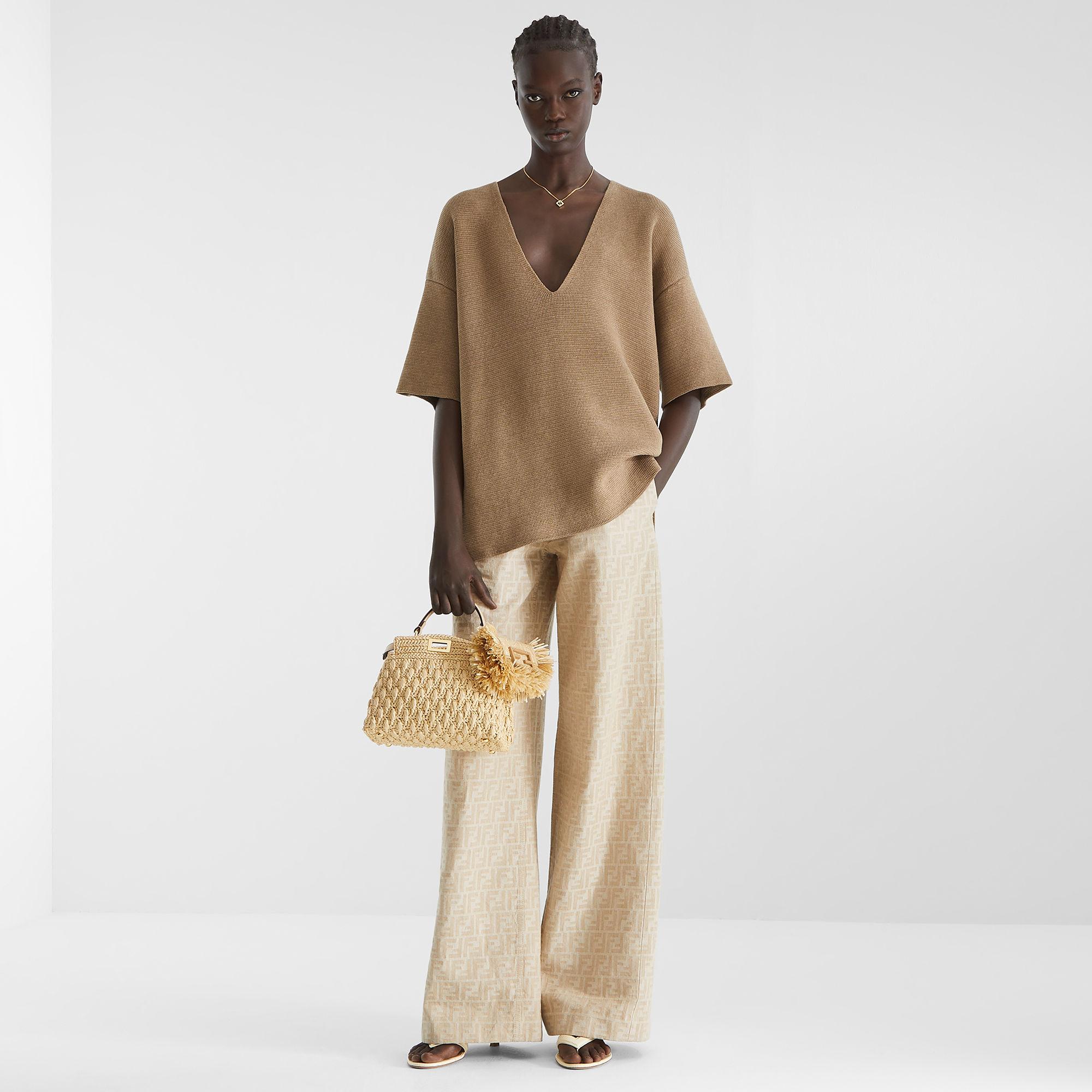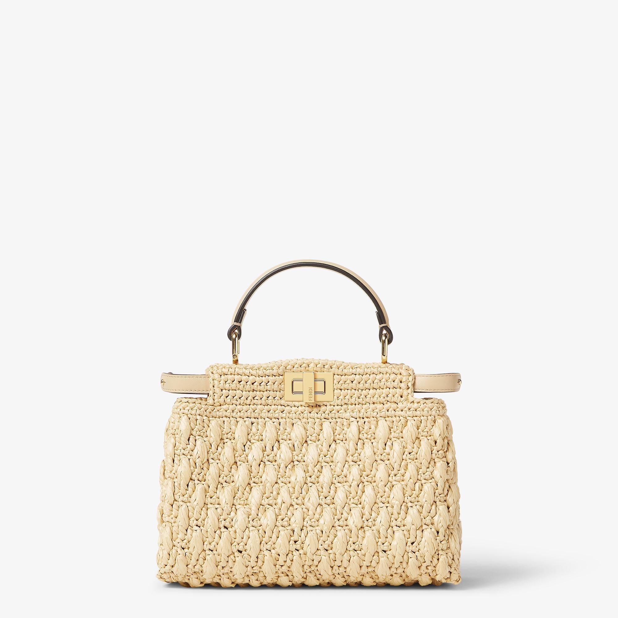 Iconic small Peekaboo bag, the epitome of Fendi craftsmanship and creativity. A timeless icon, the Peekaboo was created in 2009. Like the children’s game it takes its name from, peek-a-boo, the bag plays with the beauty showcased on the outside and that concealed on the inside. Made of viscose fibre woven entirely by hand, alternating different crochet stitches to create a refined droplet texture. Featuring an partially lined interior, two internal compartments divided by a stiff partition and an internal pocket in soft, beige nappa leather. Gold-finish bar, closure and metalware. Decorated with the iconic twist lock on both sides. The bag can be carried by hand or worn either on the shoulder or cross-body thanks to the handle and adjustable, detachable beige calfskin shoulder strap. Made in Italy