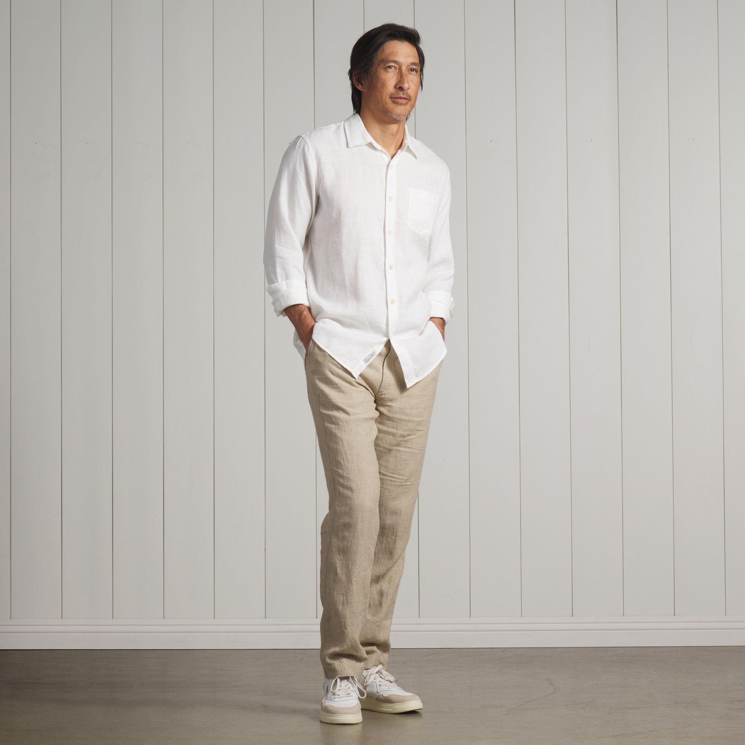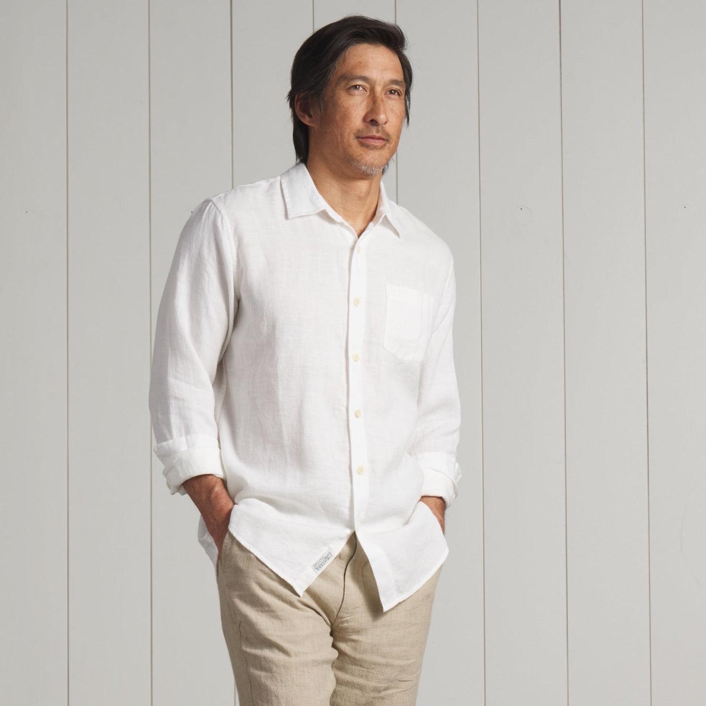 The classic line shirt is back. Crafted with premium top dyed linen, this light weight shirt will carry you through the summer in comfort and style. The Model is also wearing: Aventura Washed Linen Pants - Safari and Corduroy Trail Short 8" - Copen Blue. Model: Adrian is wearing size medium and is 6'. ----Details---- Premium top dyed yarn Spread collar Single chest pocket Enzyme washed Natural button Imported ----Materials---- 100% Linen ----Size & Fit---- Measuring Method: All measurements are in inches and based on a flat garment, as shown below. For comparison with one of your existing garments, please lay garment on a flat surface and follow the key measurement points. For chest and neck, if you double the flat measurement, you will get close to the full body measurement. ----Care---- Machine Wash Warm With Like Colors Do Not Bleach Tumble Dry Low Use Cool Iron If Necessary