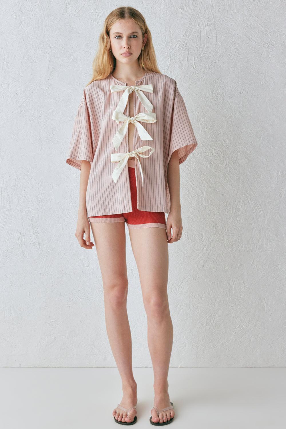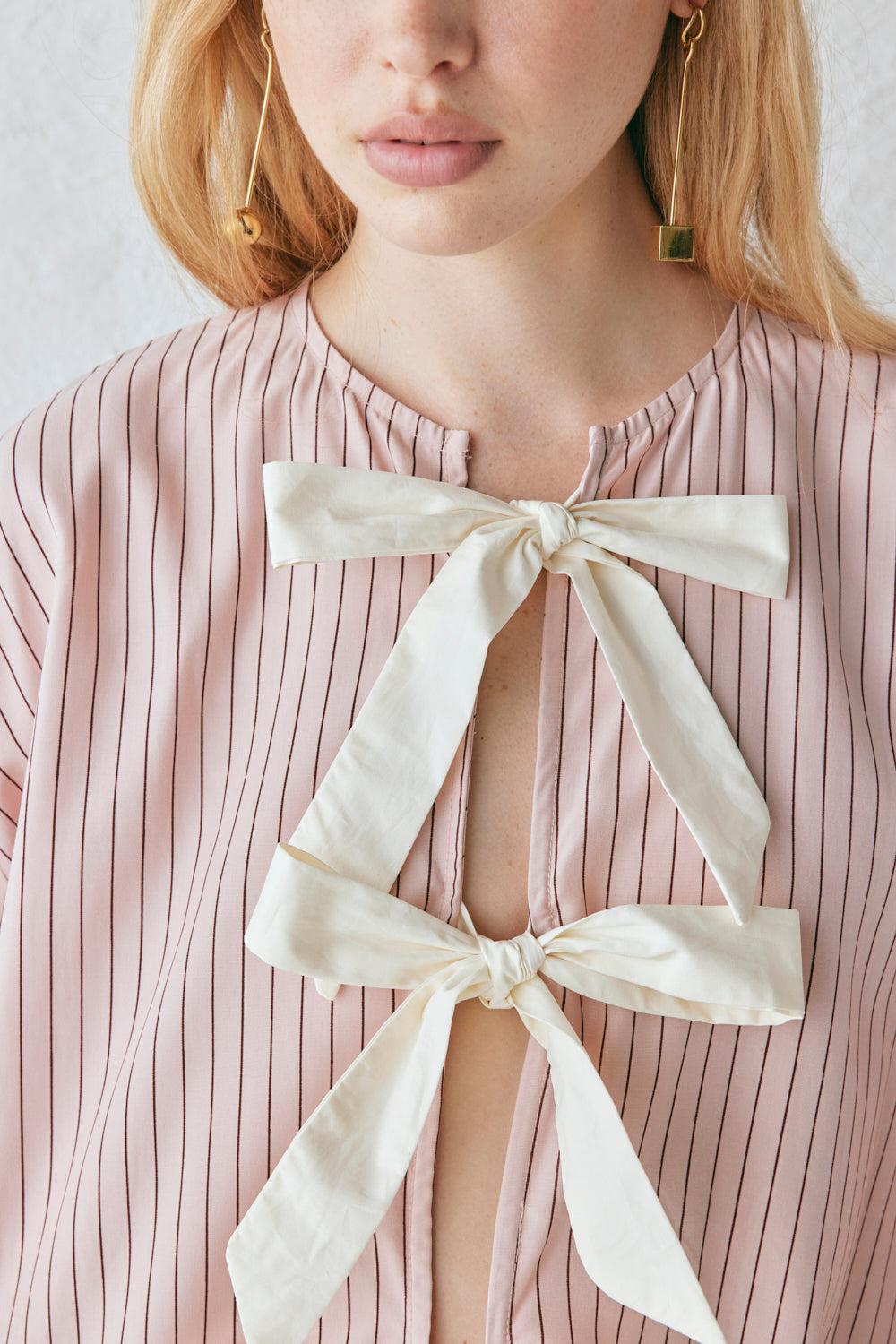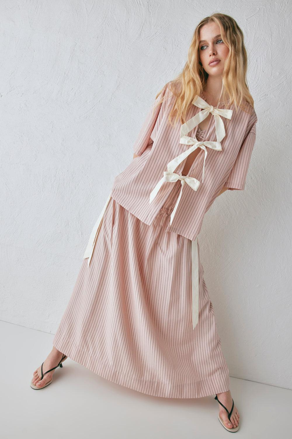 The Naomi Smock Top now in a pink stripe print. Features contrast front ties & made to be a boxy fit. Designed in Australia.