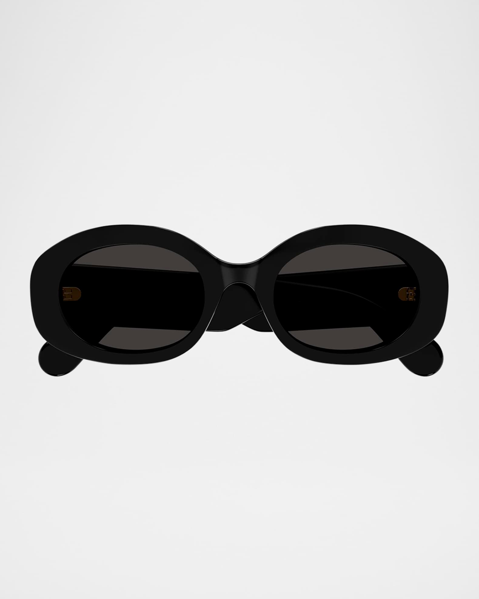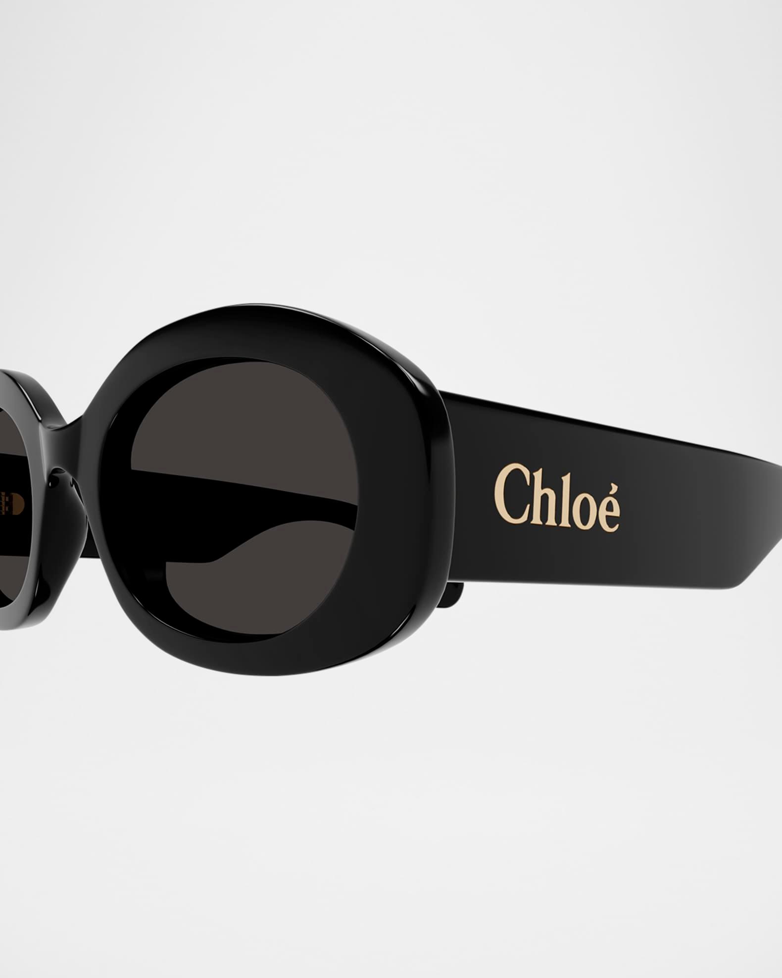 Chloe "Naomy" oval sunglasses in acetate Eye/bridge/temple (in mm): 53-22-145 Solid lenses in bio-based nylon Saddle nose bridge Contrasting logo on the left temple Wide, tapered arms 100% UVA/UVB protection Made in Italy Proposition 65 warning for California residents