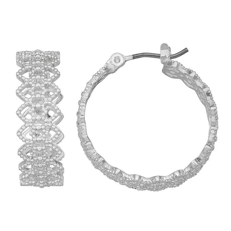 Make a statement with these lacy hoop earrings. Make a statement with these lacy hoop earrings. EARRING DETAILS Length: 0.87 in. Backings: click-it Metal: alloy Finish: textured Nickel safe Not appropriate for children 14 years old and younger. Size: One Size. Color: Silver. Gender: female. Age Group: adult. Material: lace.
