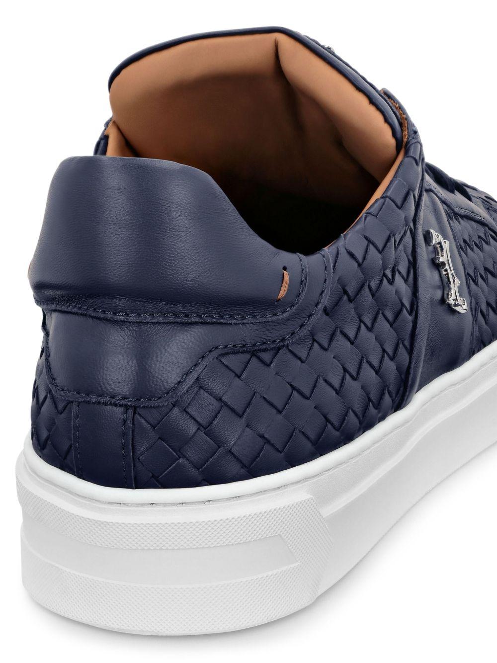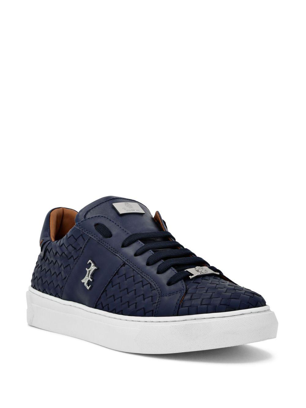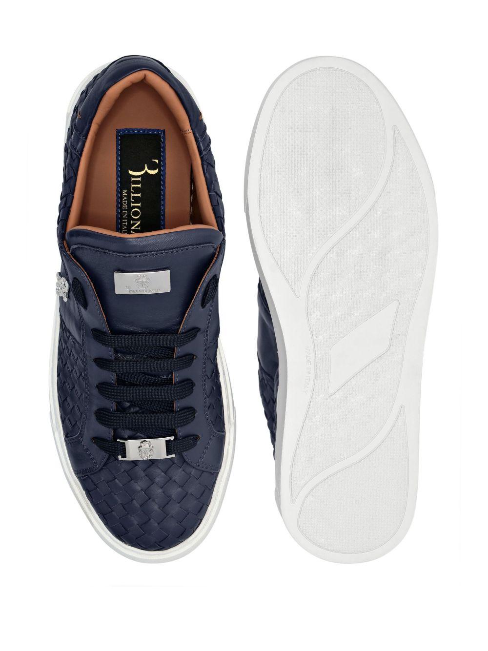 Billionaire nappa-leather low-top sneakers | Blue | navy blue | nappa leather | interwoven design | front lace-up fastening | logo plaque at the tongue | padded ankle | silver-tone logo lettering | round toe | branded footbed | flat rubber sole | Rubber/Calf Leather/Calf Leather | Low-Tops | Sneakers | Shoes | Men
