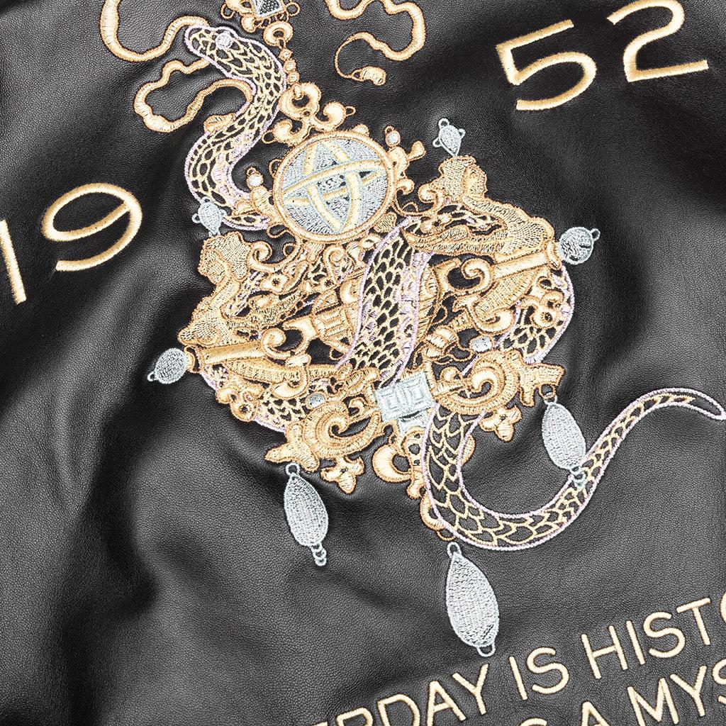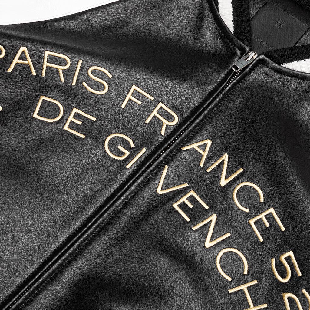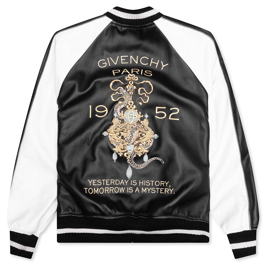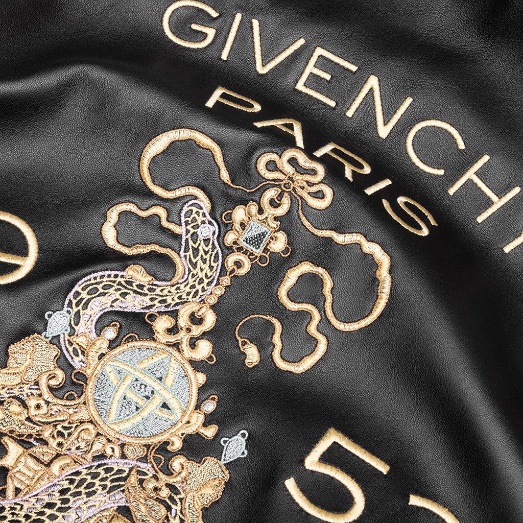 The Givenchy Embroidered Jacket reimagines the varsity silhouette with premium materials and intricate detailing. Crafted from 100% nappa lambskin, the leather construction delivers a refined feel, while the viscose lining ensures smooth comfort. The front features GIVENCHY embroidered writings, while the back showcases elaborate snake and chandelier embroideries, along with GIVENCHY mixed writings, blending heritage-inspired motifs. The ribbed knit collar, cuffs, and hem with contrasting stripes reinforce the jacket’s classic varsity aesthetic. Complete with a snap-button closure and two side pockets, the Givenchy Embroidered Jacket is a statement piece. 100% Lambskin Lining: 100% Viscose Zip closure Striped ribbed trims Embroidered branding Two-tone sleeves Hand pockets Style No: BM01886003-004