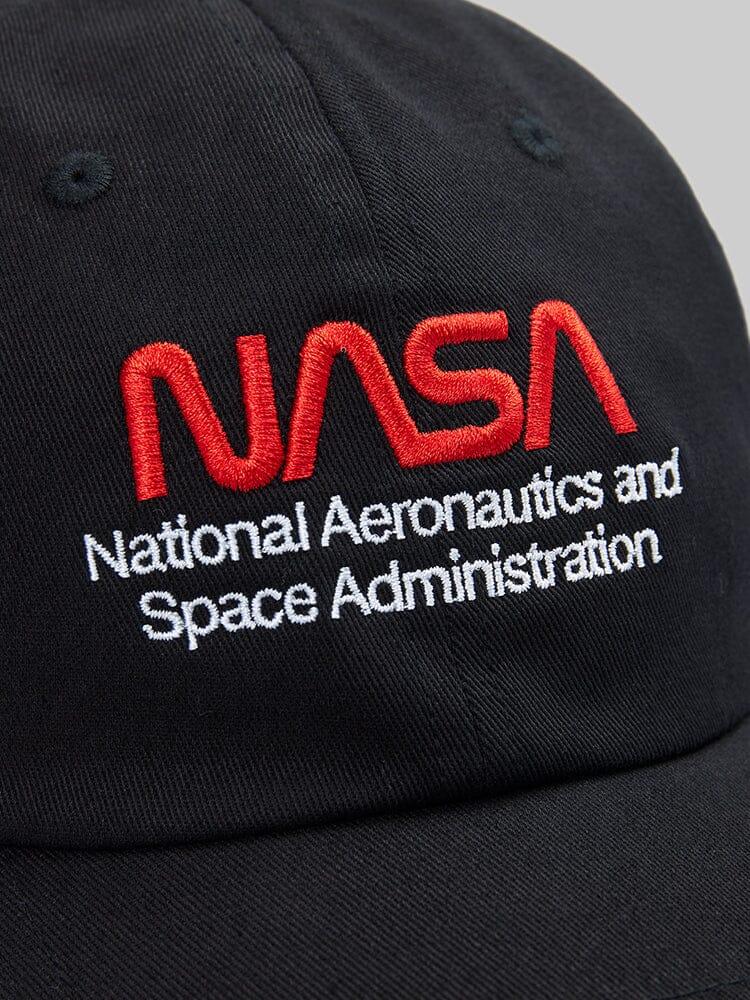 This comfortable hat commemorates NASA with themed embroidery. It features an adjustable strap with a metal clasp to maximize comfort. This classic red logo, so-called because of its worm-like letter styling, was used by NASA from 1975 to 1992.