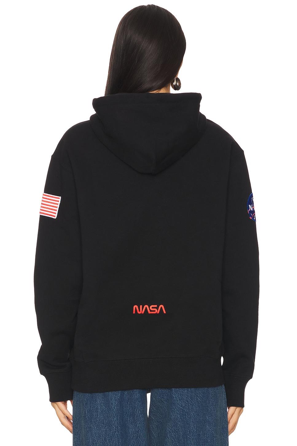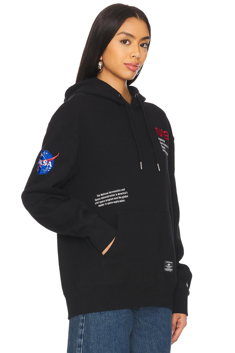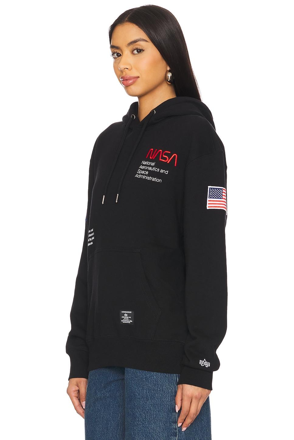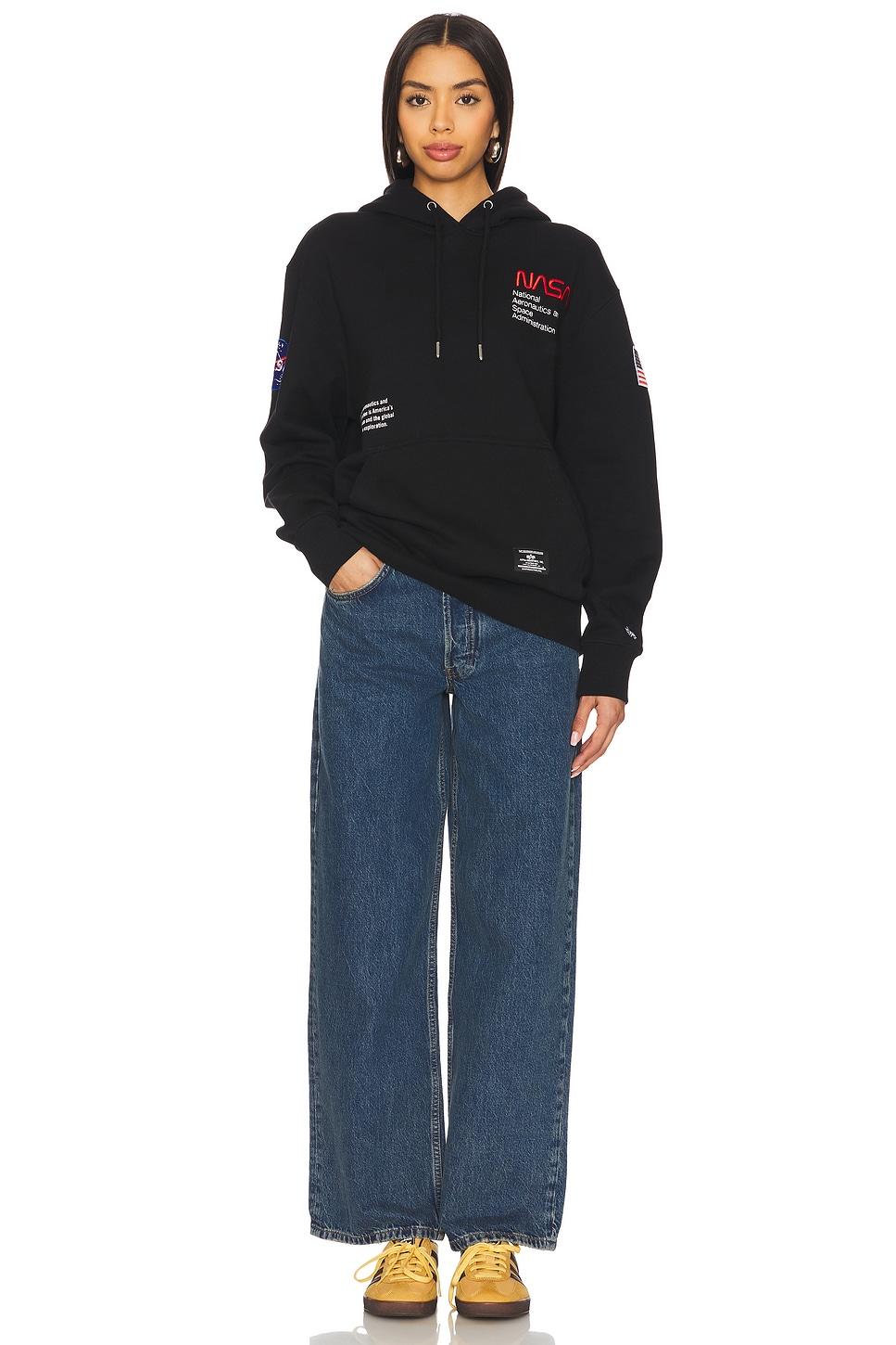 80% cotton, 20% polyester. Made in China. Machine wash cold. Pull-on styling. Kangaroo pocket. NASA worm logo on front and backNASA-themed graphic patches on sleeves. Midweight fleece fabric with hood. Revolve Style No. ALPR-WK2. Manufacturer Style No. USN53000C1.