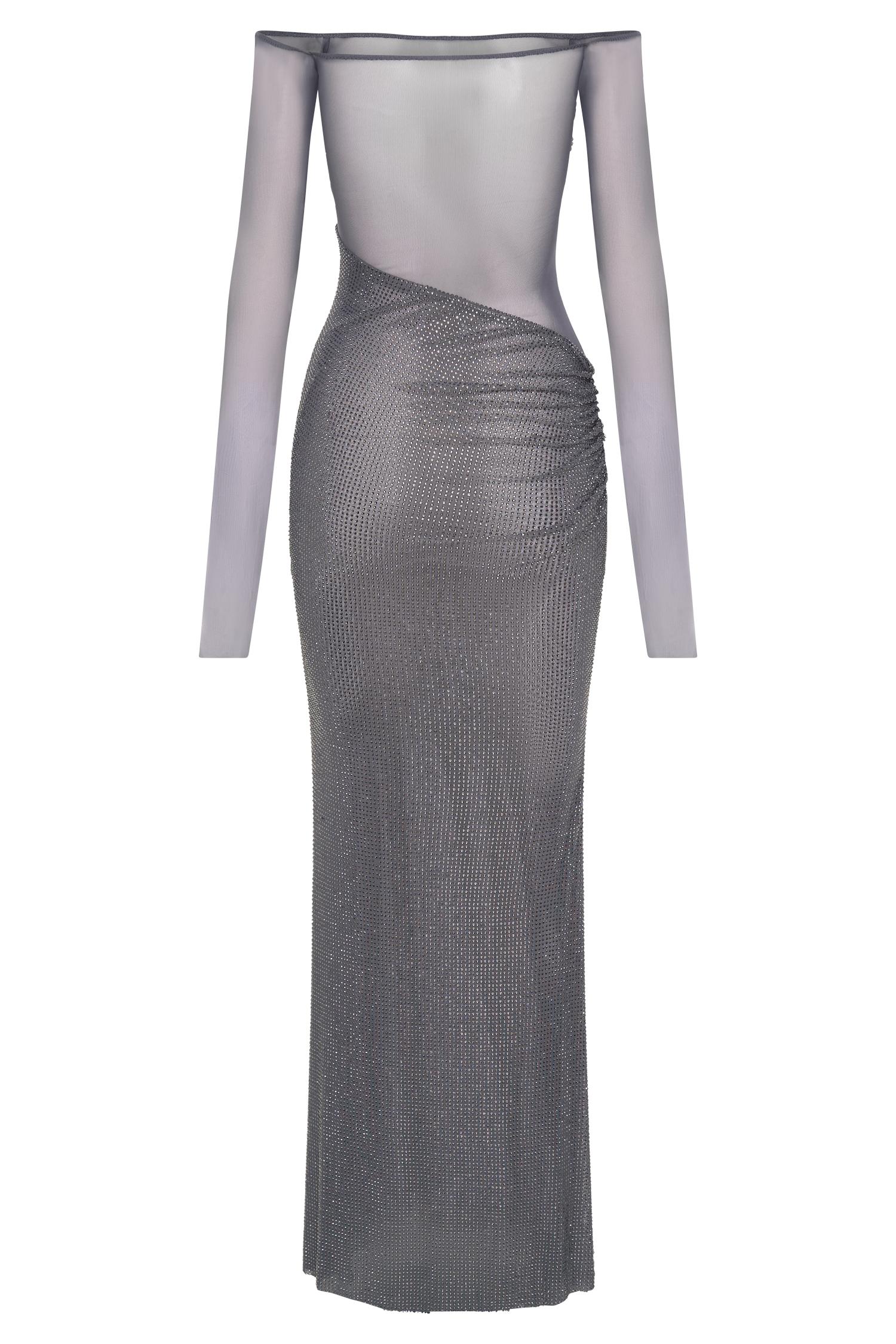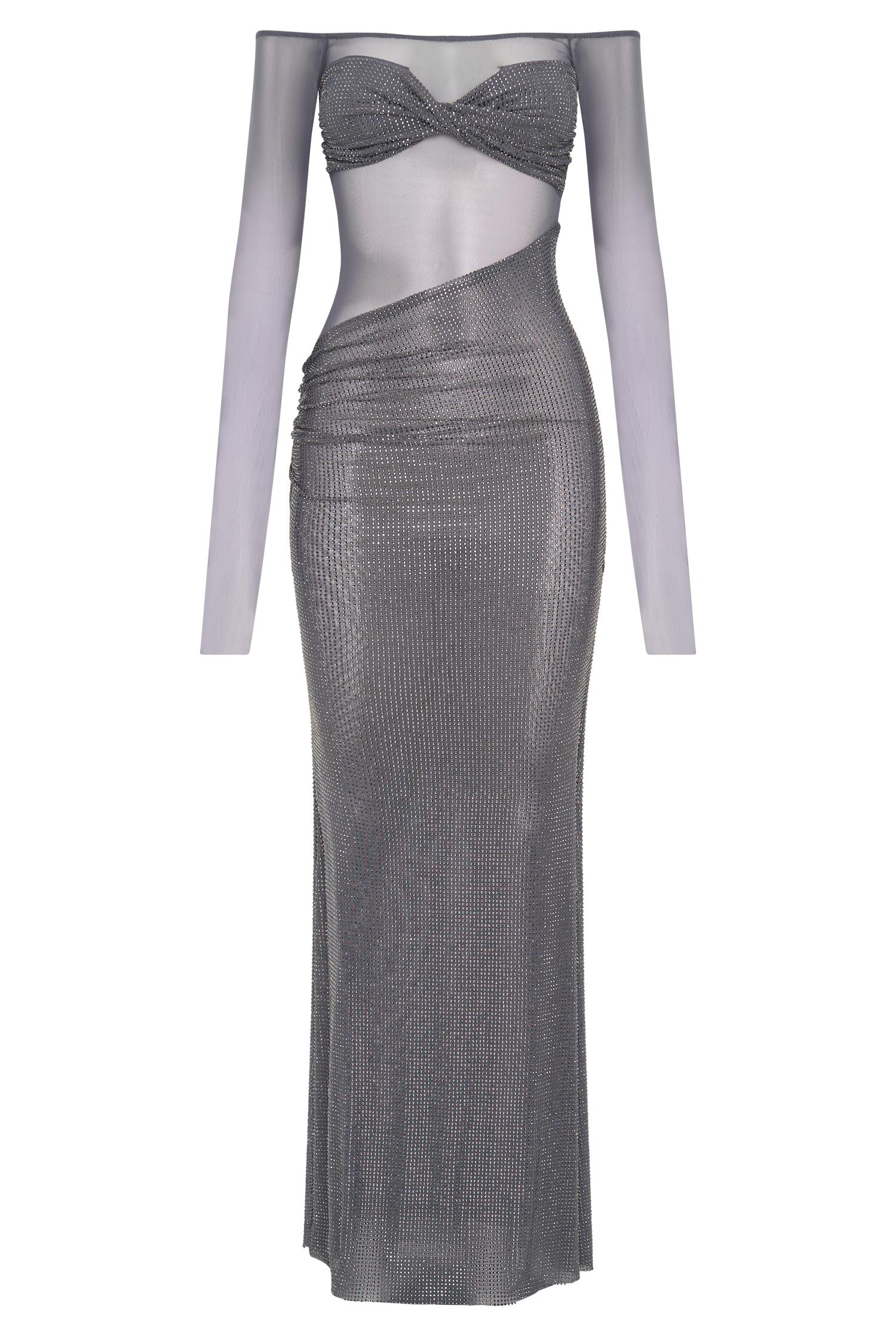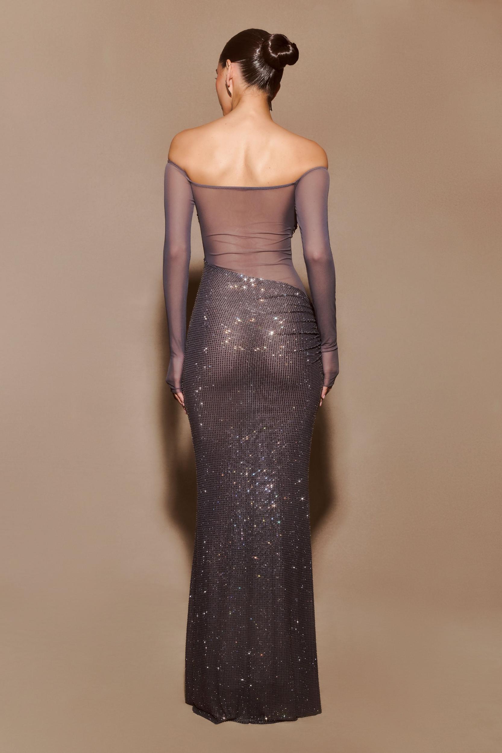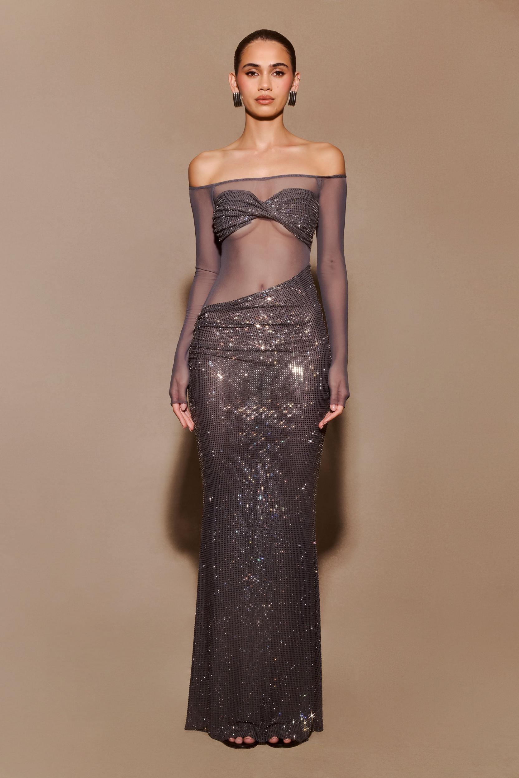 A dress as breathtaking as you are. The NASH Diamante Off Shoulder Maxi Dress is the perfect blend of glamour and sophistication. Designed with a flattering Bardot neckline and long sleeves, this dress exudes timeless elegance. The mesh fabrication creates a sultry, sheer effect, while the diamante contrast bust adds a touch of sparkle and luxury. A twist front detail elevates the design, and the diamante-adorned skirt brings a stunning shimmer with every step. The asymmetrical waistline, paired with gathering at the hip, enhances your natural curves. Crafted from stretch fabrication, this dress offers both comfort and style, making it a show-stopping choice for any special occasion. This garment is designed to be a bodycon fit. If you prefer a more relaxed fit, please size up.