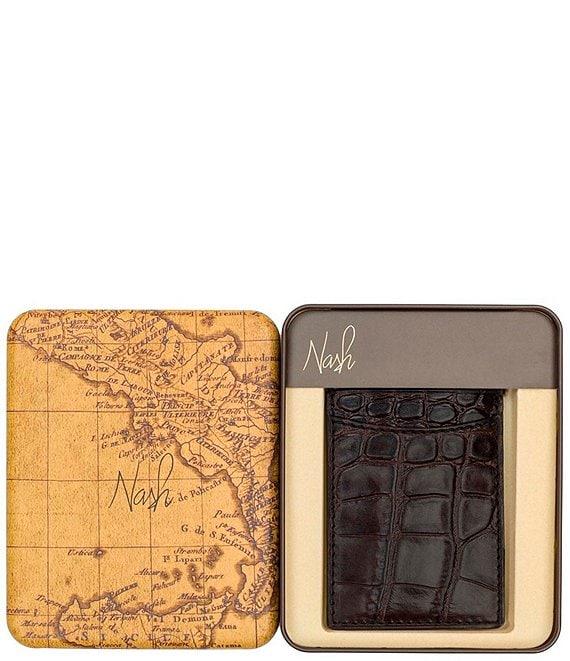 From Nash, money clip features: (1) x divided pocket (1) x credit card slots (1) x magnetic clip Signature map-print faille lining Burned-edge finish Heavy, handcrafted stitching Includes RIFD-blocking protection box 4 3/8” wide x 3 3/8” tall x ¾” deep Full-grain leather Imported.
