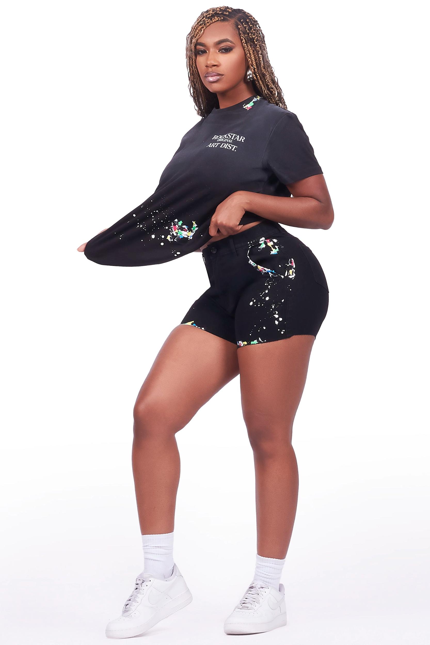 An urban two-piece graphic tee and denim short set for women. Designed with organic cotton and custom detailing for the perfect streetwear set. Rounded neckline Short sleeves Pullover style Regular-fit Zip fly with button closure 5-pocket build Form-fitting silhouette Stretch fabric Printed RSO logo Custom paint splatter