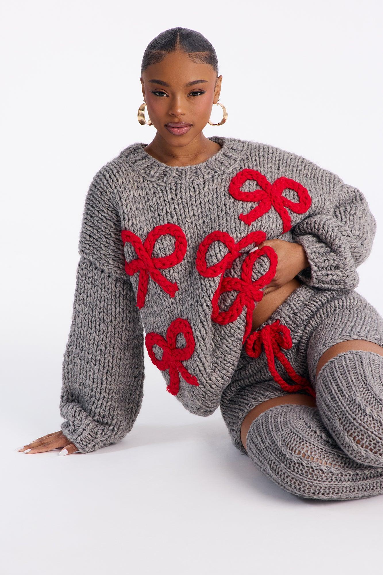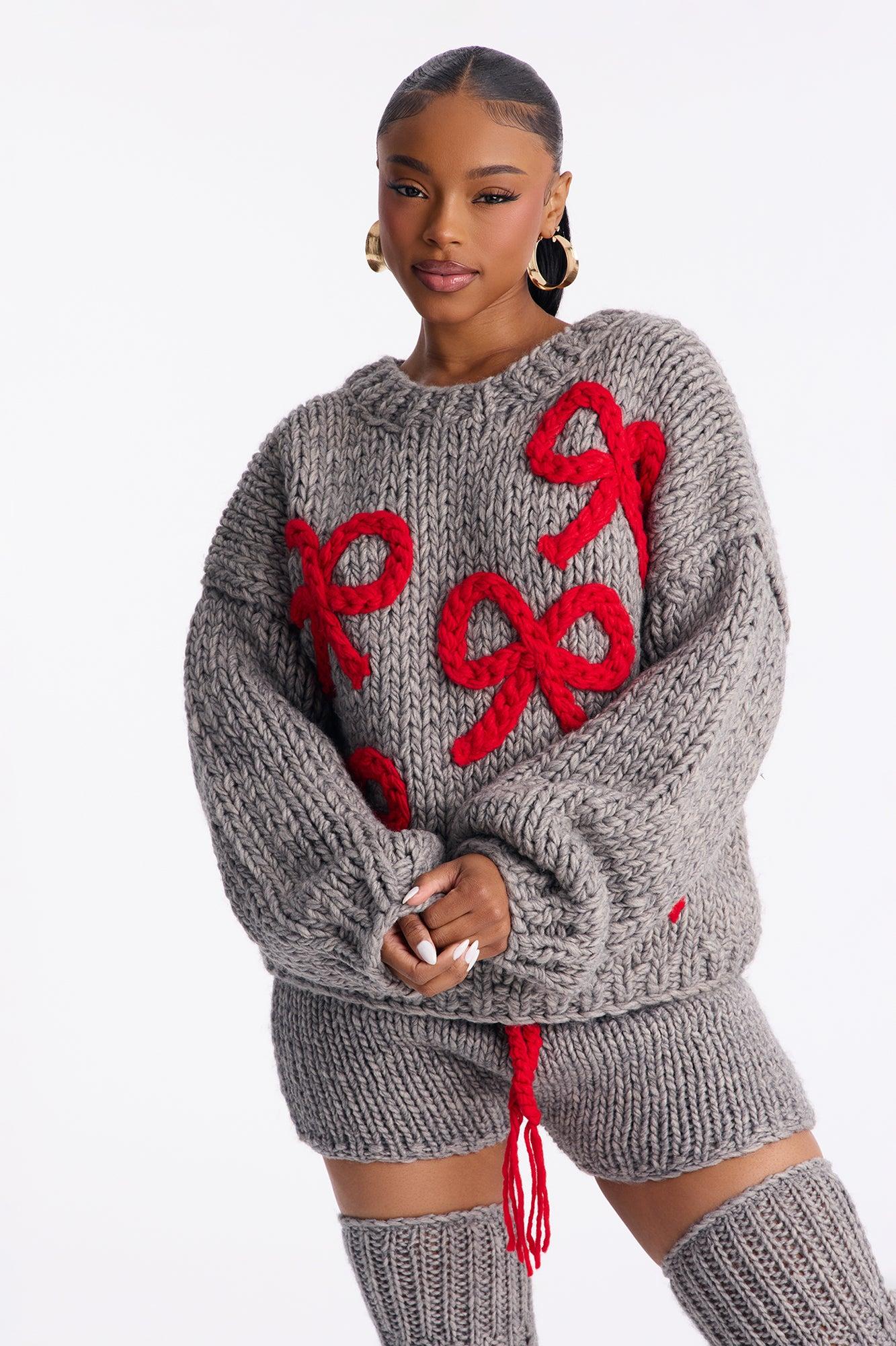 Available In Grey. 3 Piece Ensemble Sweater, Shorts, and Socks Set Stretch Embroidered Bow Detail Regular Skinny Shorts Self : 80% Acrylic 20% Viscose Contrast : 80% Acrylic 20% Viscose Imported