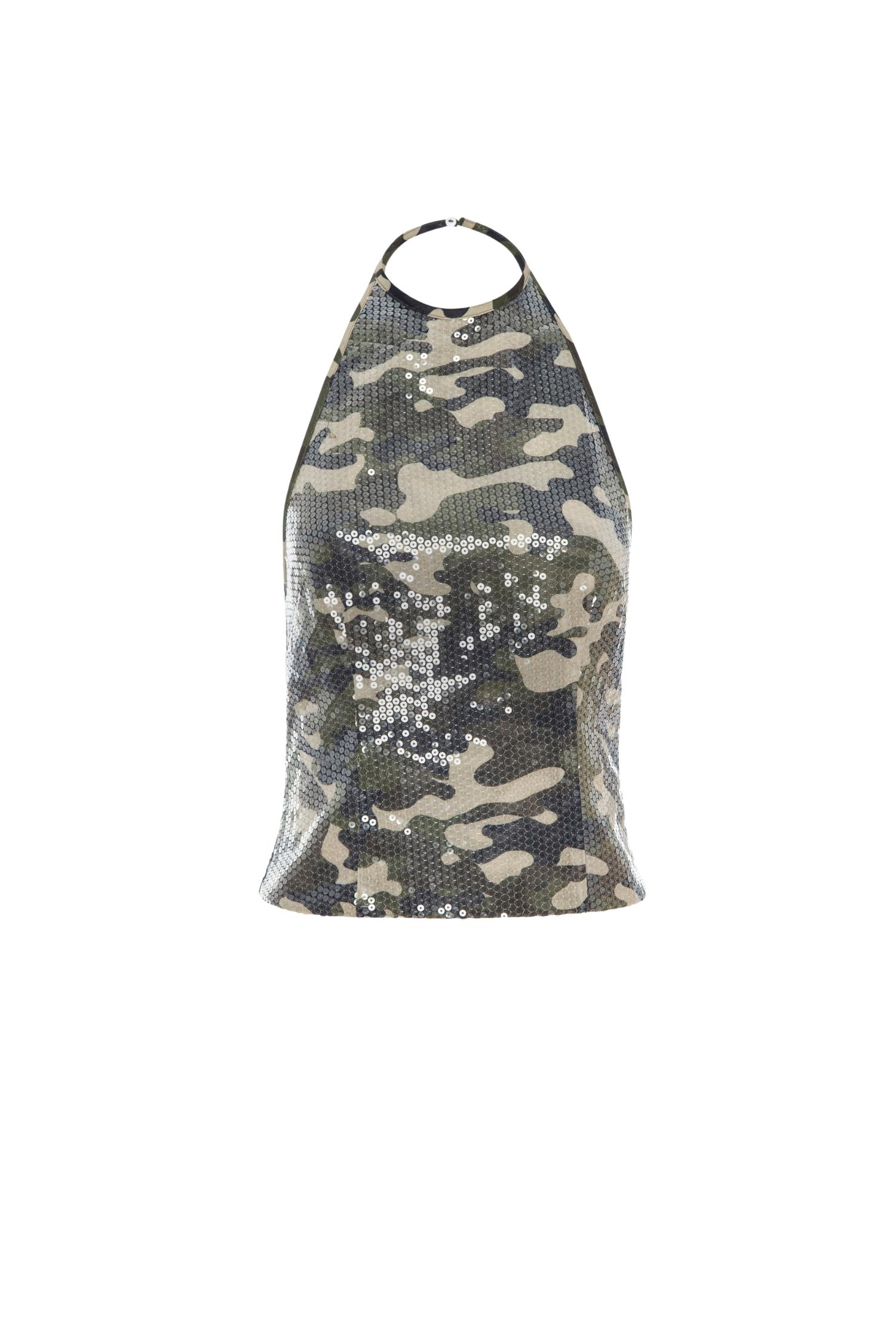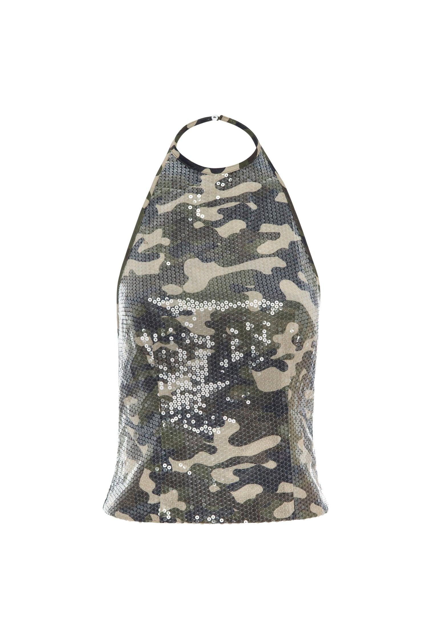 Meet the Natalia in Sequin Camo. Crafted from sequin mesh knit material, this tank features a button-closure halter, size zipper, and low back. Pair with the Ty Skirt in Camo.
