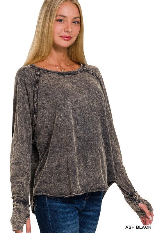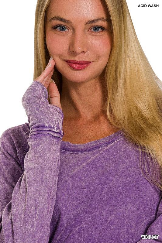Unleash your inner rebel in the Natalie Thumb Hole Cuff Top. Featuring crinkle acid wash, scoop neck, and thumb holes to keep sleeves down, this top adds an edgy yet classic touch to your wardrobe. Step out in style with this back-patch adorned top. Risk-takers rejoice! 100% Cotton Bust: 42" measured from Small Length: 25.5" measured from Small