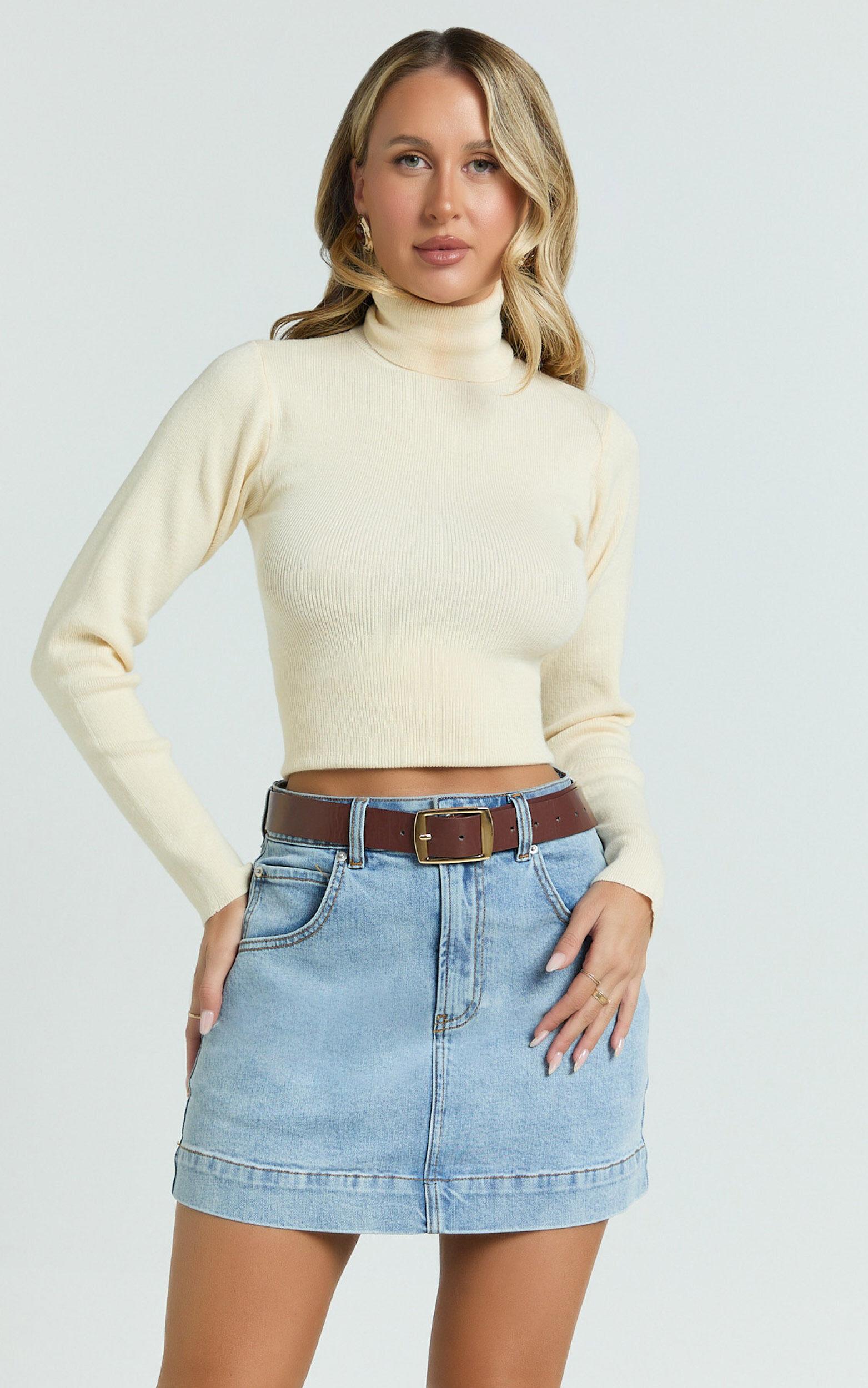 Natalie Top - Long Sleeve Roll Neck Knitted Top in Cream