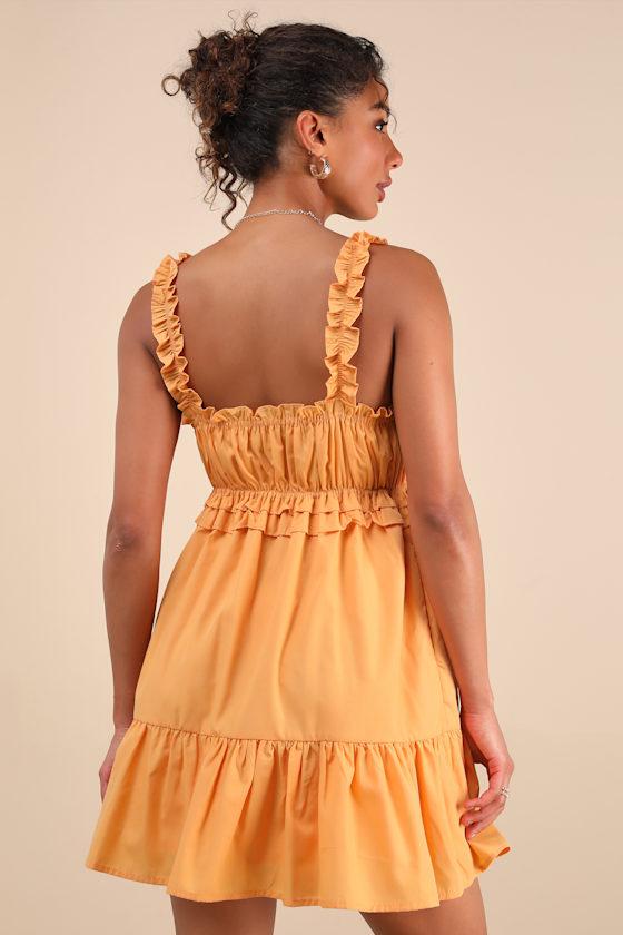 Step out looking like "sweet" is your middle name, thanks to this lightweight poplin dress that starts with elasticized ruffled straps that flow into a classic square neckline. The gathered bodice features an elasticized, ruffled empire waist that tops a floaty A-line mini skirt with a tiered hem for a playful finish.