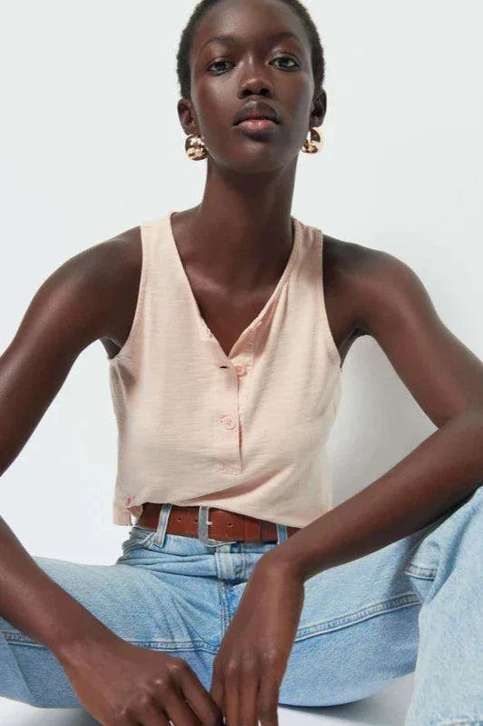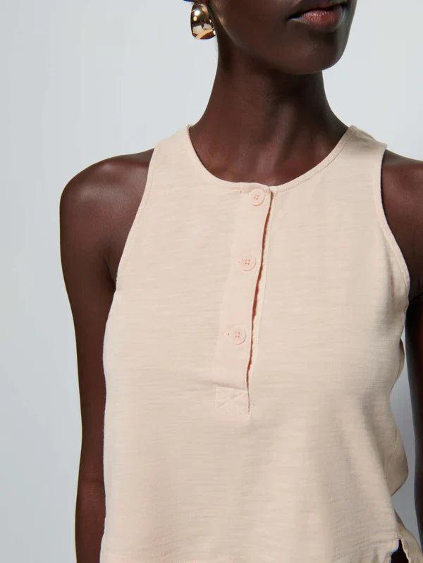 Elevate your classic tank game with the Nation LTD Bree Tank. Its button placket scoop neck and contrast Poplin insets add a touch of sophistication. With a length that hits right at the hips, this tank gives you endless styling options. Available in Bisque, it's versatile and chic!