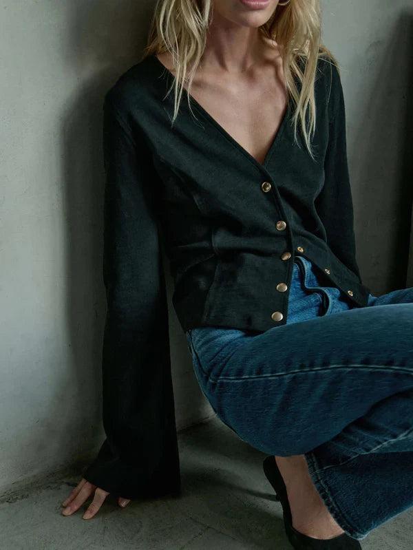 This subtle bell-sleeve top features a deep v-neckline with our signature gold snaps, and the perfect easy fit. Dress it up, dress it down (you know the drill).