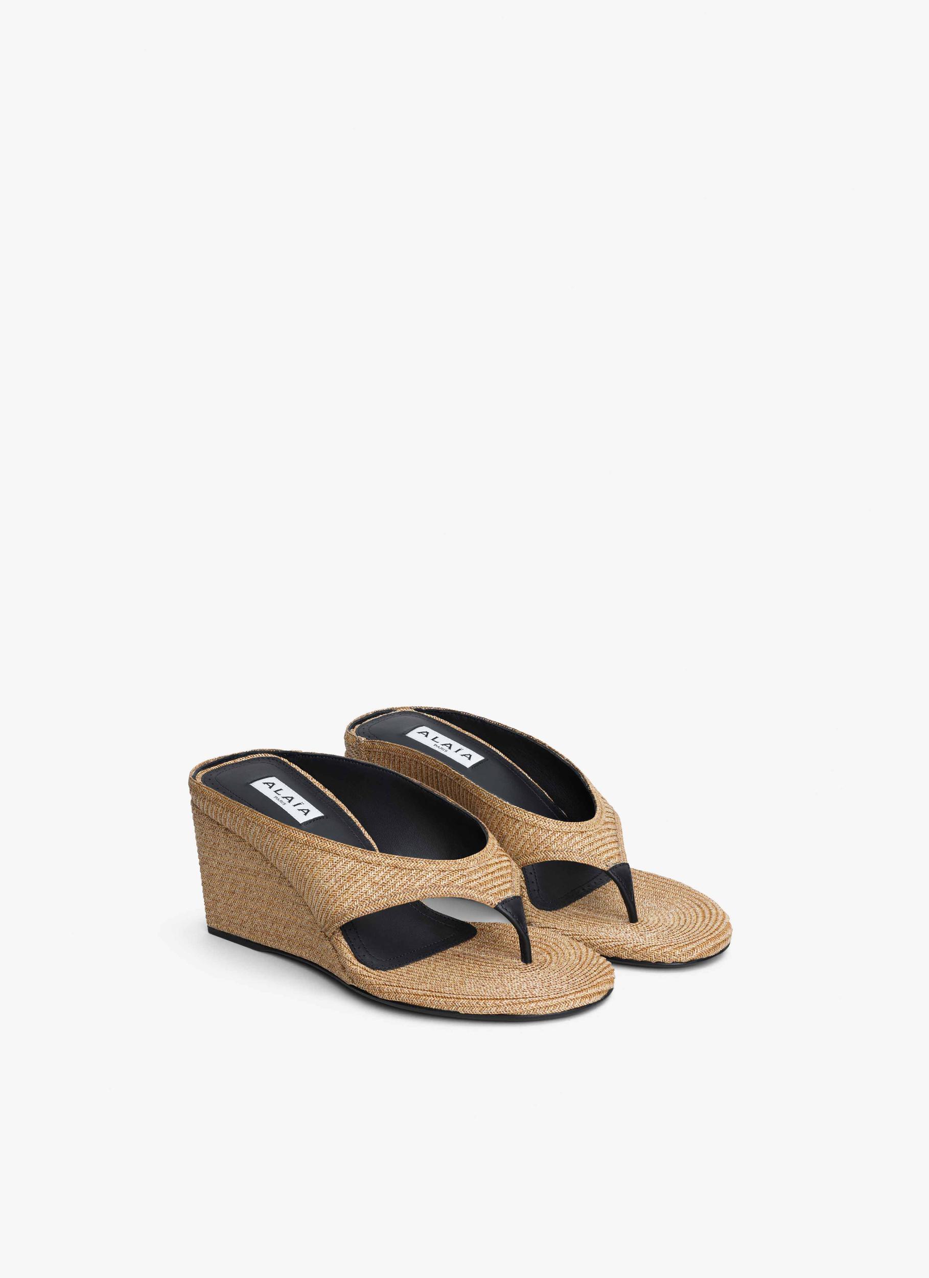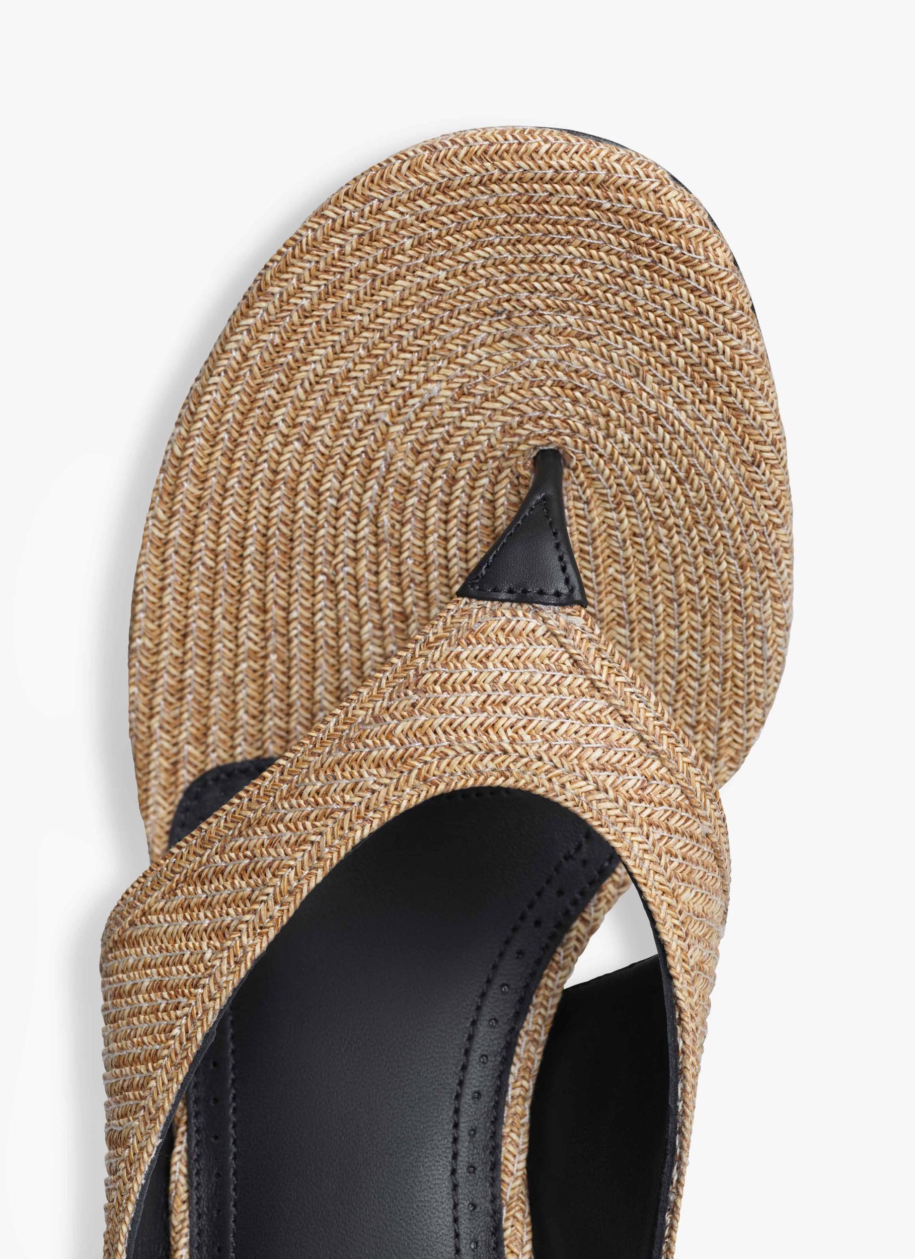 Wedge thong mules Distinctive cubic heels CUT FROM PAPER STRAW PANNELS THAT ARE ARTISANALLY WEAVED AND ASSEMBLED TOGETHER Calfskin leather lining 75 mm heel Made in Italy