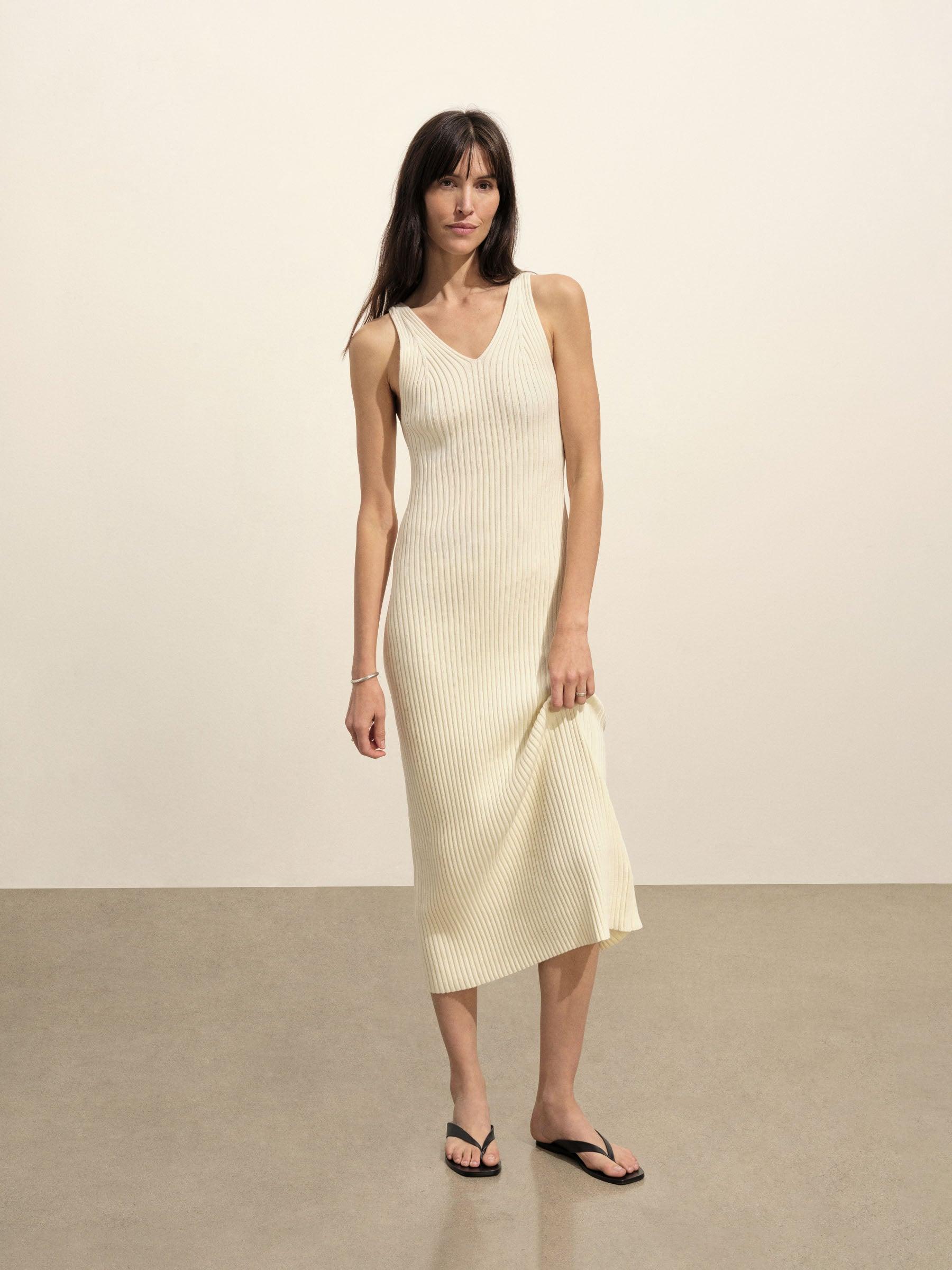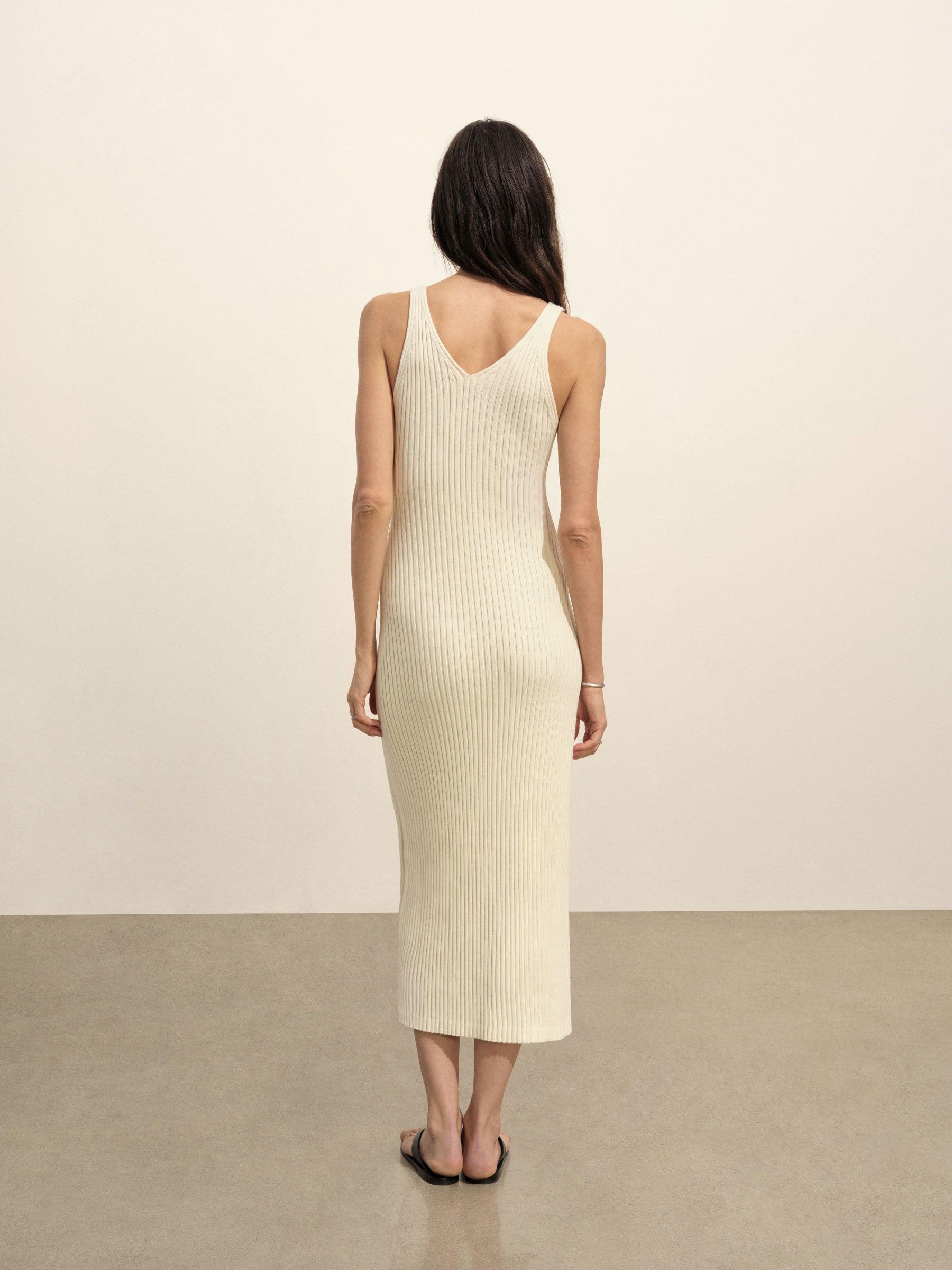 Slim-fit, ribbed V-neck tank dress knit from 100% Italian cotton yarn.