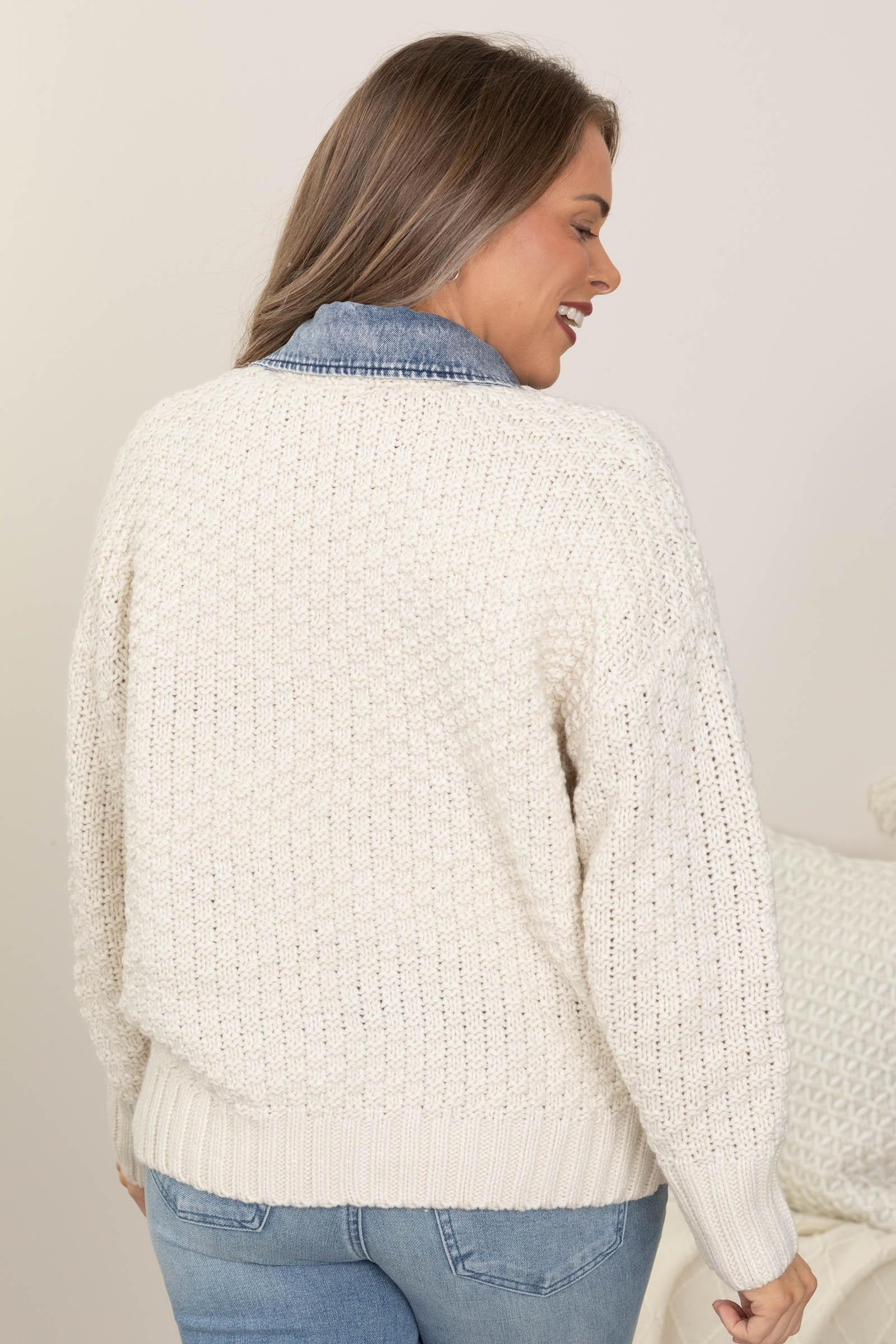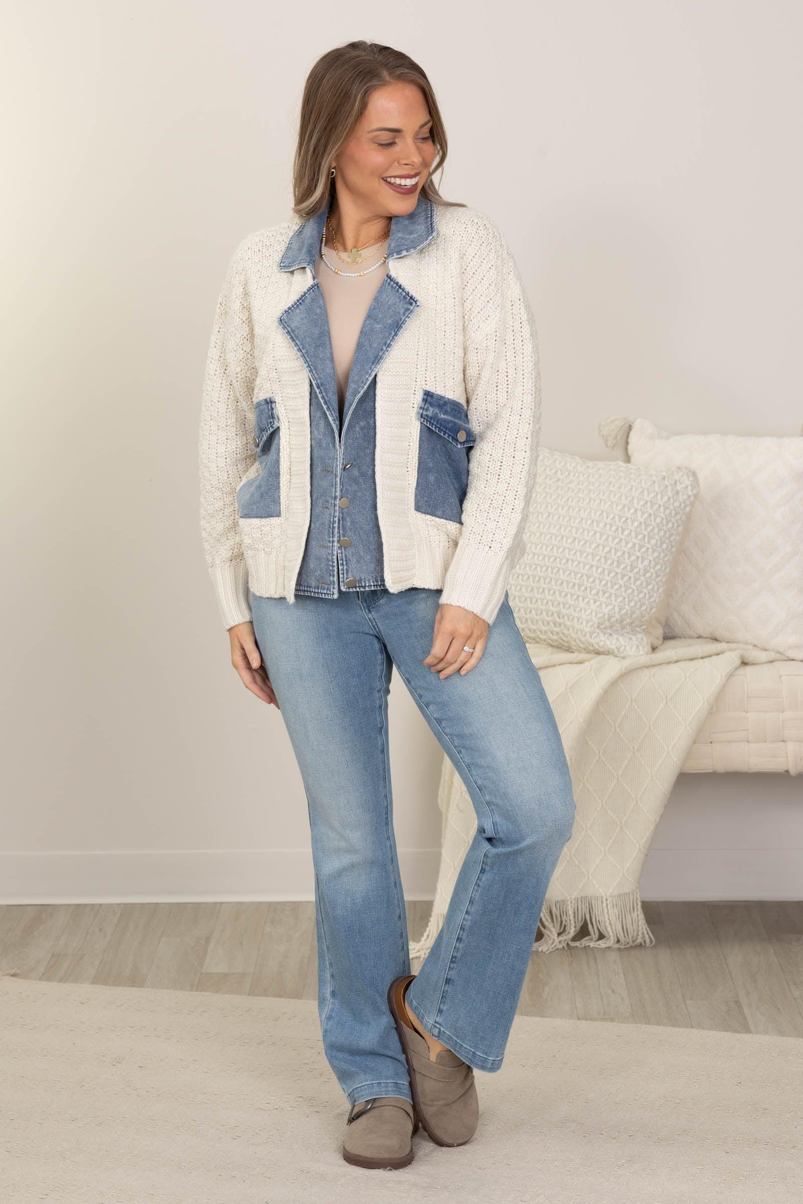 Product Details Colors: Natural, Medium Wash Denim Print: Two Tone Neckline: Button Down Sleeve: Long Sleeve Hemline: Straight Brand: J.O.A. Material and Care Shell: 100% Acrylic Contrast: 75% Cotton 25% Polyester Hand Wash Cold Hang/ Line Dry Size and Fit Small: Bust 48" Waist 46" Length 24" Medium: Bust 50" Waist 48" Length 25" Large: Bust 52" Waist 50" Length 26" Erica is 5’7” and wearing her true size small