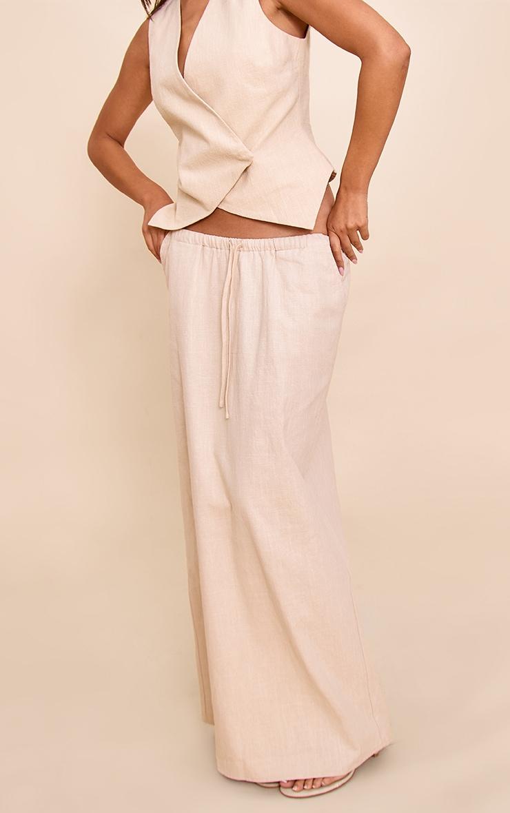 Build a knowing day edit around pieces designed for effortless polish. The natural premium linen drawstring maxi skirt provides a clean, straight line that falls gracefully to a floor-sweeping maxi length, featuring a practical drawstring waist for a custom fit and essential side pockets. Introduce this natural tone piece into your rotation by pairing it with a sharp tailored vest or a simple fitted tee. Finish the look with minimalist flat sandals or sneakers for a confident, considered presence ready for day.Length approx 114.5cm/45inch (Based on sample size US 4)Model wears size UK 8/ EU 36/ AUS 8/ US 4Model Height - 5ft 9inchp]:!mb-4inch>Brand: PrettyLittleThingCategory: BottomsProduct type: Maxi SkirtColor: NaturalDesign: PlainOccasion: Day