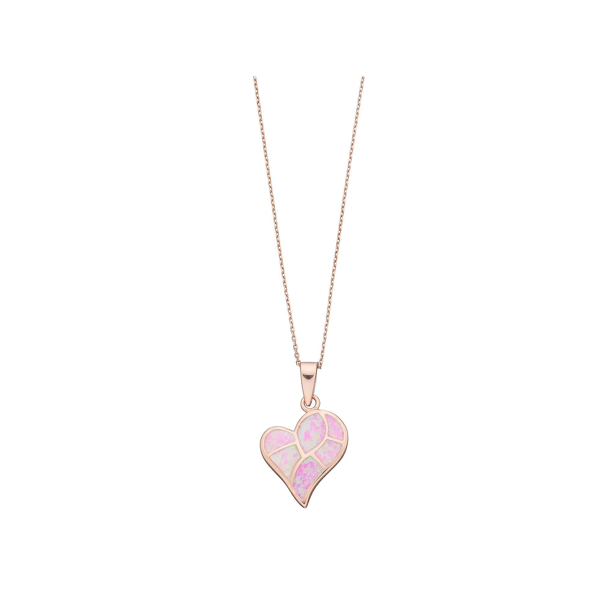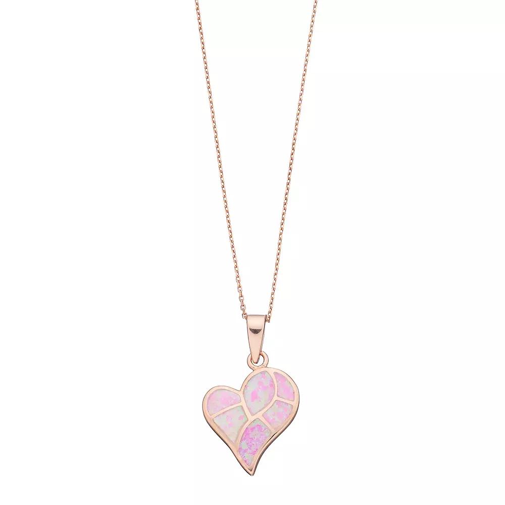 Decorated with lab-created pink opal inlays, this 14k rose gold over silver heart pendant offers feminine beauty.PENDANT DETAILSPendant length: 0.7 in.Chain length: 18 in. Clasp: spring-ringMetal: sterling silverPlating: 14k rose goldPackaging: boxedSTONE DETAILSStone type: lab-created pink opalTotal weight: 5 ct.Setting: inlayGemstones may have been treated to enhance their appearance. Special care may be required. Size: 18". Gender: female. Age Group: adult. Material: Gold Over Sterling.