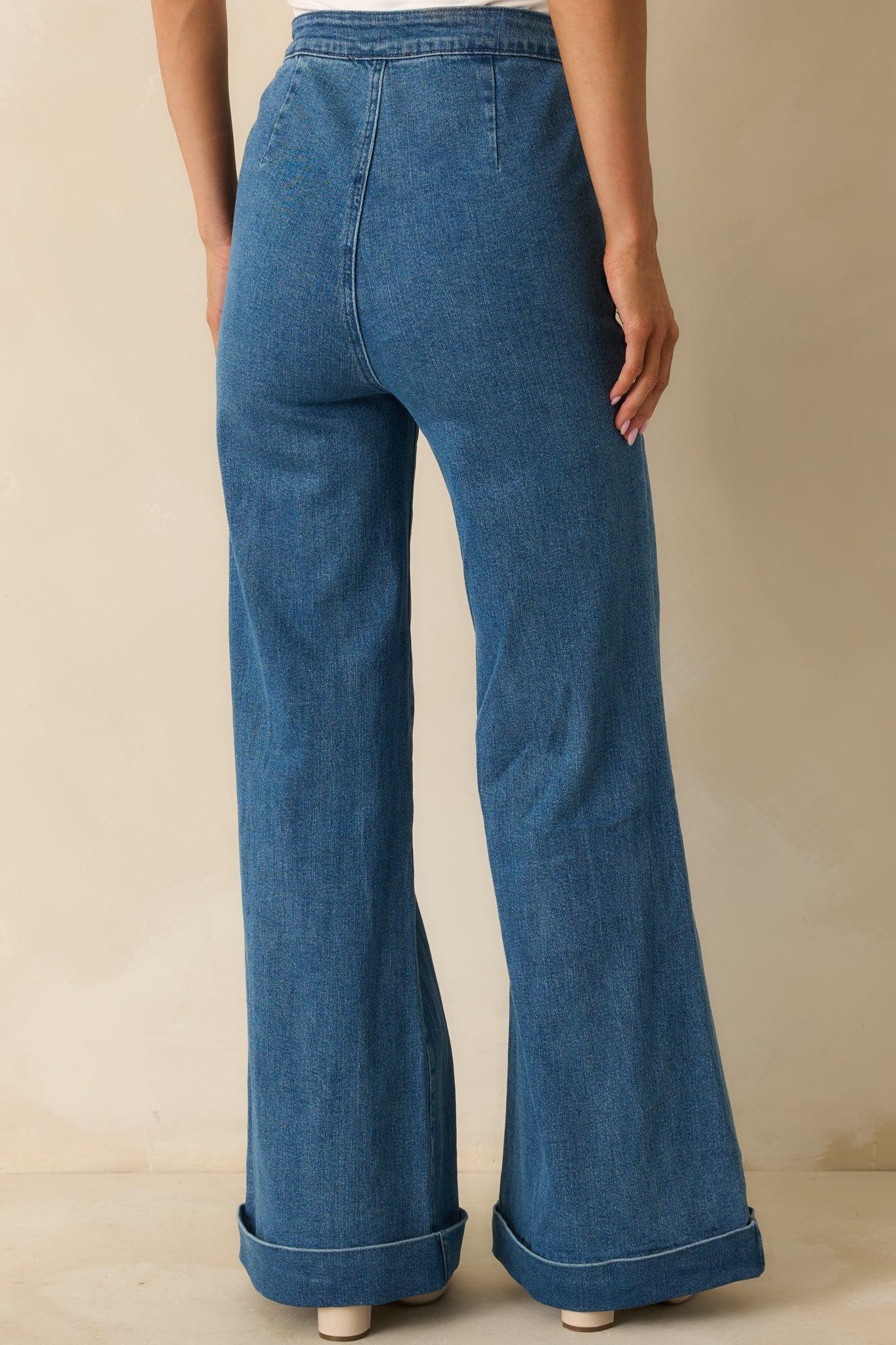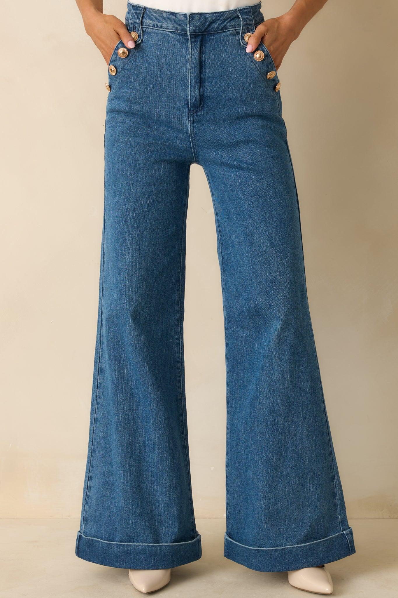 The Nautical By Nature Jeans bring a subtle sailor moment to your everyday style, mixing a classic indigo wash with those polished side buttons that feel effortlessly refined. The high rise and wide leg keep the silhouette clean and lengthened, while the soft stretch denim makes them just as easy as they are elevated. Whether you dress them up, down, or somewhere in between, they’re the kind of jeans that make every outfit look intentionally styled. These indigo stretch wide leg jeans feature a high waisted fit, functional gold-tone side button accents, a zip-fly closure, front seaming details, and wide cuffed hems. Constructed in a soft stretch denim with a smooth feel and a full-length wide leg silhouette. 85% Cotton, 5% Polyester, 8% Viscose, & 2% Spandex Unlined Hand Wash Cold Manufactured in China Designed in the USA Model is 5'8" and wearing size small, clipped, model is a true x-small