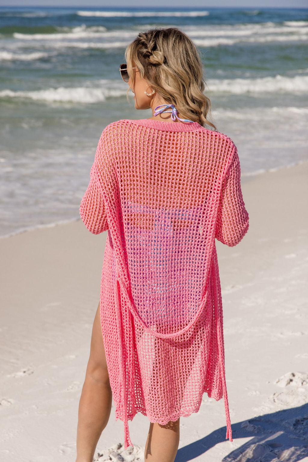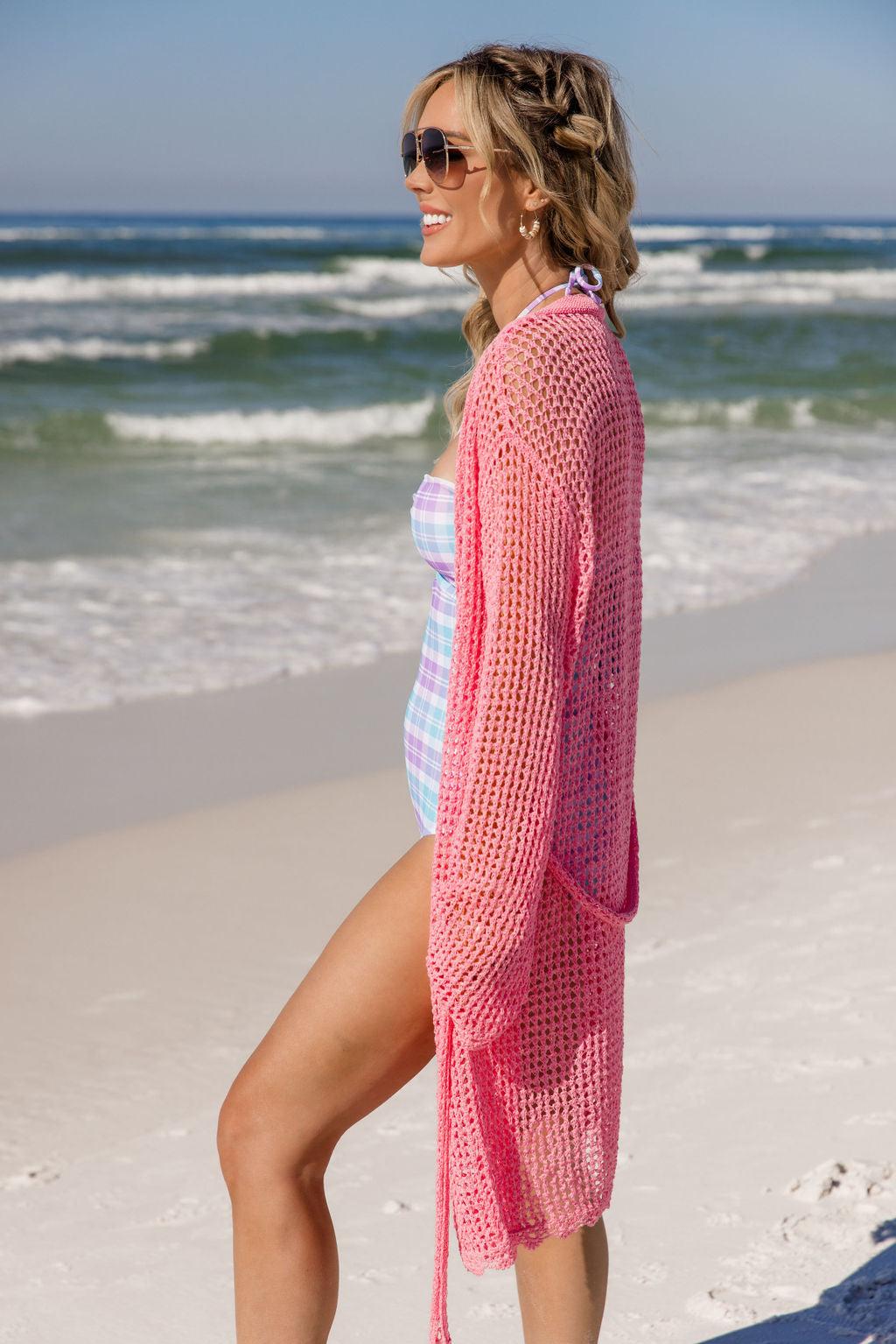 Details Pink Open Knit Belted Cover Up Fabric has stretch Open knit crochet Pair this cardigan over your favorite swim! Unlined Size small from shoulder to hem: 31" Material and Care 100% acrylic Hand wash cold, lay flat to dry Patterns may vary Materials may have natural variations Colors may vary from different viewing devices.