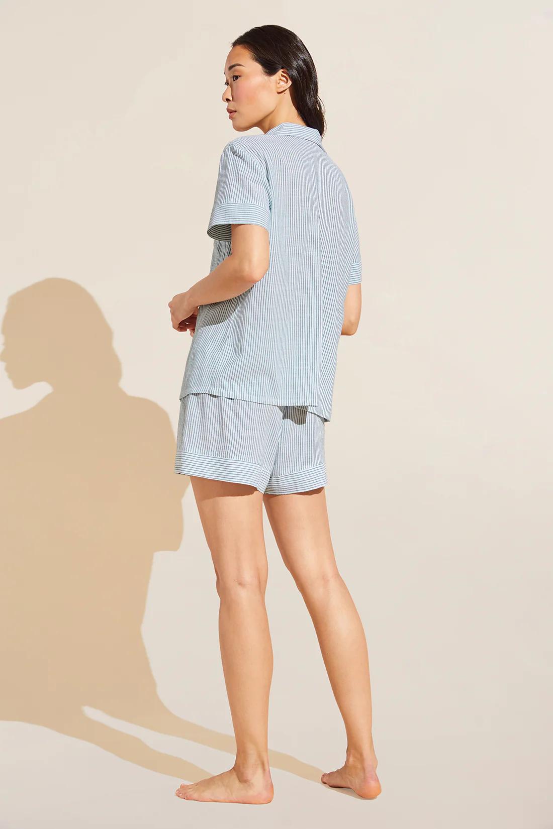 The Nautico collection was created to help even the hottest of sleepers get a peaceful night’s rest. Breathable and temperature-regulating, our lightweight woven fabric is a cotton blend made from plant-based, hypoallergenic, and biodegradable fibers. The Nautico Short PJ set is designed with a more relaxed fit, longer top, and higher rise short than our classic Gisele PJ’s. Treat your skin to a crisp and weightless pair of PJ’s that feel good in any climate. Nautico is a natural choice when you want to cool down in pure comfort.