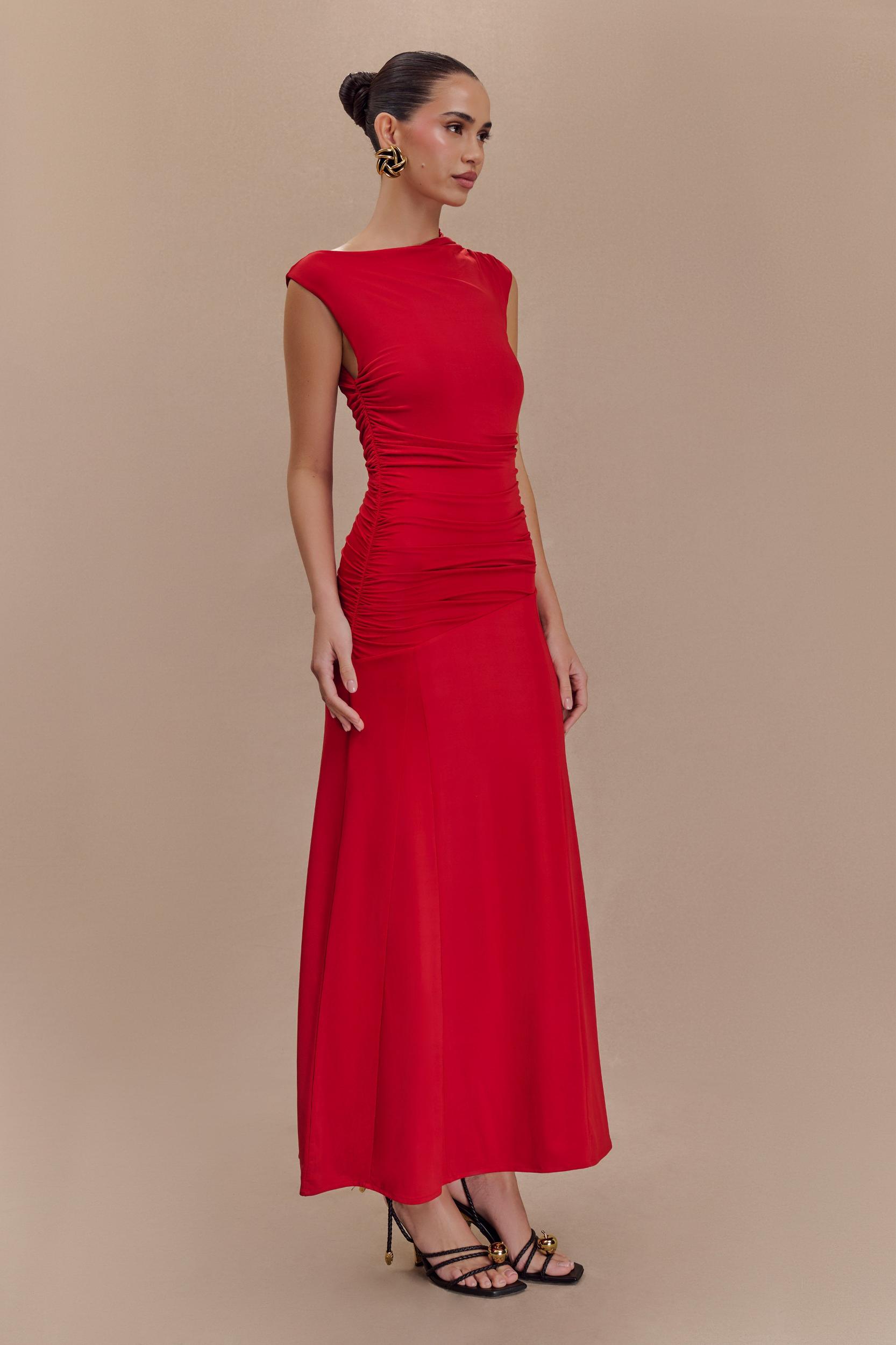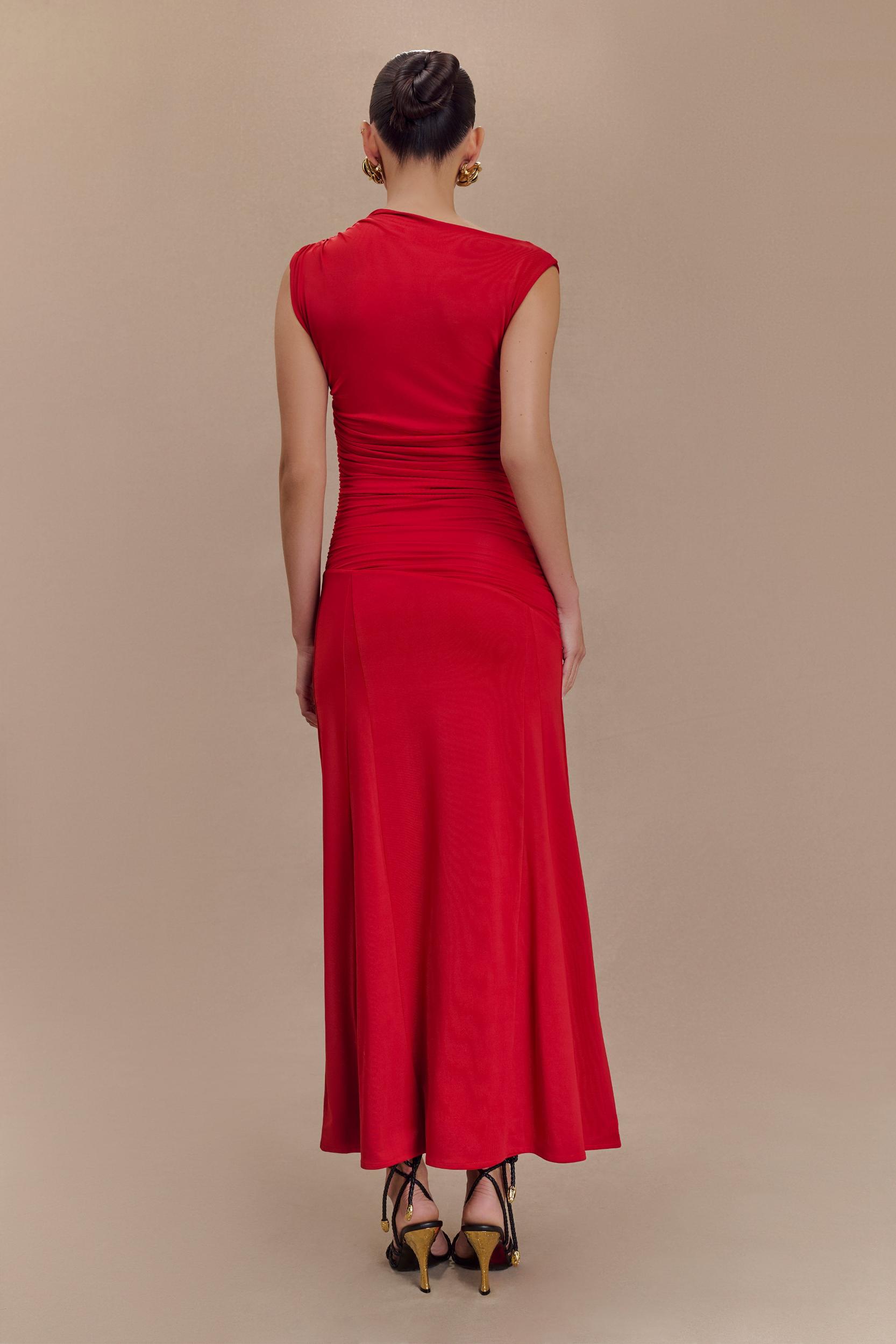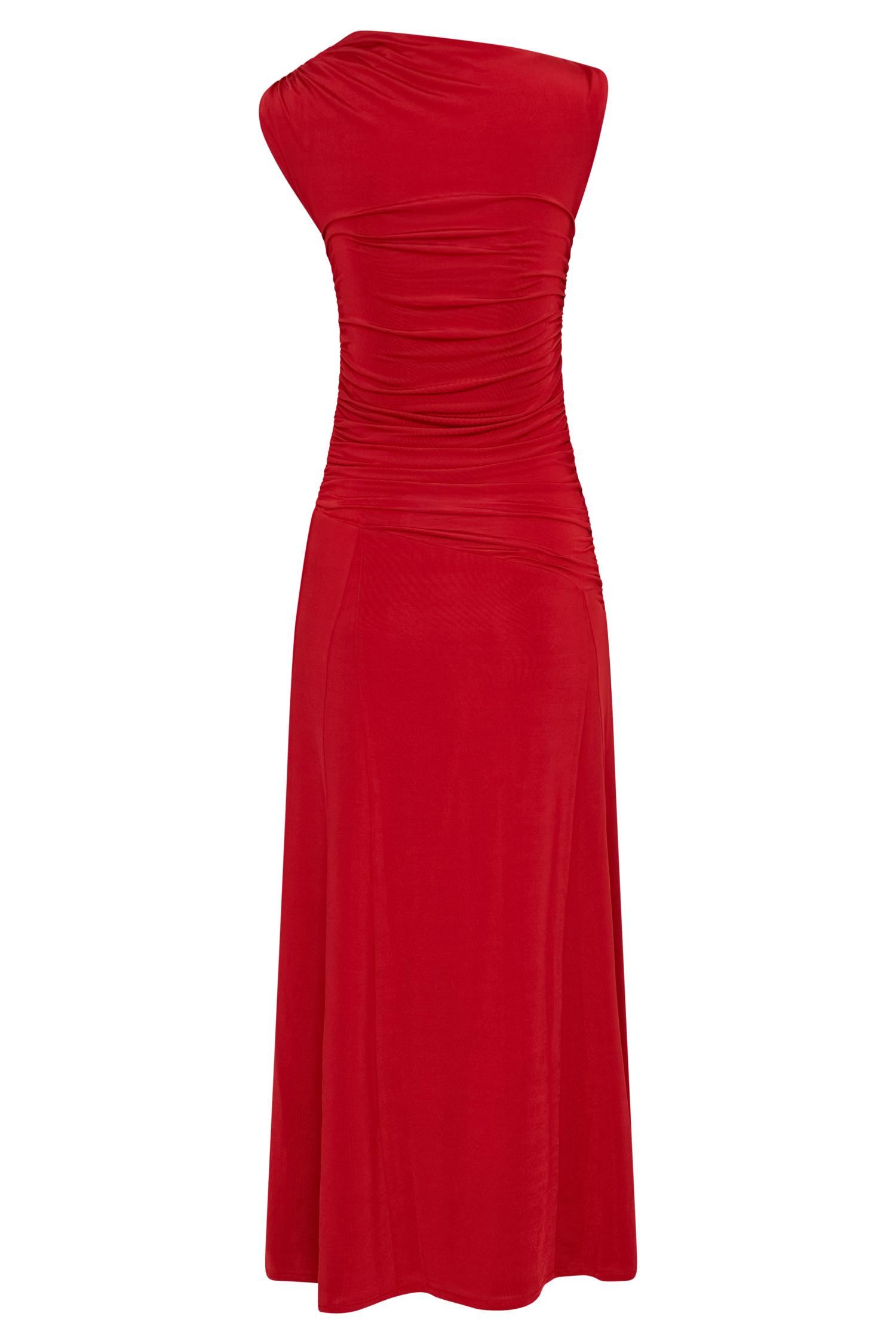Stylish flow. Embrace elegance with the NAVANNA Asymmetric Slinky Midi Dress. This stunning piece showcases a modern asymmetrical neckline and a sleeveless design that exudes sophistication. The rushing waist detail flatters your figure, while the asymmetrical lower waist seam adds a unique touch. With skirt godets that enhance movement, the dress features a flowing midi length and a flared skirt hem shape for a romantic silhouette. Fully lined for added comfort, this dress is the perfect choice for any occasion, ensuring you turn heads wherever you go.