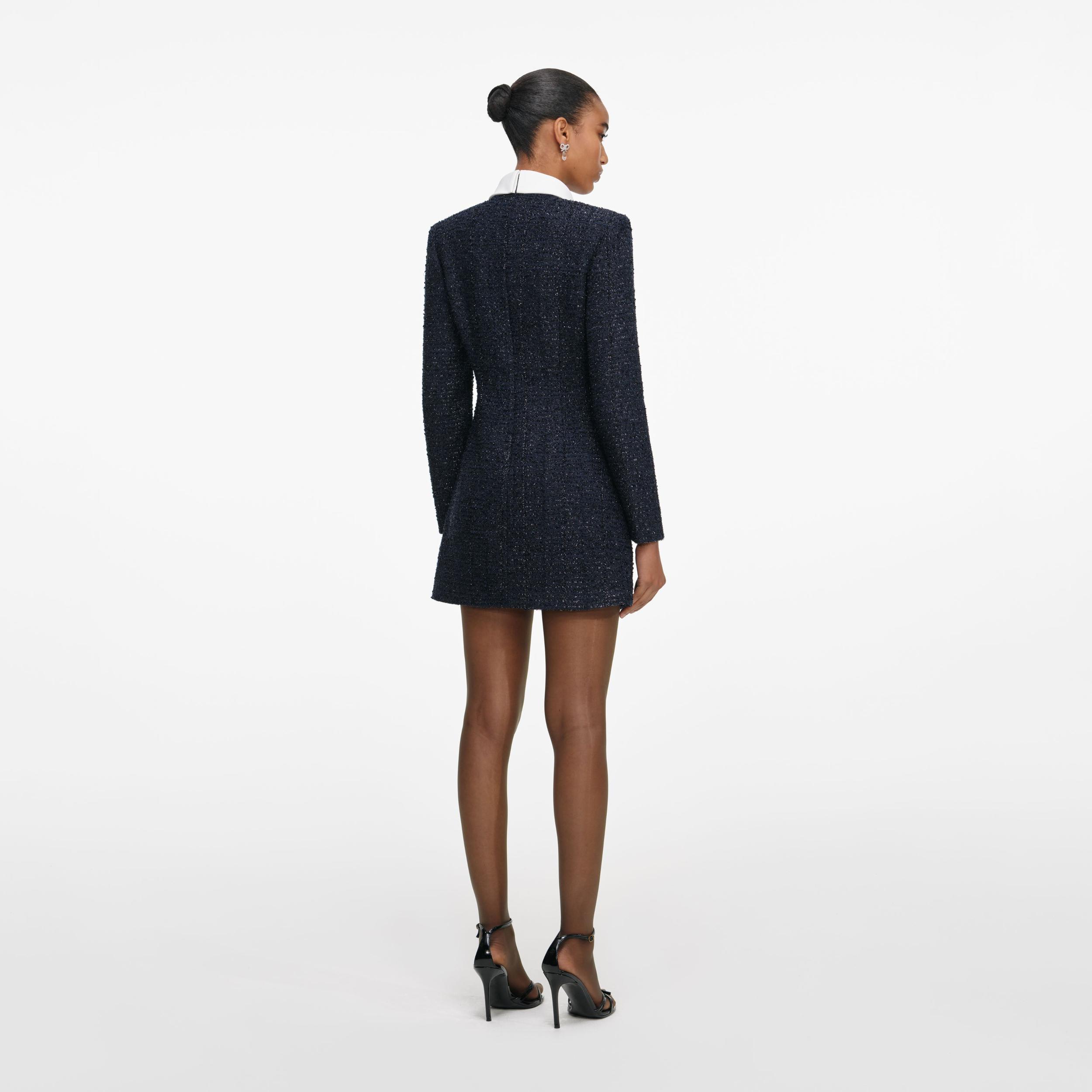 Prep, polish and legs for days: this mini dress is cut from navy bouclé for its elegant structure. A contrast neck and gold buttons add vintage charm – pair with brogues for meetings that matter.Fitted styleThis style has minimal stretchZip closure at backFaux button embellishmentContrast Peter Pan collarModel is 5ft10/178cm and wears a size UK 6