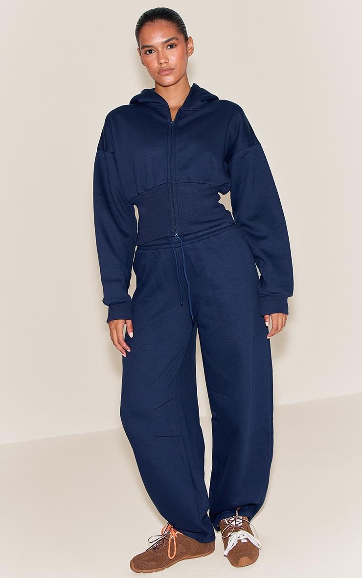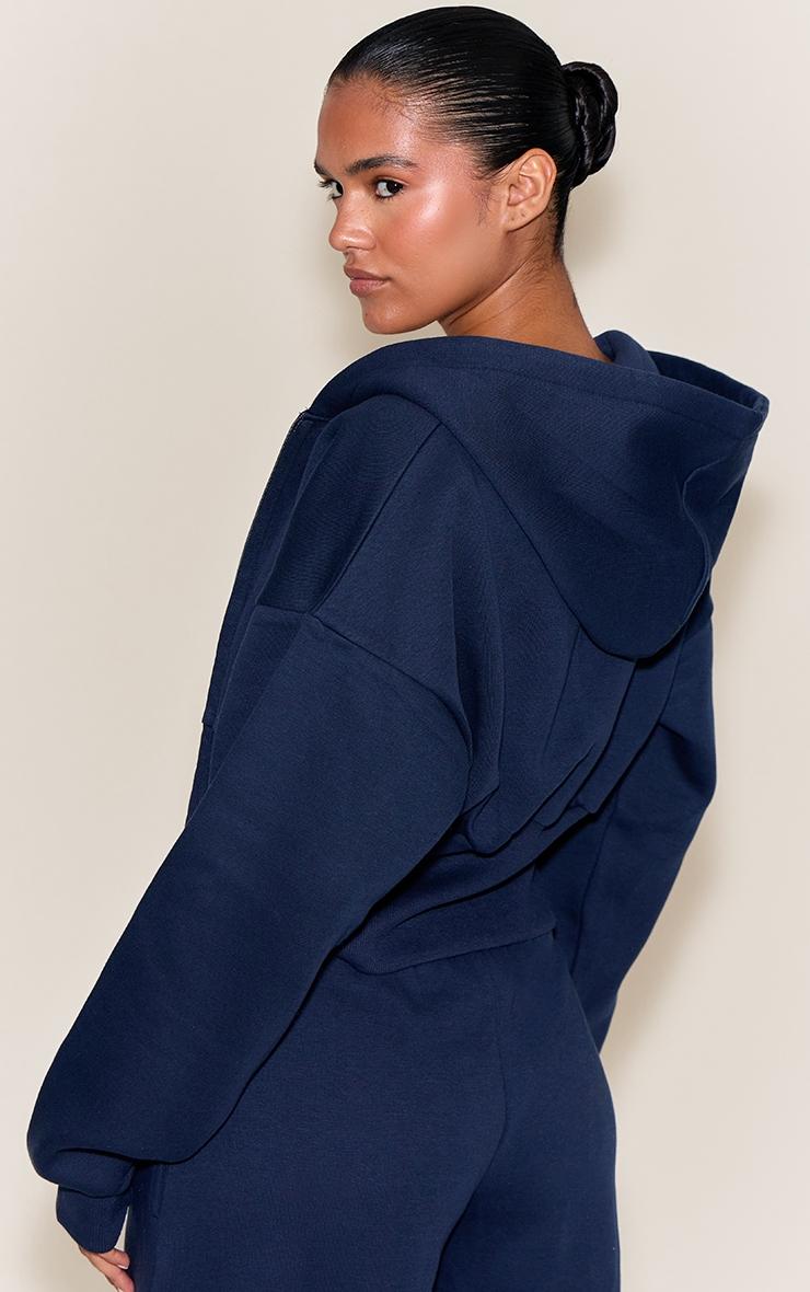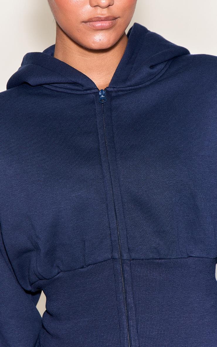 Keep it sleek in the navy cinched cropped zip up hoodie. Made from a navy material, it features a cropped length, cinched waist, and zip front fastening. Pair with a pair of comfy sneakers and a shoulder bag for a fool proof finish.Length approx 68.5cm/27inch (Based on sample size S)Model wears size SModel Height - 5ft 7inchp]:!mb-4inch>Category: AthleisureProduct type: HoodieColor: NavyMaterial: Fleeceback SweatOccasion: Day