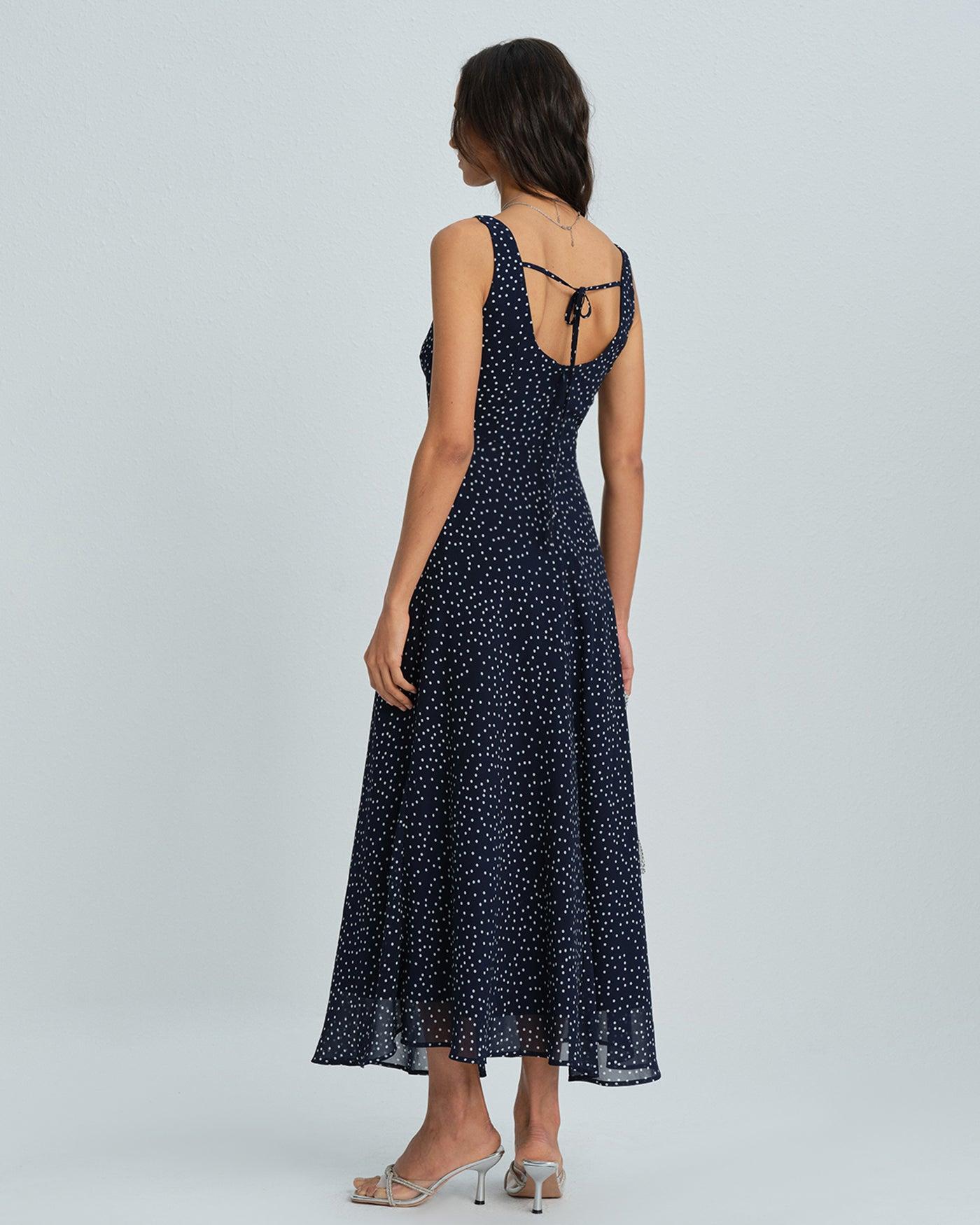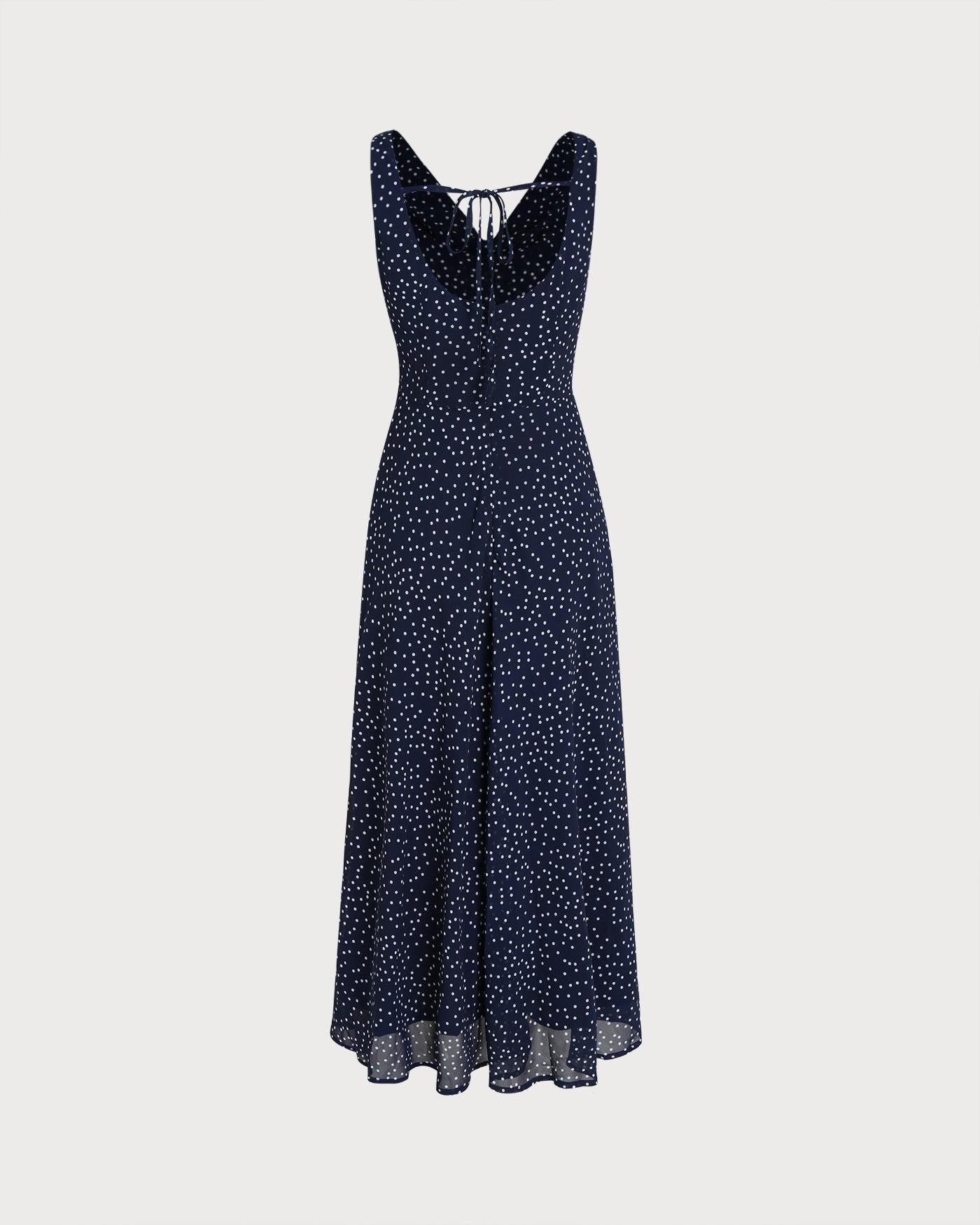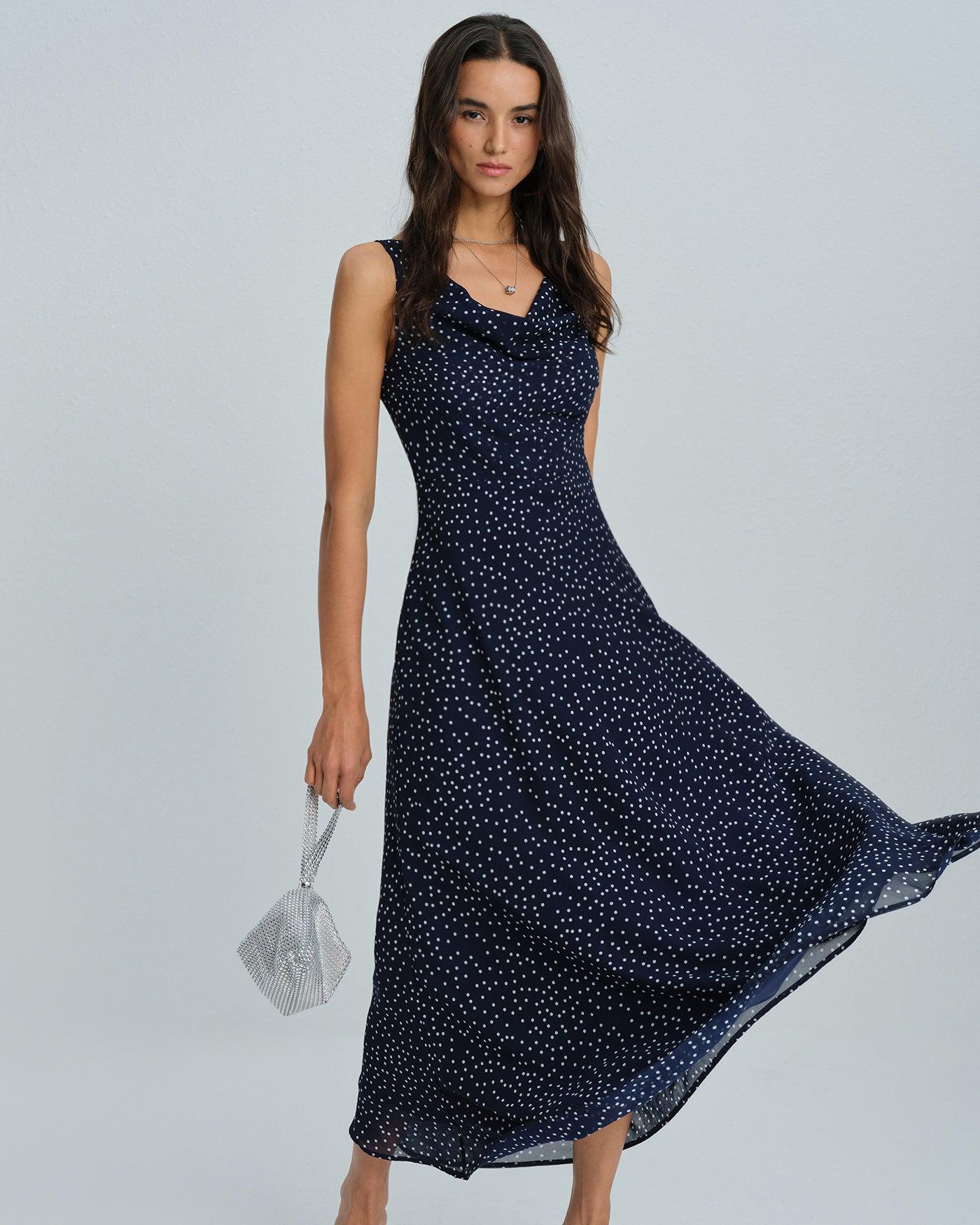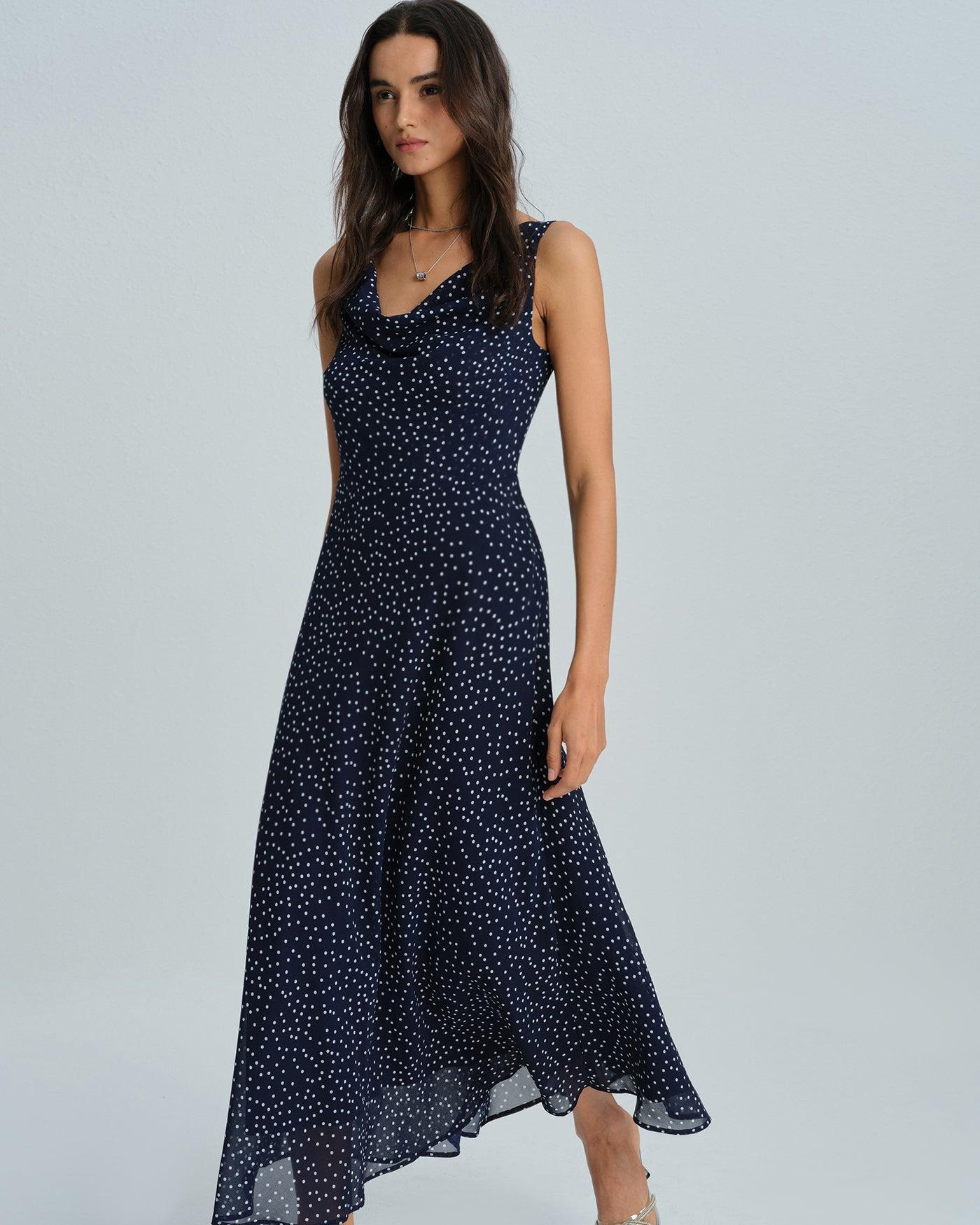 - Occasion: Daily - Style: Elegant - Season: Fall, Winter - Back Neckline: Bare - Fabric Stretch: No Stretch - Waist: Natural Waisted - Sleeve Length: Sleeveless - Sleeve Type: Sleeveless - Pattern Type: Polka Dot - Embellishment: Floral, Ruched, Tie - Neckline: Cowl Neck - Dress Type: Sheath dress - Silhouette: A-Line - Fabric: Polyester 100.0% - Lining: Polyester 100.0% - Material: Chiffon - Pattern Style: print