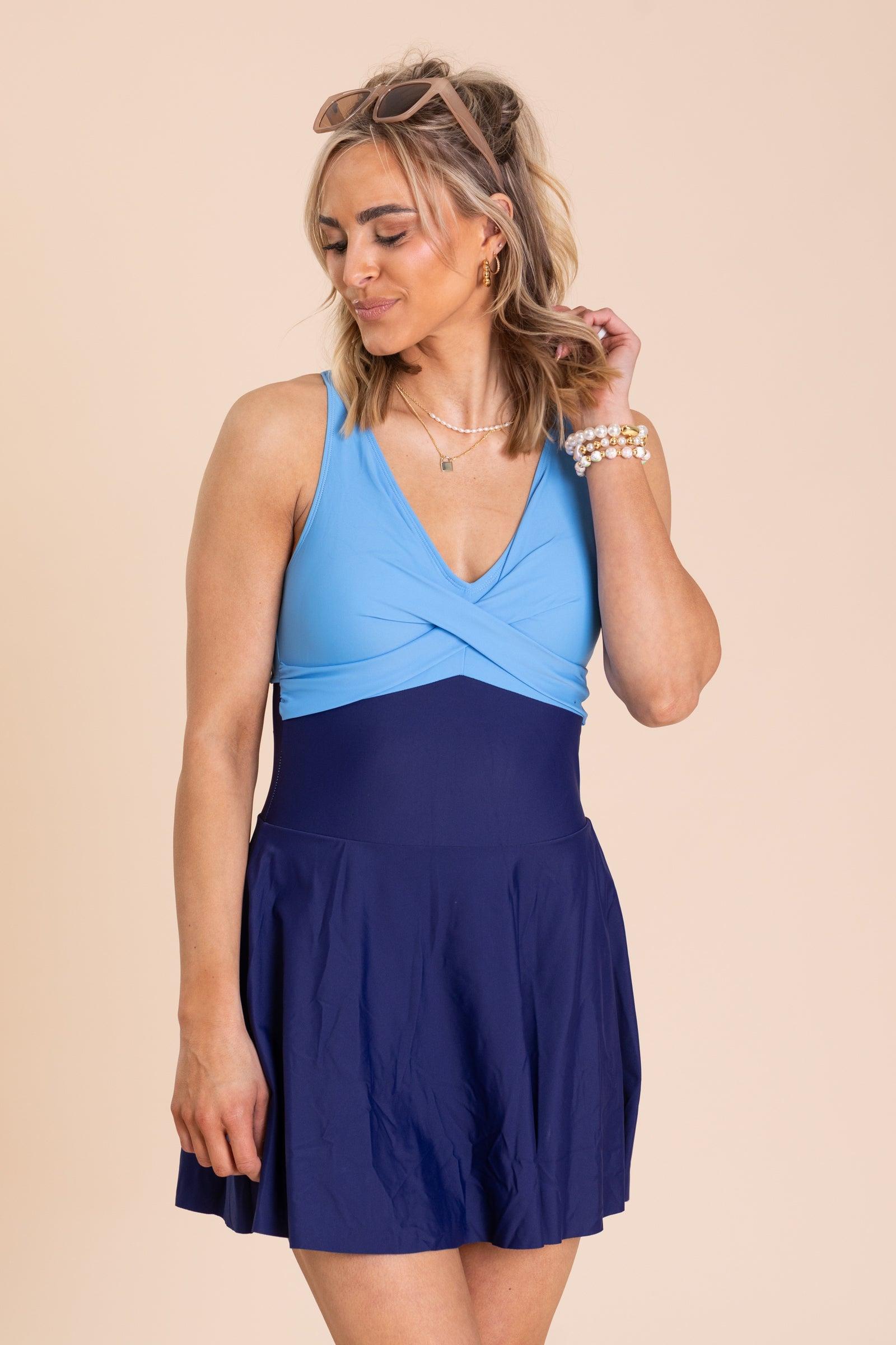 Product Details Colors: Navy, Sky Blue Print: Two Tone All Swimsuits Are Non-Returnable Items Material and Care 82% Polyamide 18% Elastane Machine Wash Cold Size and Fit Adjustable Strap Small: Bust 32" Waist 26" Length 33" Medium: Bust 34" Waist 28" Length 33.5" Large: Bust 36" Waist 30" Length 34" X Large: Bust 38" Waist 32" Length 34.5" 2X Large: Bust 40" Waist 34" Length 35" Model is 5'8 and wearing her true size small