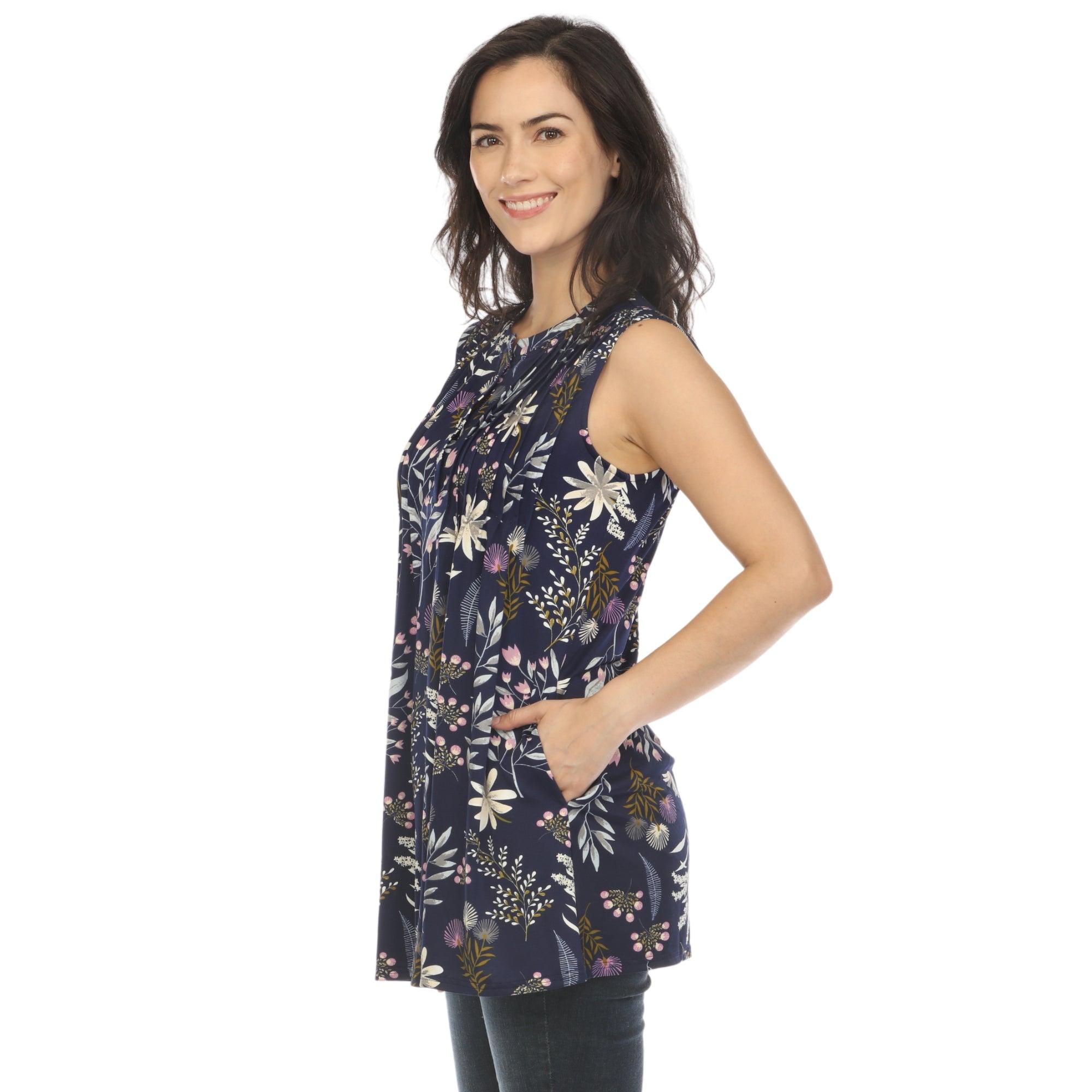 Style up your everyday look with this Tunic Top from White Mark with floral prints inspired by small wildflowers on the fields subtly waving on an easy and light summer breeze. This cool and comfortable top features a pin-tuck pleated front, shirt tail hem and side pockets for ultimate comfort.