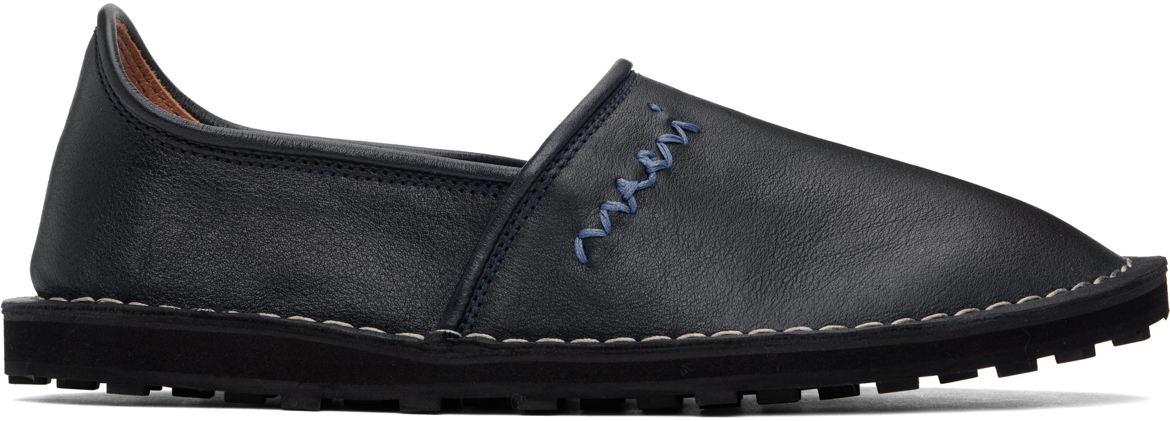 Buffed calfskin loafers in navy. · Hand-embroidered logo at vamp · Buffed sheepskin lining · Topstitching at welt · Treaded rubber sole Supplier color: Blue