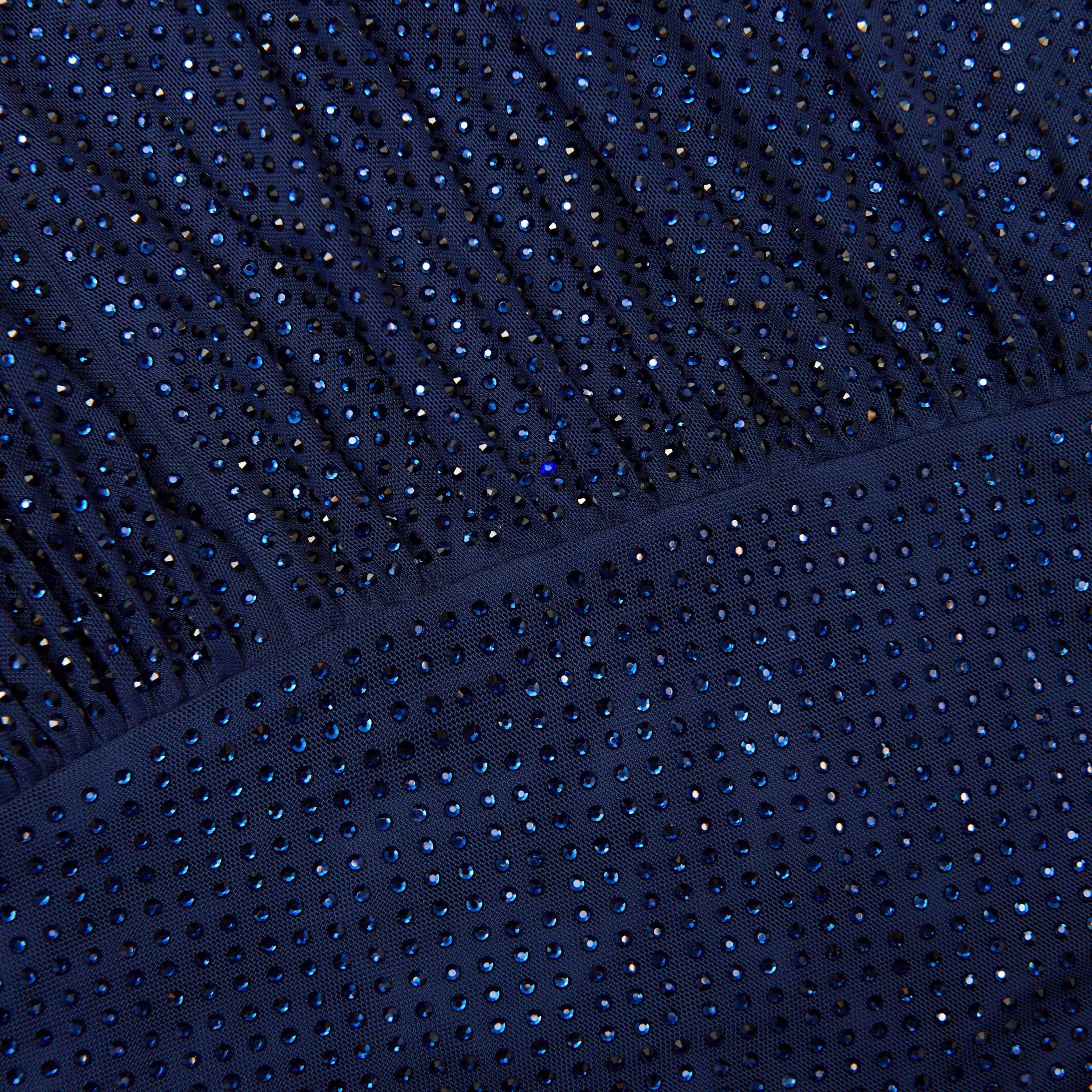 Cut from rhinestone-studded mesh, this navy maxi dress pairs its high-shine feel with a sleek silhouette, and an edgy cut-out to match. Show off its daring neckline with our statement earrings.True to sizeFabric has stretchZip closure at sideUnlined styleCut-out at shoulderModel is 5ft10/178cm and wears a size UK 6