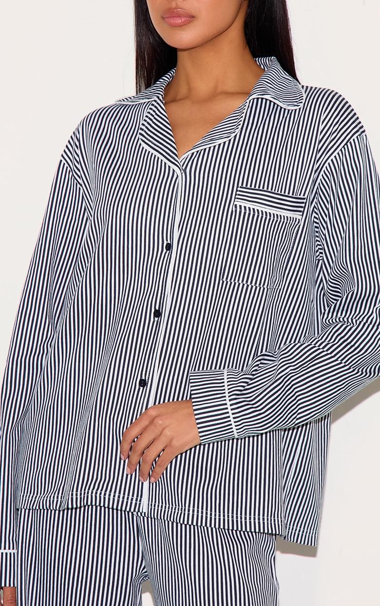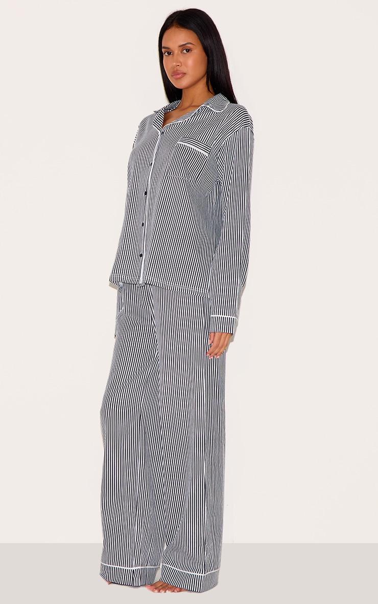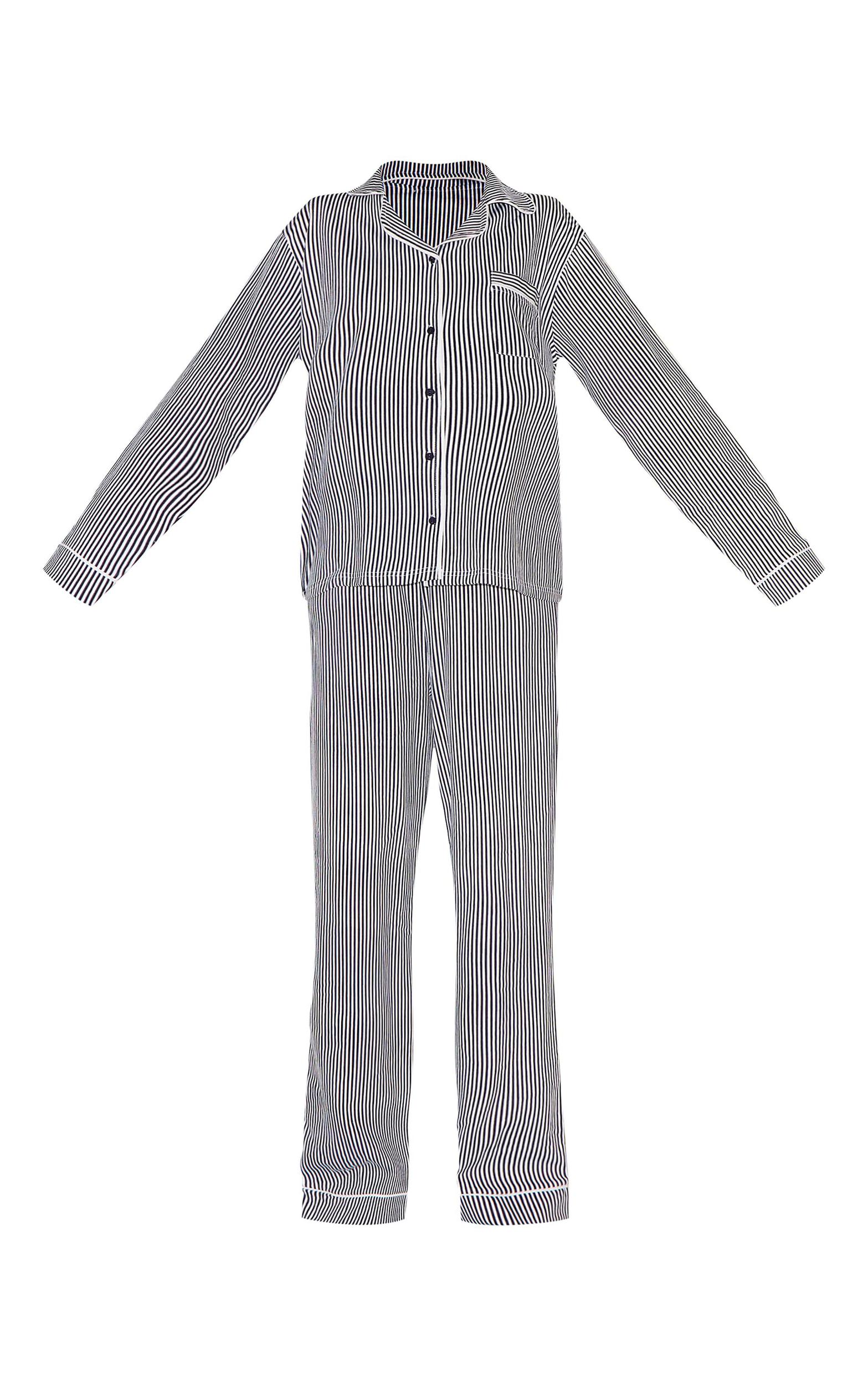 This navy stripe print jersey piping detail long pj set is perfect for your next night in. This set includes a long sleeve shirt and matching long bottoms, both in a nay hue jersey material with a stripe print design. Just add slippers and a robe to complete the look we're loving. Top Length approx 68.5cm/27inch (Based on a sample size S) Bottoms Length approx 78cm/30.5inch (Based on a sample size S) Model wears size SModel Height - 5ft 9inchp]:!mb-0inch>Category: Lingerie & NightwearProduct type: Long PJ SetColor: NavyMaterial: Cotton Jersey