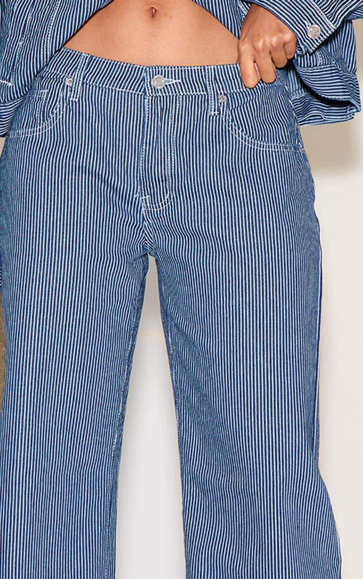 Make a statement in the navy striped low rise wide leg jeans. Made from a dark blue striped denim, these jeans feature a relaxed low-rise fit and straight leg silhouette. Style with gold jewelry and slip-on heels for a laid-back luxe edge.Length approx 76cm/30inch (Based on sample size US 4)Model wears size UK 8/ EU 36/ AUS 8/ US 4Model Height - 5ft 7inchp]:!mb-4inch>Brand: PrettyLittleThingCategory: DenimProduct type: Boyfriend JeansColor: NavyMaterial: Rigid DenimDesign: PlainOccasion: Day