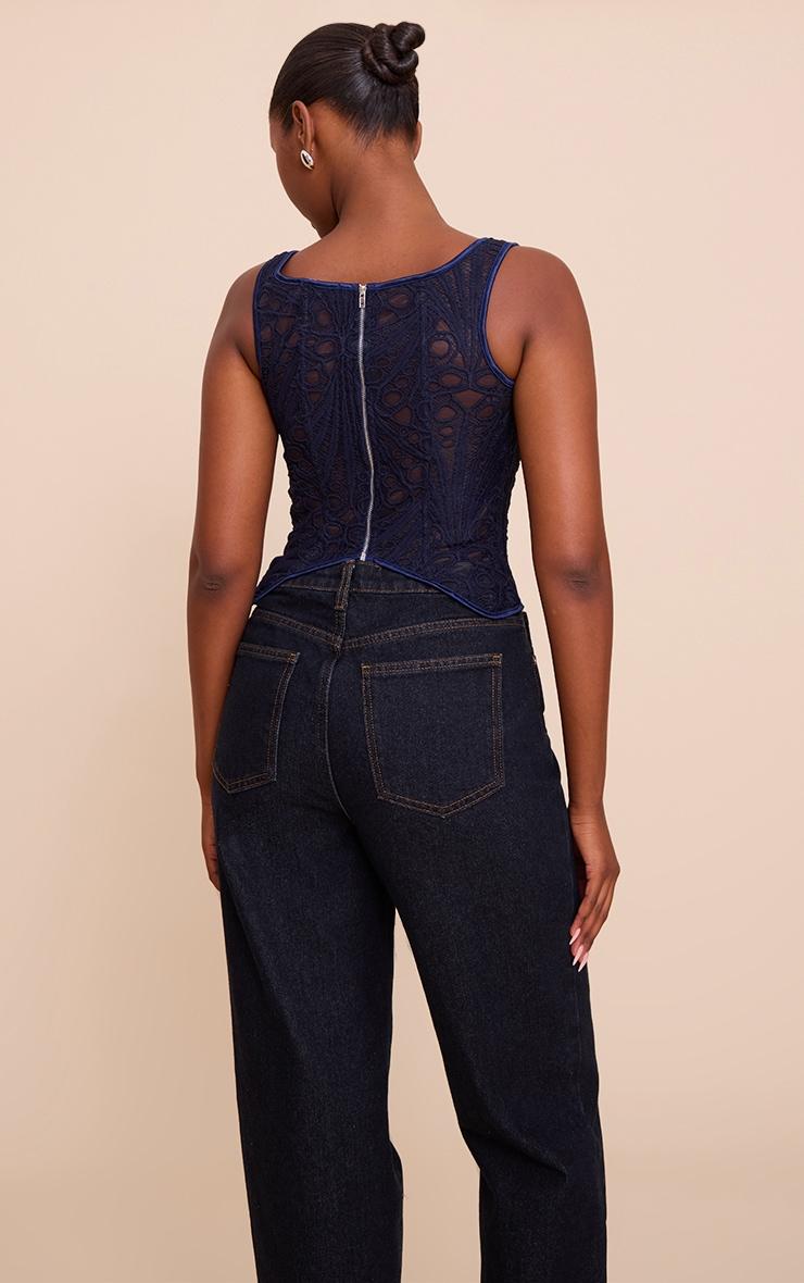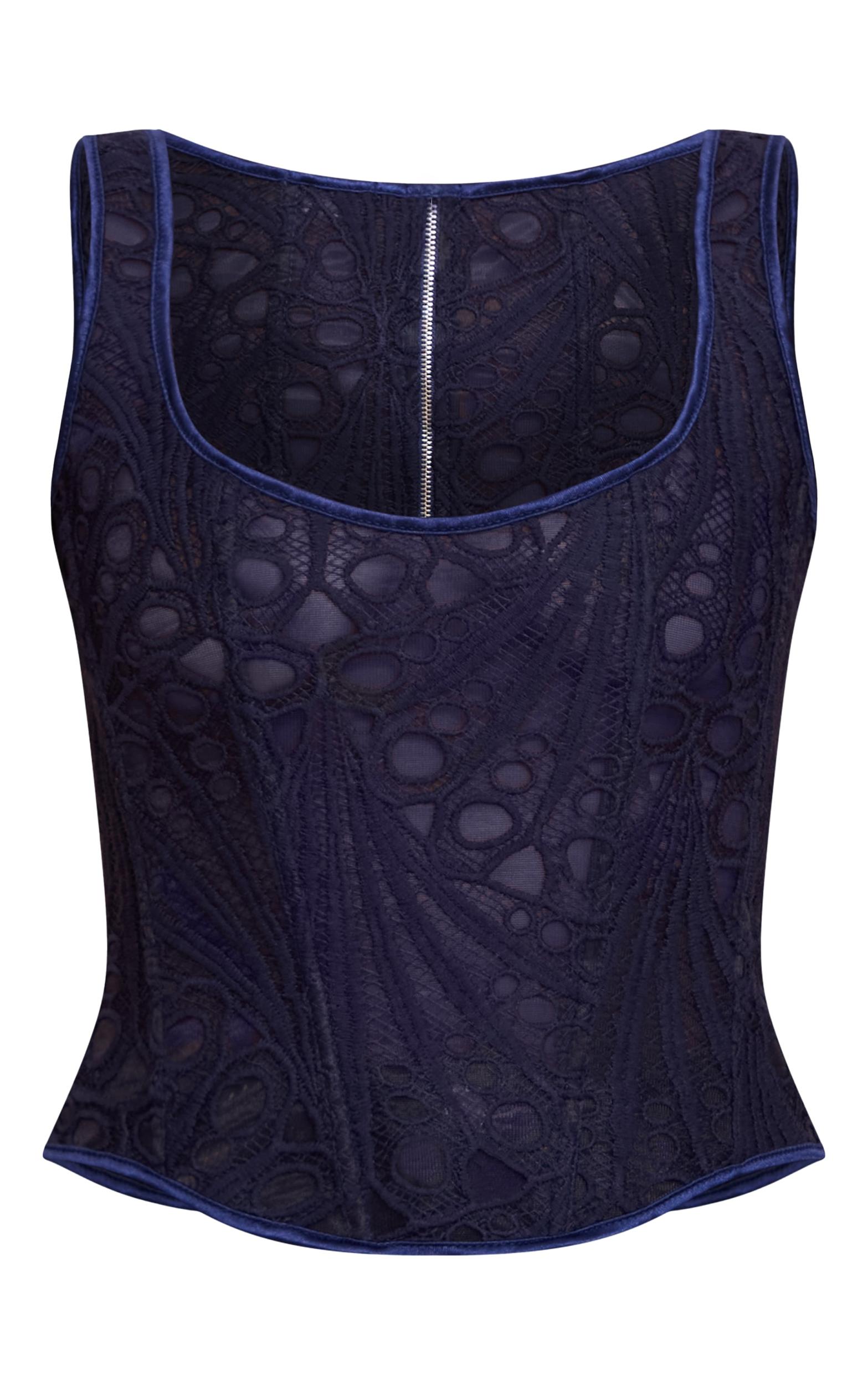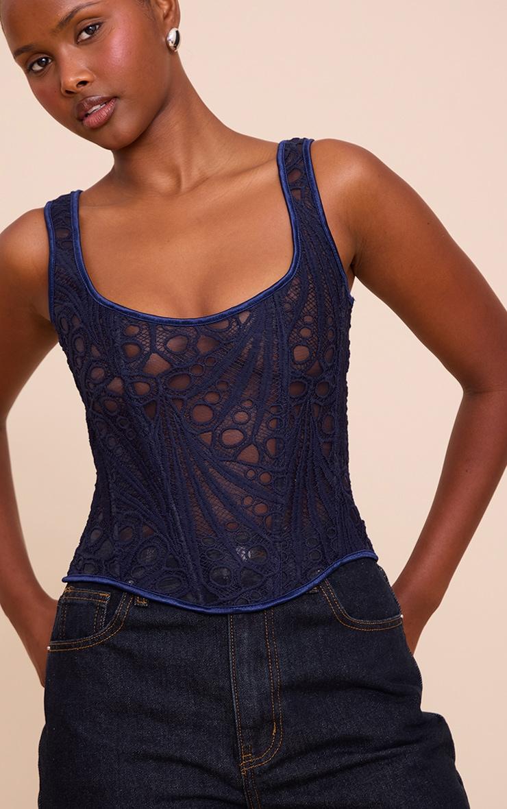 Curate a look that captivates with the exquisite navy textured sheer floral square neck corset. This distinctive piece features a structured, fitted design balanced by a bold square neckline, while its intricate sheer floral pattern delivers an artful dimension to your ensemble. Perfectly paired with high-waisted tailored pants or a sleek midi skirt, this corset is your go-to for making a sophisticated statement on any evening out.Length approx 48.5cm/19inch (Based on sample size US 4)Model wears size UK 8/ EU 36/ AUS 8/ US 4Model Height - 5ft 9inchp]:!mb-4inch>Category: TopsProduct type: CorsetColor: NavyMaterial: Woven LaceDesign: PlainNeckline: SquareSleeves: SleevelessOccasion: Evening