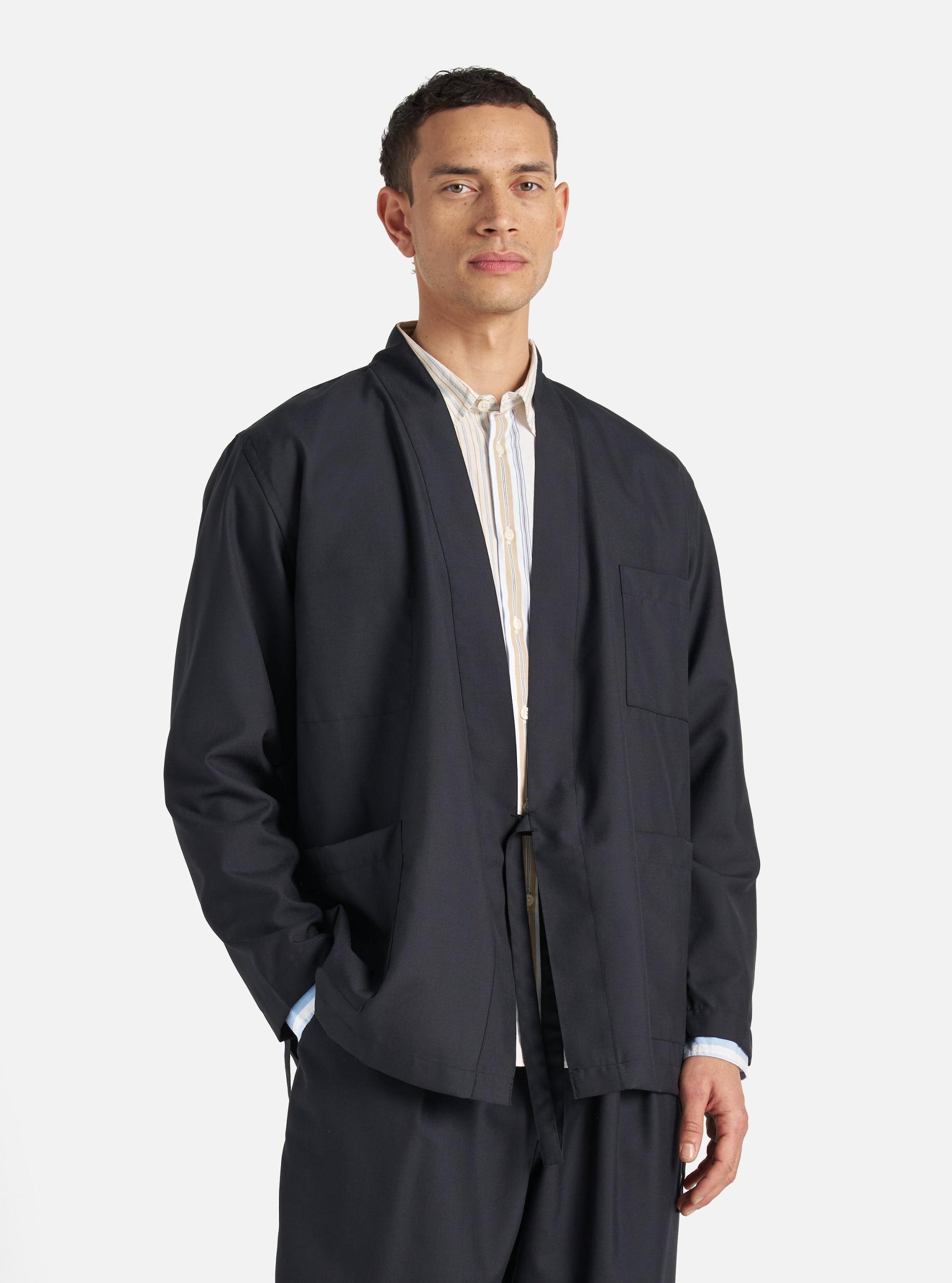 A simple, loose-fitting jacket inspired by its namesake city. Unstructured, with ties to fasten, this makes for a great throw-on layer. Our model is 6' 0'' with a 38' Chest and is wearing a size ‘Large.’ Light but practical and durable, Tropical Suiting is easy-to-wear, with a clean, minimal look. The best bit? All its creases drop out, meaning it looks just as crisp straight out of your weekend bag as when it went in. • Wrap front with ties. • Two lower patch pockets. • One external chest patch pocket. • One internal chest patch pocket. • Fabric Content: 55% Polyester, 45% Wool. • Washcare: Delicate wash at 30 degrees. Do not bleach. Do not tumble dry. Cool iron. Dry clean. Wash like colours together. Do not iron decoration. • Please be aware that the measurements below are technical measurements that are based on the garment laid flat and are useful as a general guide only. Measured in Centimetres. XS S M L XL XXL XXXL Centre Back Length. 71 73 75 77 79 81 83.5 Chest Width - 2.5cm Below Armhole. 50.5 53 55.5 58 60.5 63 66.5 Sleeve Length - From Shoulder (inc. Cuff.) 59 60.5 62 63.5 65 66.5 70.5 Across Shoulders. 42 44 46 48 50 52 53