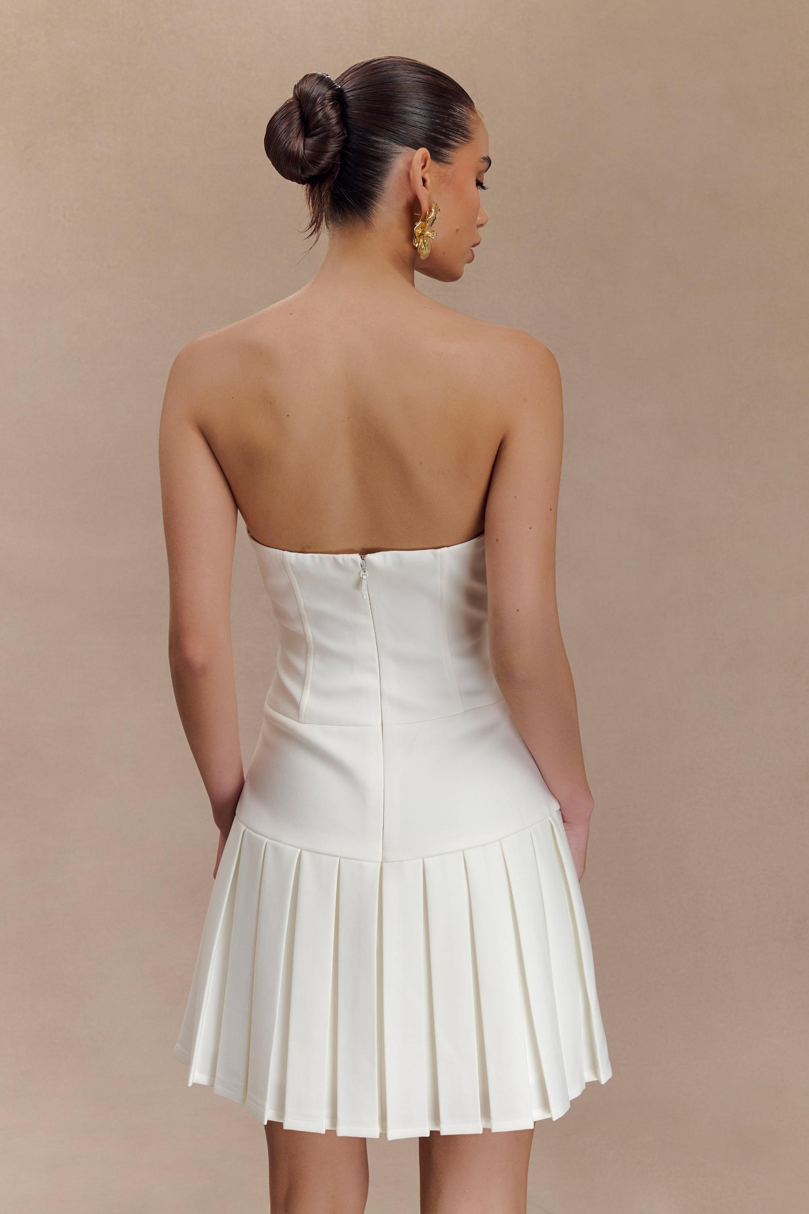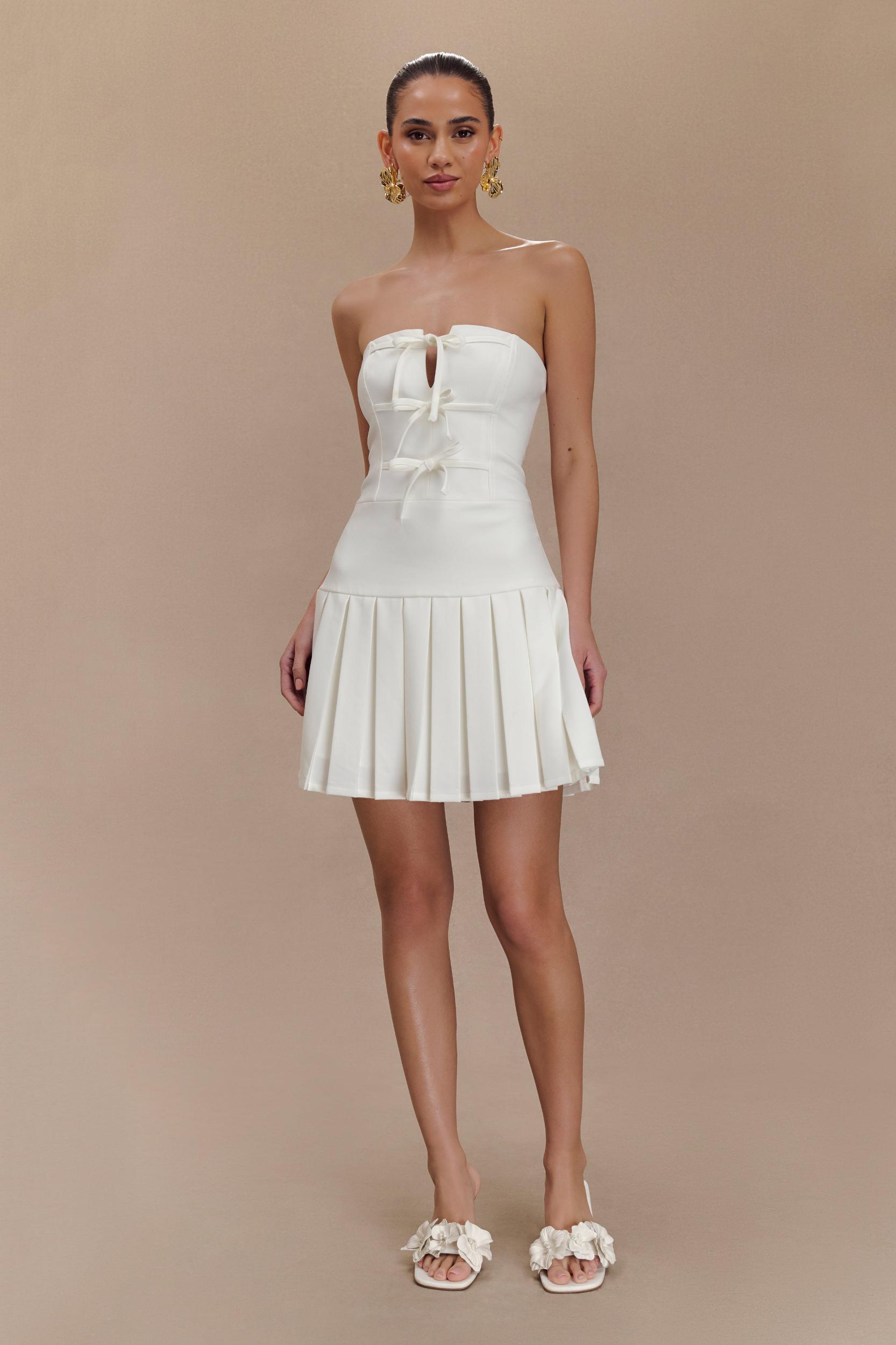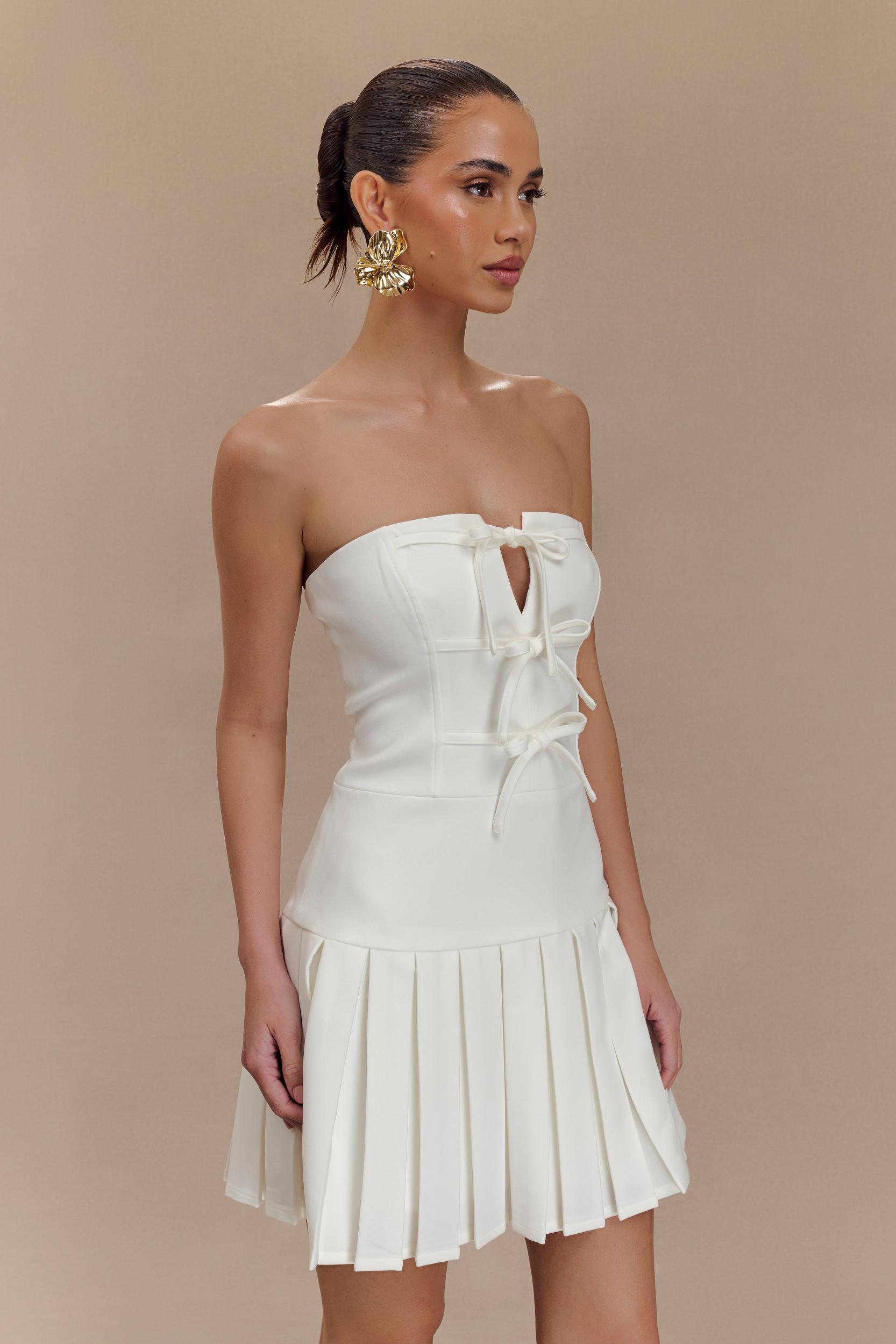 Playfully pleated. Elevate your style with the NAYA Pleated Mini Dress With Ties, a perfect blend of sophistication and charm. This strapless dress features a fitted bodice that accentuates your curves, while the pleated lower skirt creates a flirty and flowing silhouette. The centre back invisible zip offers a seamless fit, ensuring comfort and ease of wear. A delightful front tie detail adds a playful touch, making this dress ideal for both formal occasions and festive gatherings.