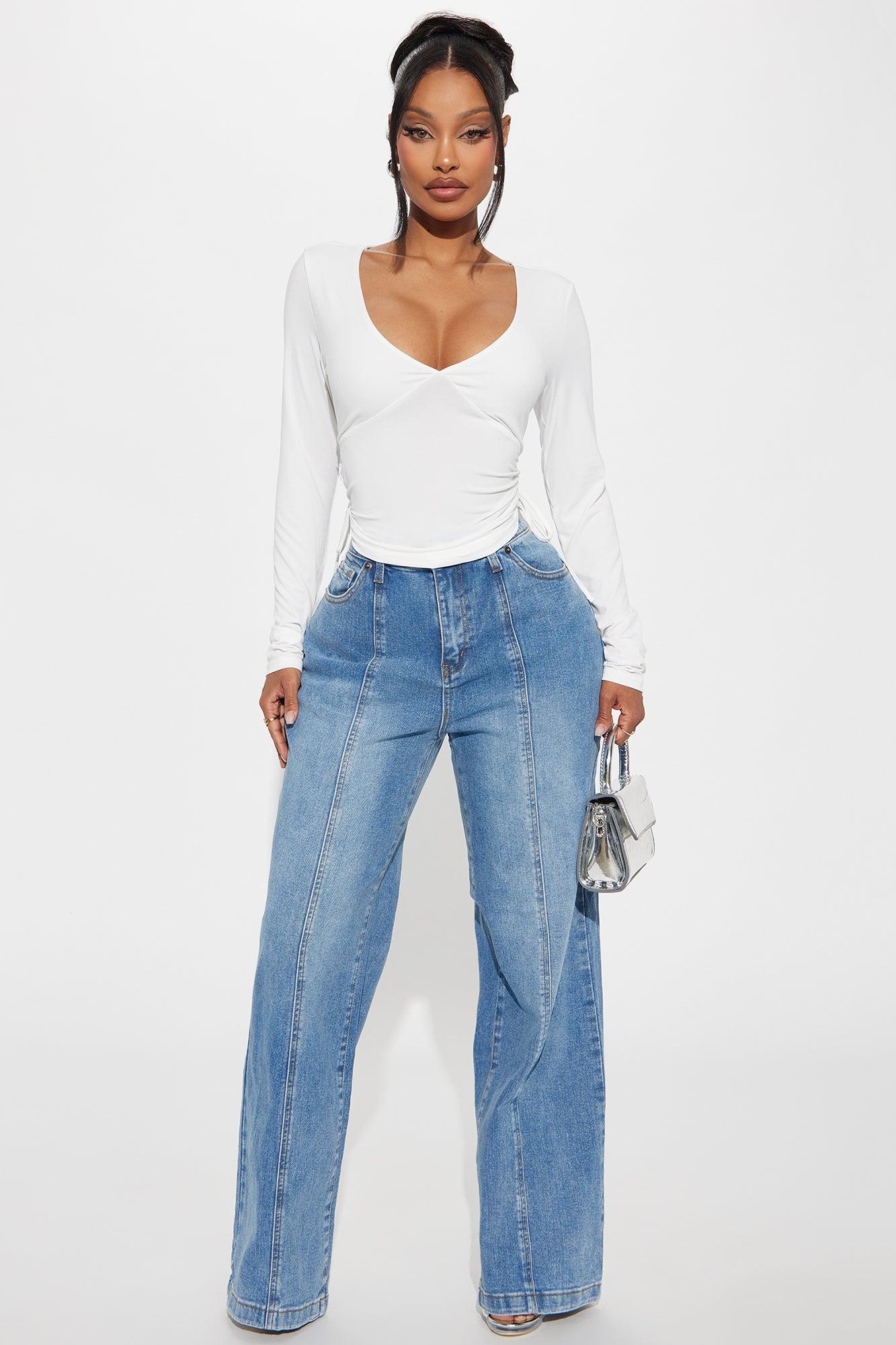 Available In Black, White, And Red. Long Sleeve Top Deep V Neck Ruched Tie Side Detail Tie Back Open Back Cropped Stretch 95% Polyester 5% Spandex Imported