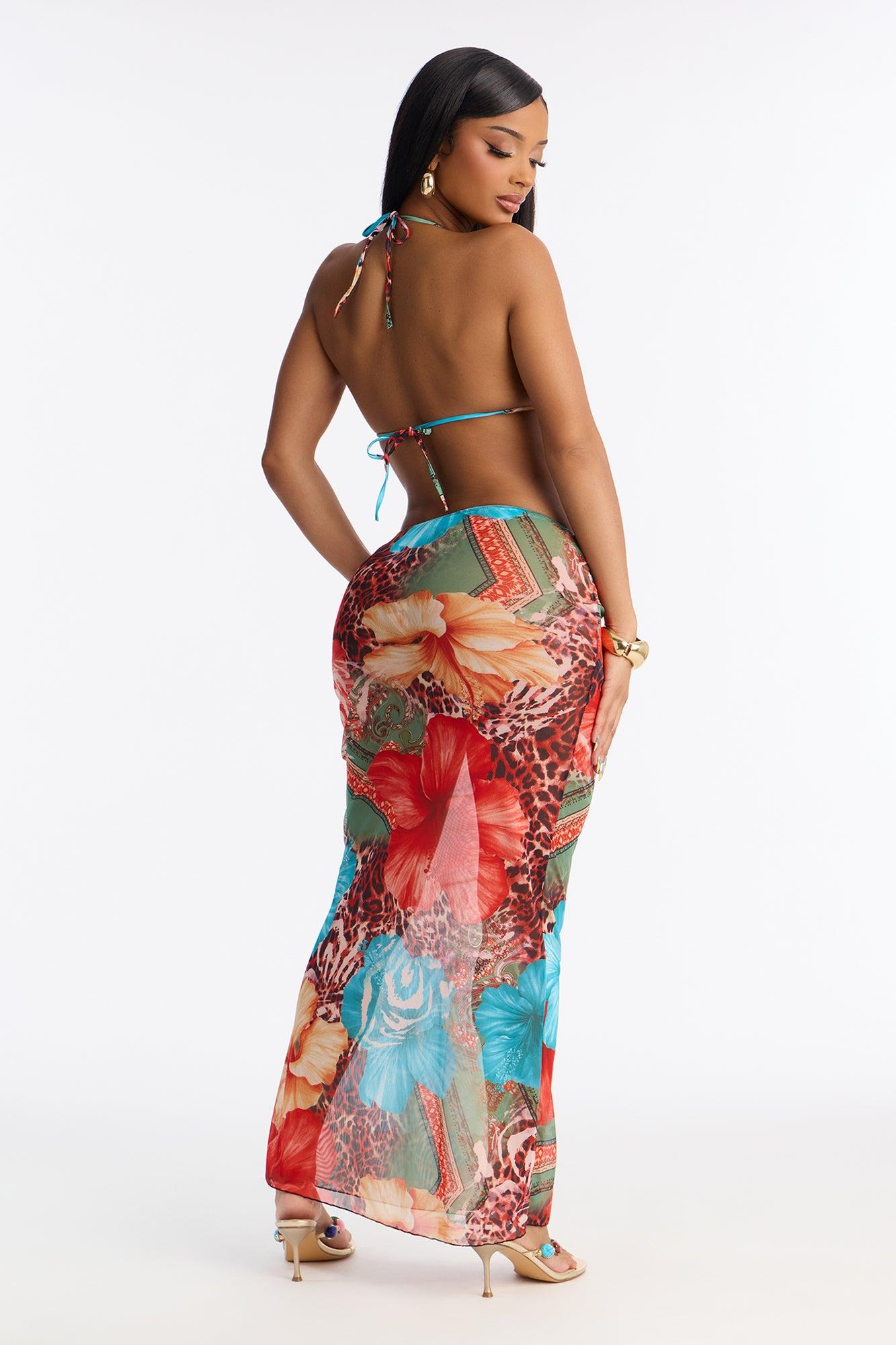 Available In Blue/combo. 3 Piece Bikini Set Mixed Animal & Flower Print Triangle Bikini Top Removable Cups Hardware Cheeky Side Tie Bikini Bottoms Maxi Length Matching Cover Up Skirt Sheer Mesh Final Sale Disclaimer: Print Placement Will Vary Shell: 82% Polyester 18% Spandex Lining: 82% Polyester 18% Spandex Cover Up: 95% Polyester 5% Spandex Imported