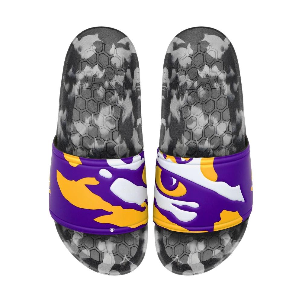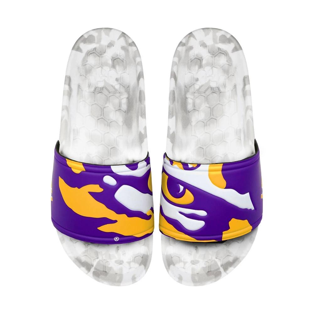 How to choose your size Our sizing buttons list the Mens size first (M) and the equivalent Womens size second (W) Ex. If you usually wear a Womens size 9, select the button with M 7.0 / W 9.0 Product Features Synthetic upper strap with team-repping details is made to stretch just right on your foot Adjustable hook-and-loop straps for a personalized fit Incredibly soft insoles with a captivating pattern Rigorously tested to ensure a premium feel and fit Rubber outsole with repeating logos so you can leave your mark everywhere you go, while also keeping you steady on a variety of surfaces The Hype Co. LSU Tigers College Slydr Pro Slide Sandals are imported. Go Tigers! The Hype Co. LSU Tigers College Slydr Pro Slide Sandals let you rep your team to the fullest, featuring official team detailing on the strap and a plush footbed so you can comfortably sport your team colors. Built with durable rubber outsoles meant to last from the tailgate through the post-game bonfire, these sandals will endure season after season. Size: 8.0. Color: White/Purple. Gender: unisex. Age Group: adult. Hype Co. LSU Tigers College Slydr Pro Slide Sandals in White/Purple/White Size 8.0